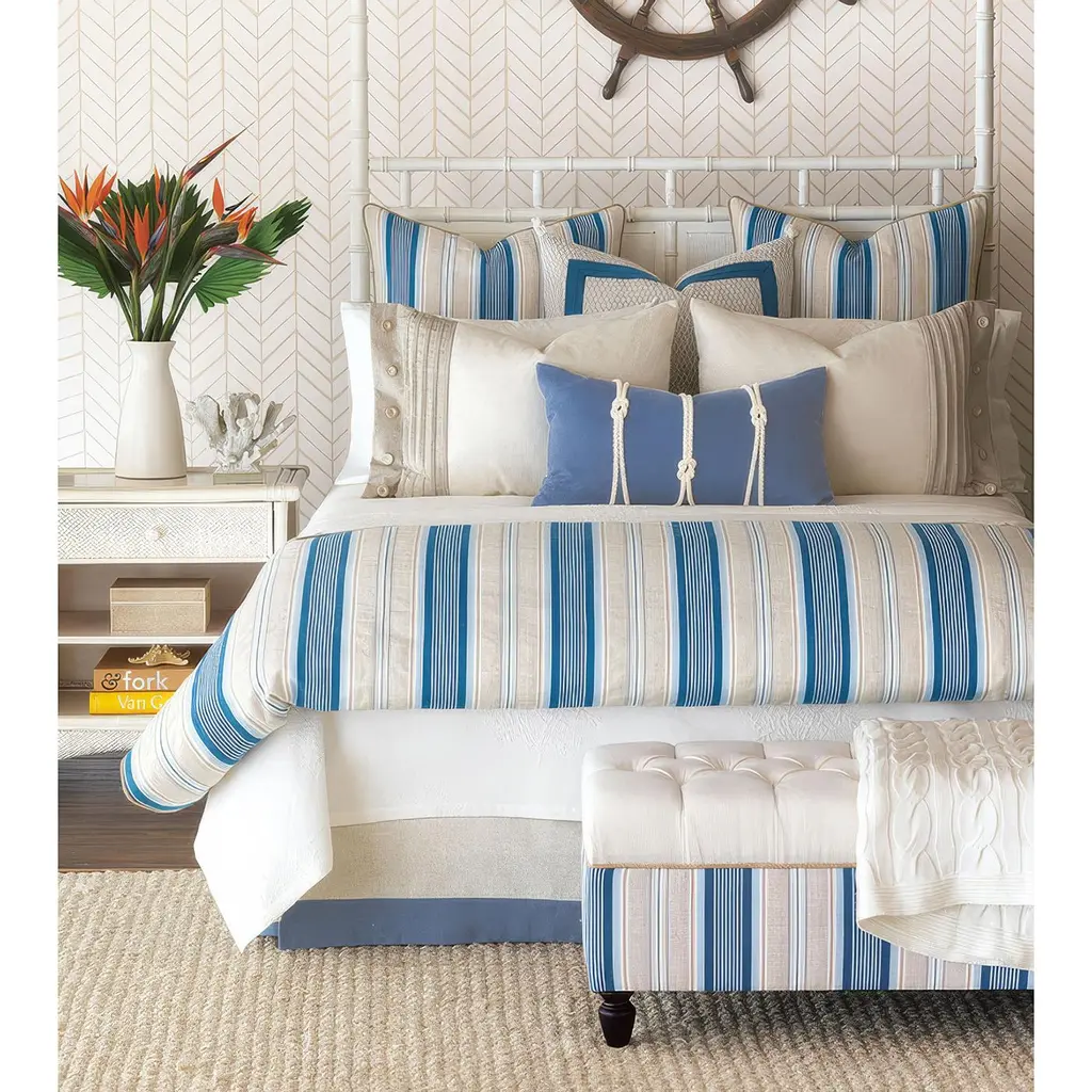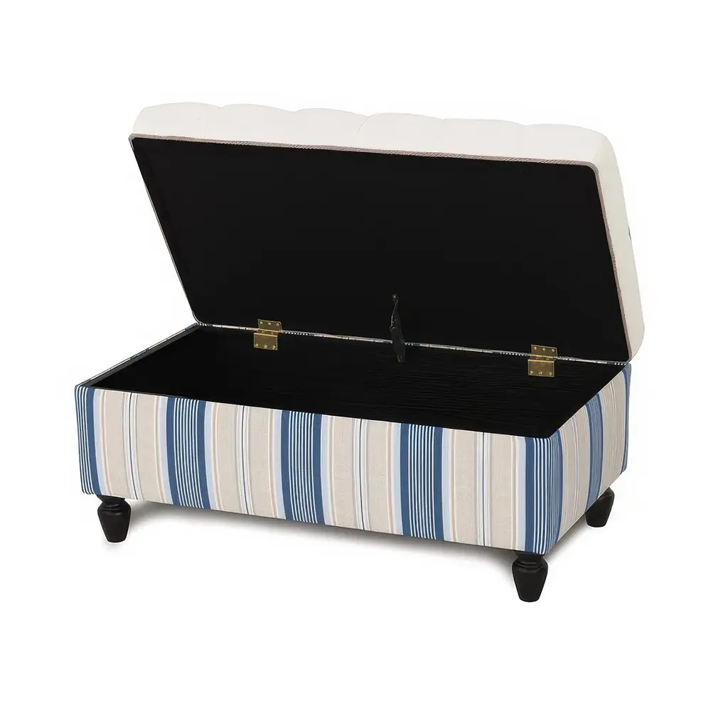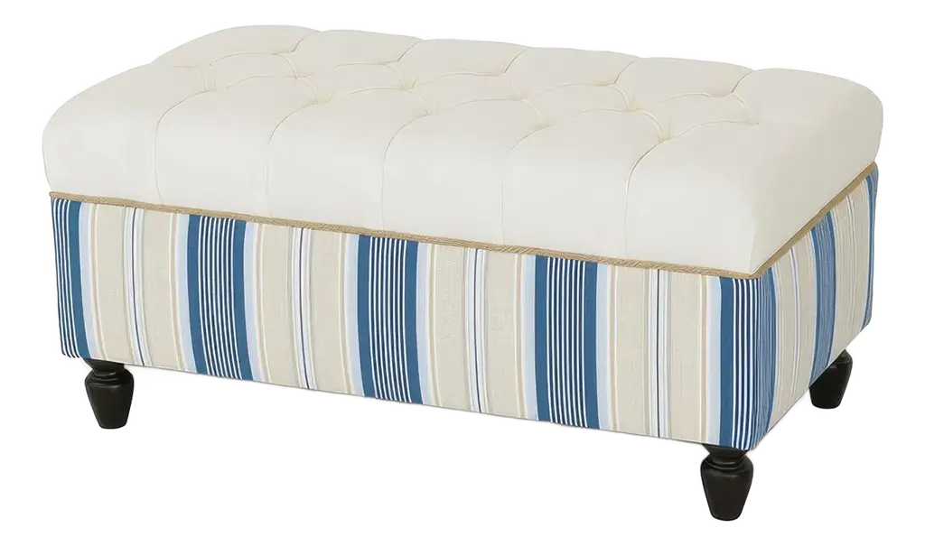 Blending coastal charm with function. The plush, deep-tufted ivory cushion contrasts elegantly with the striped upholstered base, detailed with a refined cord trim. Handcrafted in the USA, this bench-made piece provides both seating and hidden storage. Built on a solid wood frame with a rich Espresso finish, it features a spacious storage compartment, high-density foam for durability, and safety hinges for secure closure. Espresso-finished legs with felt-padded glides protect floors, making it a stylish and practical addition to any room. Dimensions: 37" W x 20" D x 18" H