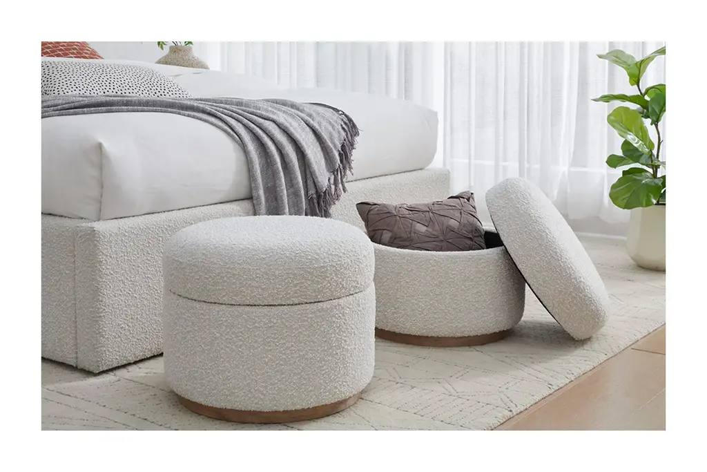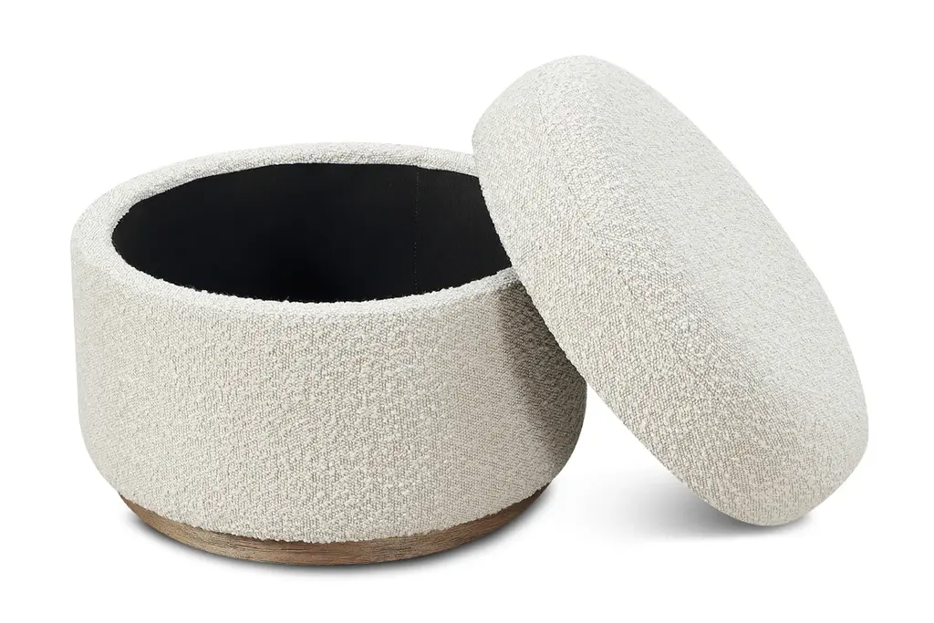 Orion Ottoman – Off-White Boucle with Storage – The Orion Ottoman (20"w x 20"d x 16"h) is a multifunctional accent piece designed for modern living. Upholstered in soft off-white boucle, it features hidden interior storage (13.75"d x 9.5"h) lined with durable black non-woven fabric, perfect for organizing remotes, pillows, or other essentials. A lightly wire-brushed solid wood base in a medium brown finish adds warmth, while non-marking nylon glides protect floors. Use as a stylish footrest, extra seating, or compact storage solution in any contemporary space.