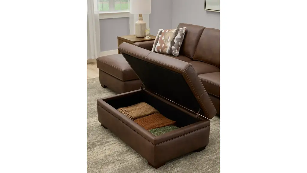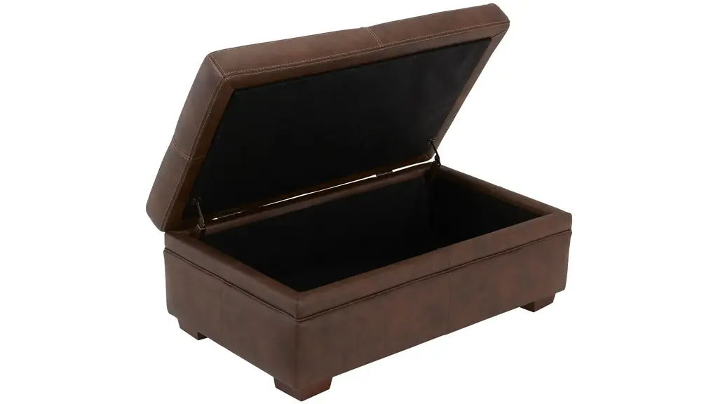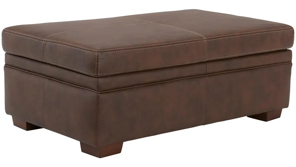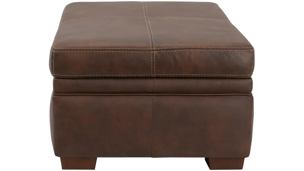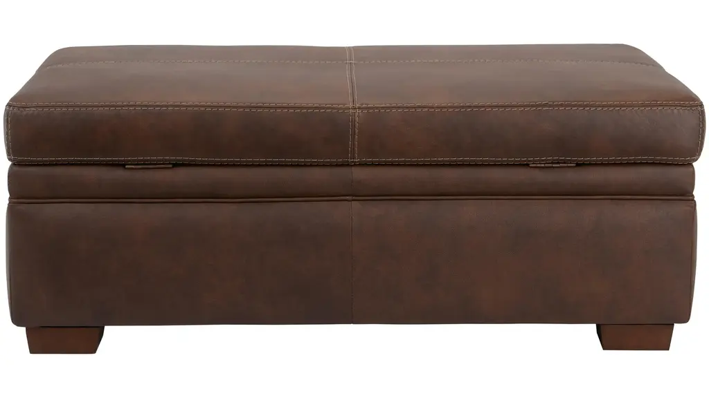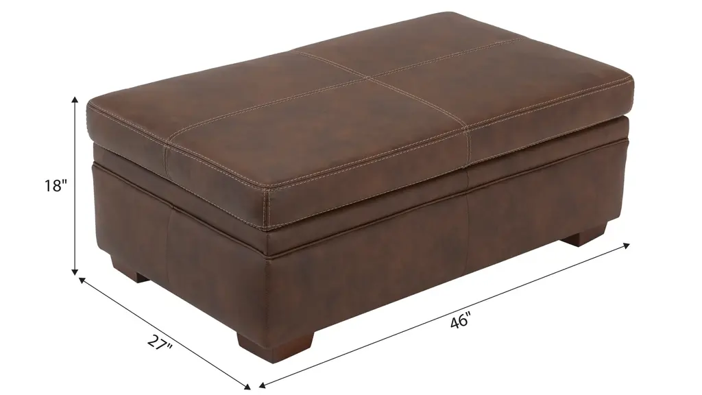 Tuck away clutter in style with the rustic-chic Quinton Storage Ottoman. Upholstered in rich leather with contrast stitching, it brings timeless character to your space while offering hidden storage inside. The plush, cushioned top doubles as extra seating or a footrest, making it as practical as it is inviting.