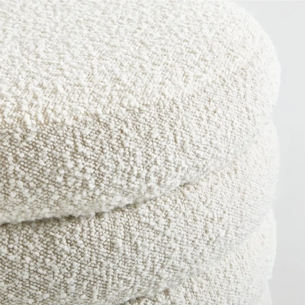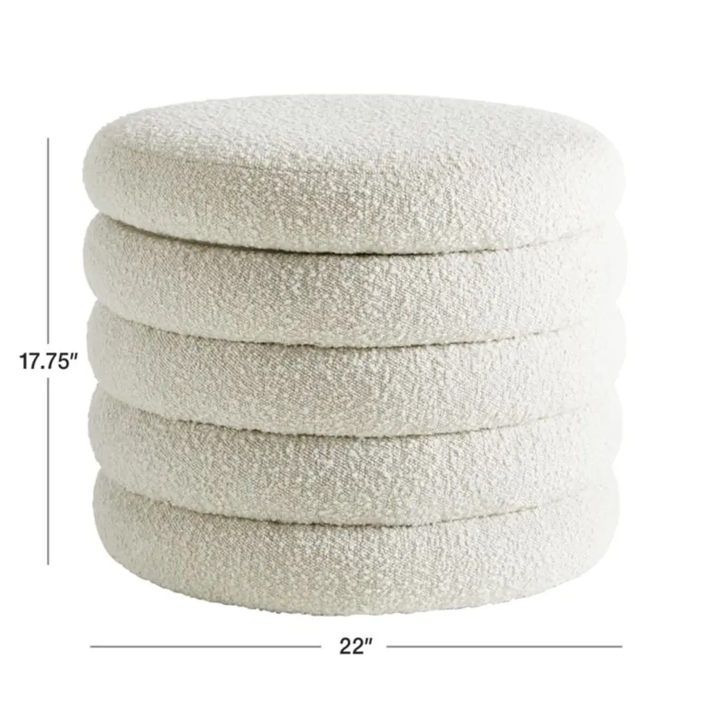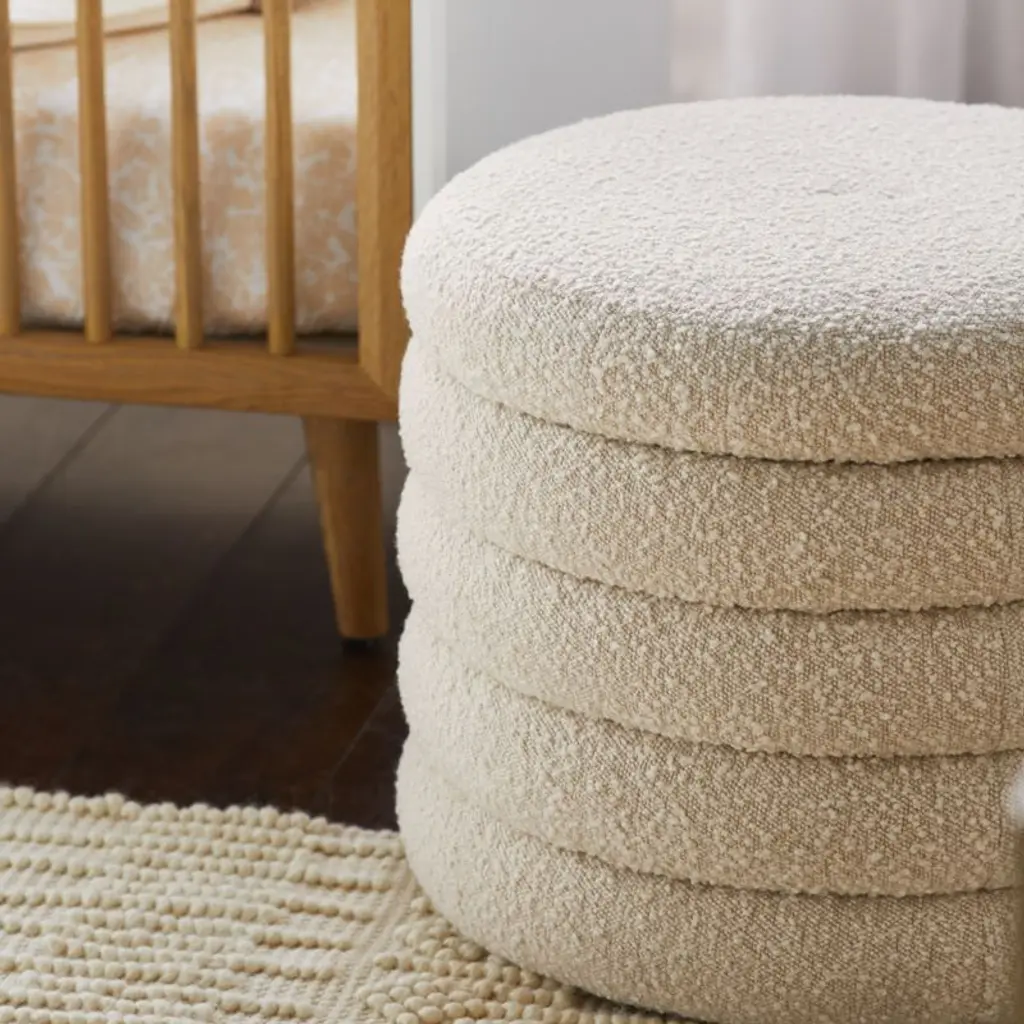Store favorite toys and beloved blankies in style with this storage ottoman designed by Leanne Ford. Crafted with exaggeratedly deep channels for a playful stacked look, the versatile piece offers extra seating, hidden storage and a place to rest tired feet. Upholstered in family-friendly, irresistibly nubby boucle, the cream ottoman opens easily with a lift-off top. To create a snuggly spot for reading, feeding and rocking to sleep, pair the Snoozer Cream Storage Ottoman with the coordinating glider.Star designer and mom Leanne Ford brought her cool, casual style to our new collection for kids (and parents) who love to create, play and make magic together.