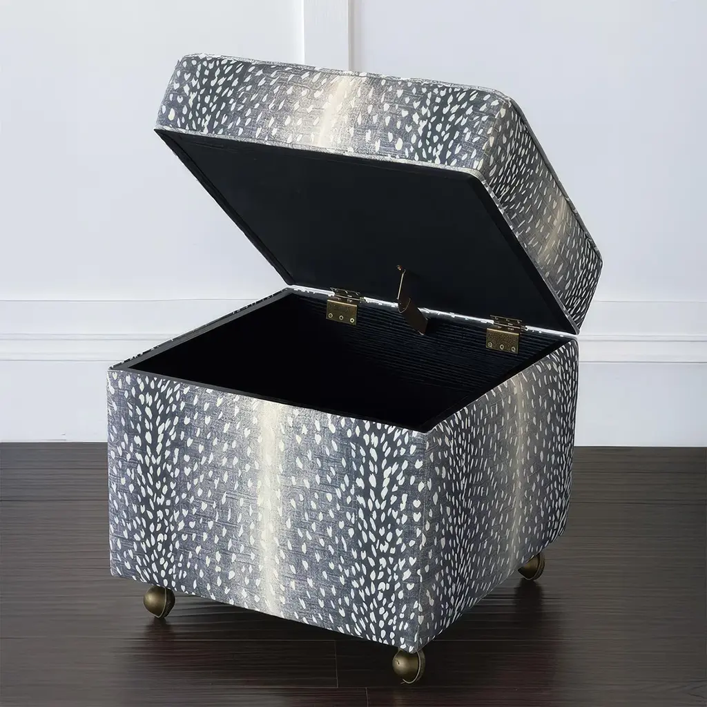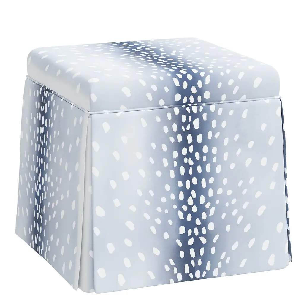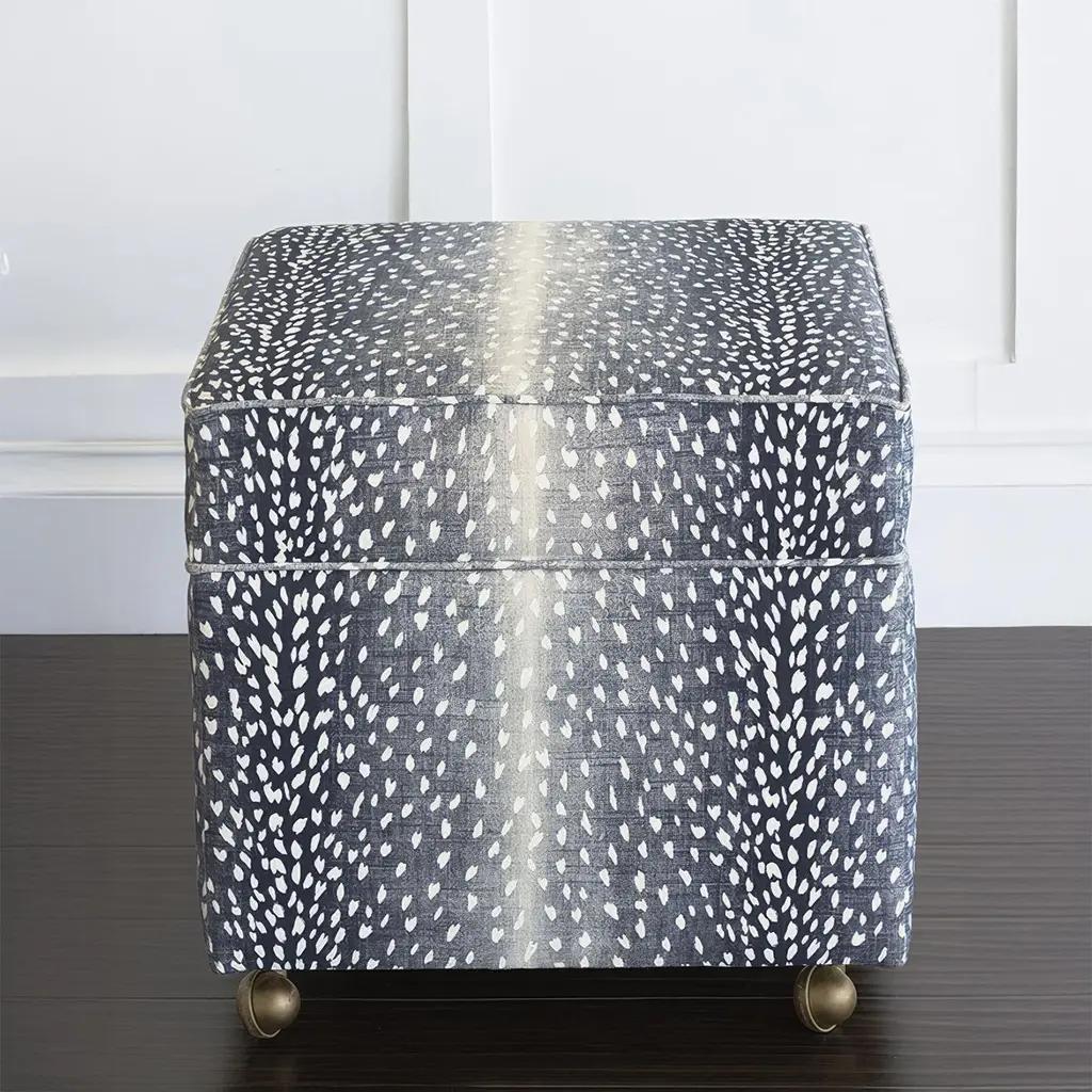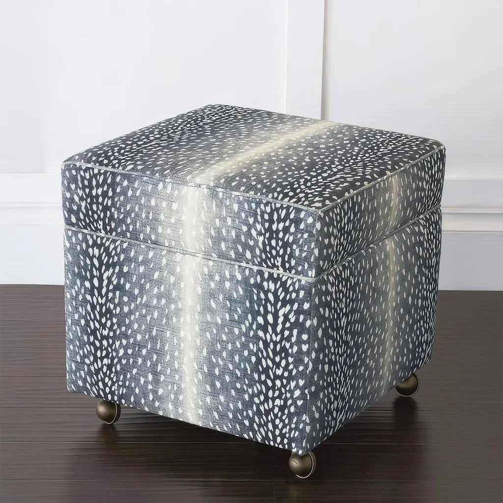 Made in the USA, this compact ottoman is thickly padded and tightly upholstered in a striking ombre navy fawn print, offering a chic yet nature-inspired aesthetic. Designed at an ideal vanity height, it provides both comfort and versatility in any space. Beneath its plush seat lies a discreet, solid wood storage area finished in a rich Espresso stain, perfect for keeping essentials close at hand. The ottoman is elevated on smooth-rolling matte brass casters, blending traditional craftsmanship with modern mobility. Whether used as a stylish footrest, extra seating, or a hidden storage solution, this piece seamlessly enhances both contemporary and transitional interiors with its timeless appeal. Dimensions: 19.5" W x 19.5" D x 20" H Made in the USA. Lead time is 6 weeks.