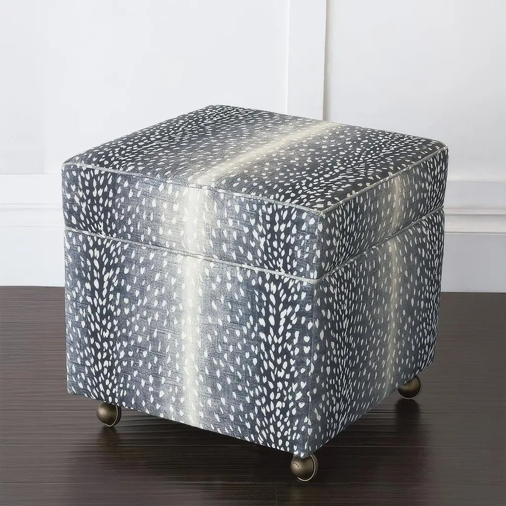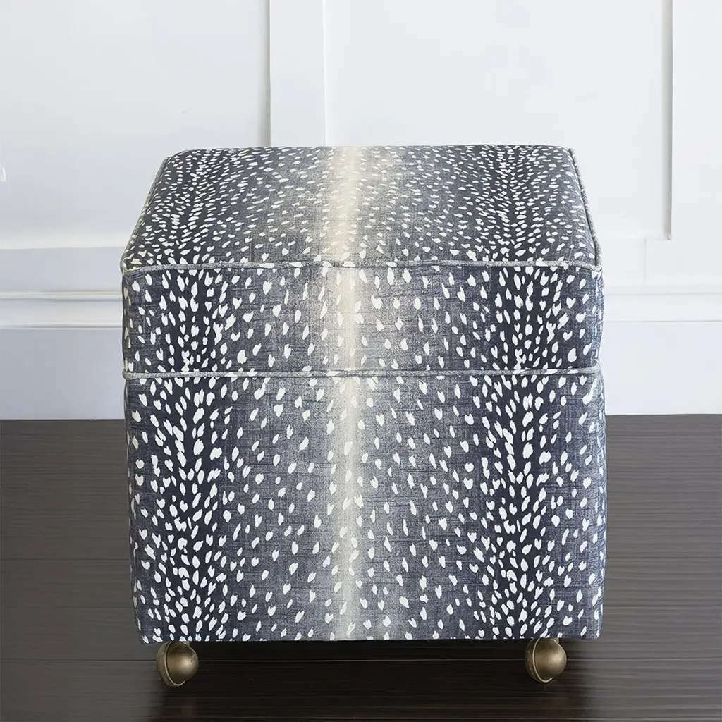 Made in the USA, this compact ottoman is thickly padded and tightly upholstered in a striking ombre navy fawn print, offering a chic yet nature-inspired aesthetic. Designed at an ideal vanity height, it provides both comfort and versatility in any space.Beneath its plush seat lies a discreet, solid wood storage area finished in a rich Espresso stain, perfect for keeping essentials close at hand. The ottoman is elevated on smooth-rolling matte brass casters, blending traditional craftsmanship with modern mobility. Whether used as a stylish footrest, extra seating, or a hidden storage solution, this piece seamlessly enhances both contemporary and transitional interiors with its timeless appeal.Dimensions: 19.5" W x 19.5" D x 20" HMade in the USA.Lead time is 6 weeks.