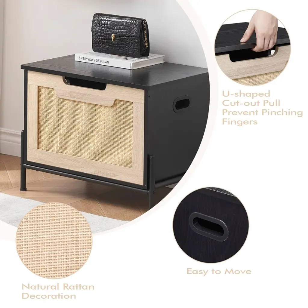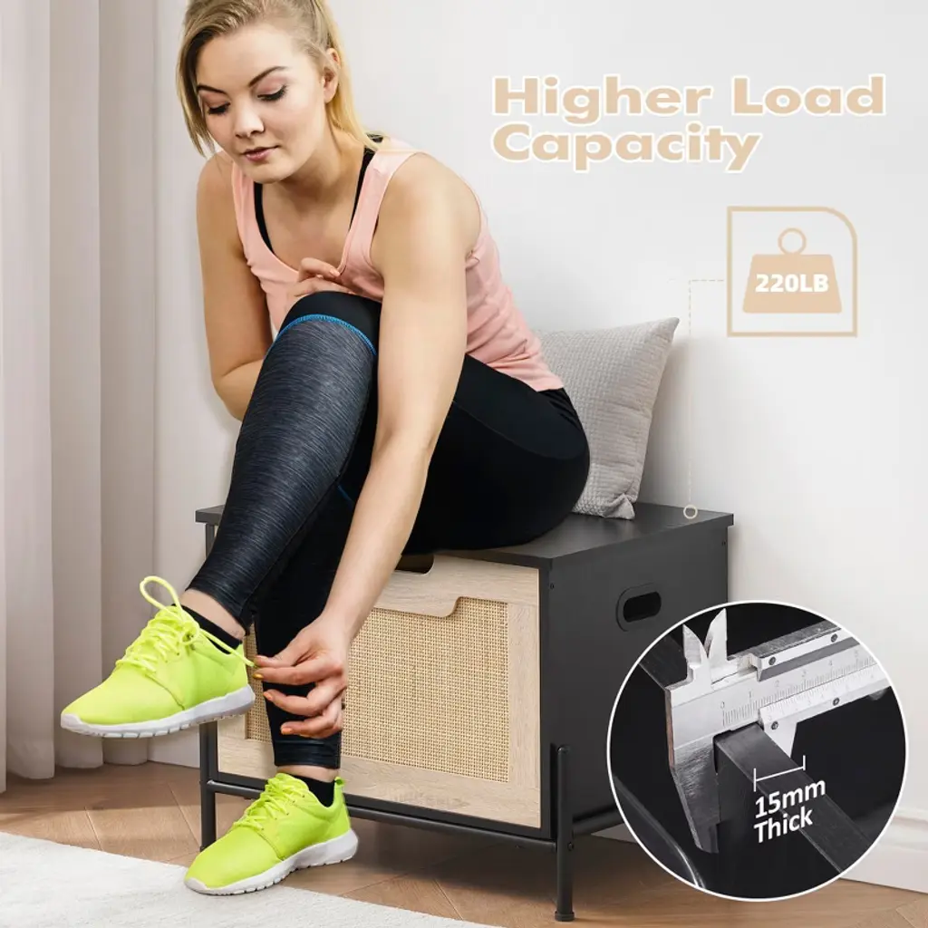 1. Space-Saving Multifunctional Design 4-in-1 Utility: Seamlessly transitions between footrest, seating, side table, and hidden storage¡ªideal for stowing blankets, toys, books, or clutter35. Foldable Construction: Collapses flat when not in use, maximizing space efficiency in dorms, apartments, or under beds5. Large Capacity: 23.6"W x 18.1"H interior accommodates bulky items like winter quilts or multiple pillows9. 2. Heavy-Duty Rattan & Wood Build Industrial-Grade Frame: Reinforced MDF panels + metal corner braces support 220 lbs (tested for static weight), outperforming fabric ottomans59. All-Season Rattan: UV-treated, water-resistant weaving resists cracking, dust, and humidity¡ªwipe clean with a damp cloth24. Anti-Skid Base: Rubber feet protect floors and prevent slipping during use8. 3. Modern Farmhouse Aesthetic Design Fusion: Black stained wood legs contrast with warm yellow rattan panels, blending rustic charm with contemporary minimalism49. Low-Profile Silhouette: Height (18.1") aligns with standard sofas/beds for ergonomic foot support or tabletop use3. Breathable Texture: Open-weave rattan promotes airflow, reducing moisture buildup in stored items4. 4. Compact & Room-Adaptable Small-Space Optimized: Fits snugly beside armchairs, under windows, at bed ends, or in entryways without crowding35. Multi-Room Ready: Neutral styling complements living rooms, bedrooms, dorms, patios, or reading nooks9. Instant Surface: Flat rattan top holds drinks, plants, or decor without requiring trays6. 5. Effortless Setup & Care Tool-Free Assembly: Ships pre-assembled or with snap-lock joints¡ªready in ¡Ü5 minutes5. Low Maintenance: Spot-clean rattan with mild soap; wood handles polish with furniture wax annually2. Durable Finish: Scratch-resistant coating preserves color against sun exposure or pet claws4.
