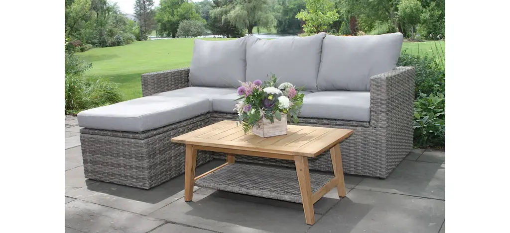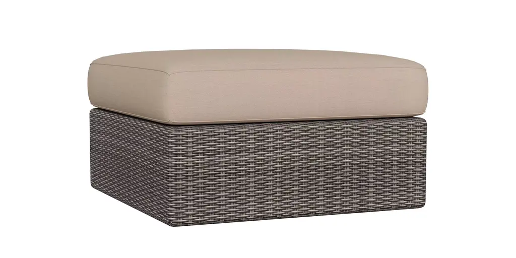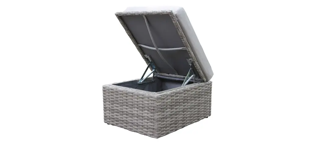 Optimize your seating group with the functional Teak and Wicker Storage Ottoman. This footstool is made with HDPE all-weather wicker handwoven around powder-coated aluminum frames. The stool opens up to provide waterproof storage for the cushion.