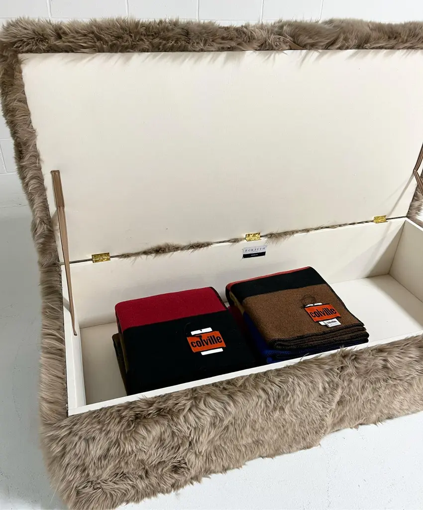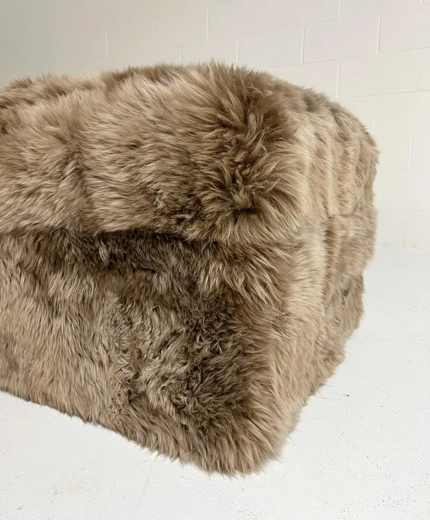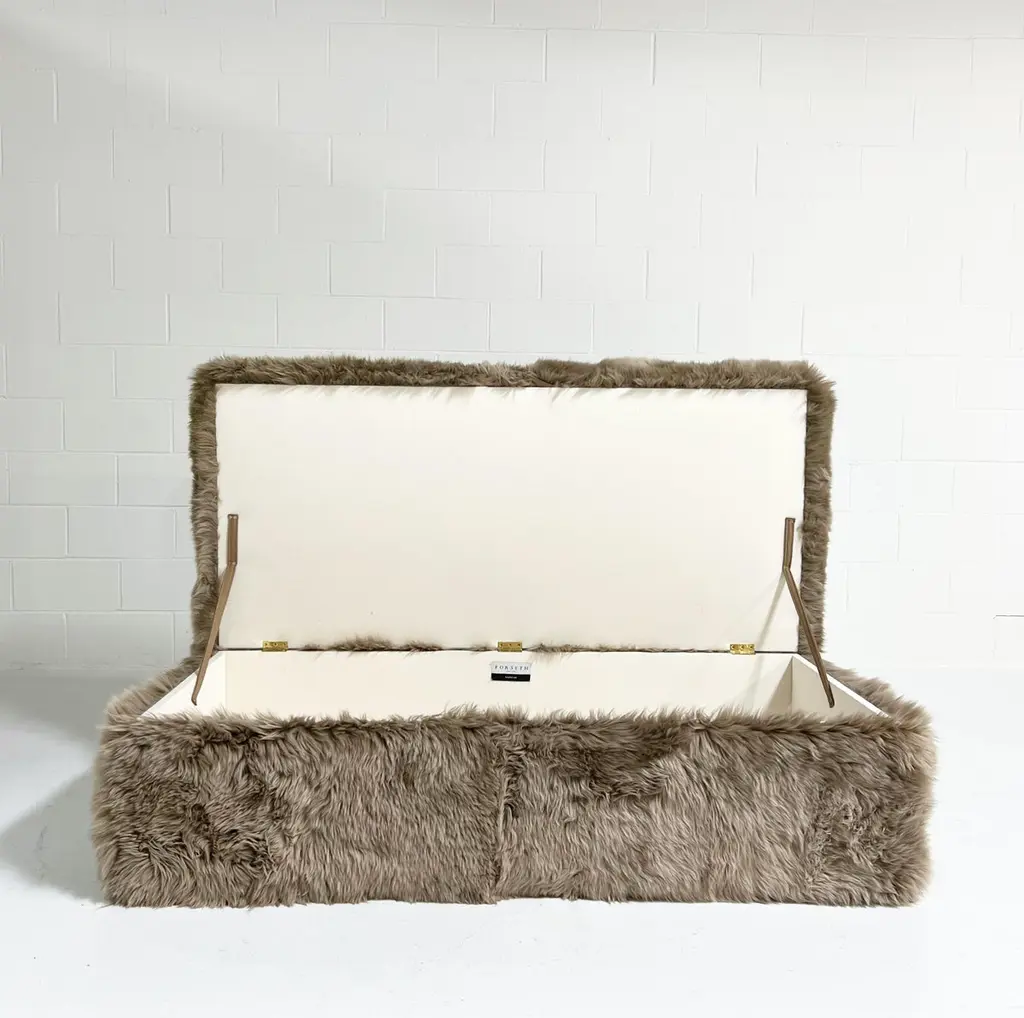 Part of the Forsyth Ottoman Collection. Soft and luxurious, the Forsyth Large Storage Ottoman is designed to be a versatile piece in a room adding an element of natural texture. The perfect coffee table, ottoman, or extra seating. Each ottoman is completely handmade by our amazing team of master upholsterers. Lift the lid with an attached leather strap to find ample storage space inside for extra blankets, toys, you name it. The inside storage space is finished with a beautiful ivory cotton canvas.Custom made to order. Please allow 10-12 weeks. Also note, the ottoman can be made completely bespoke to meet your design needs. If you are interested in a different size or color for your space, just ask - we can custom make any size you need in a variety of colors and materials. Example shown is the Forsyth New Zealand Sheepskin in smokey taupe colorway.