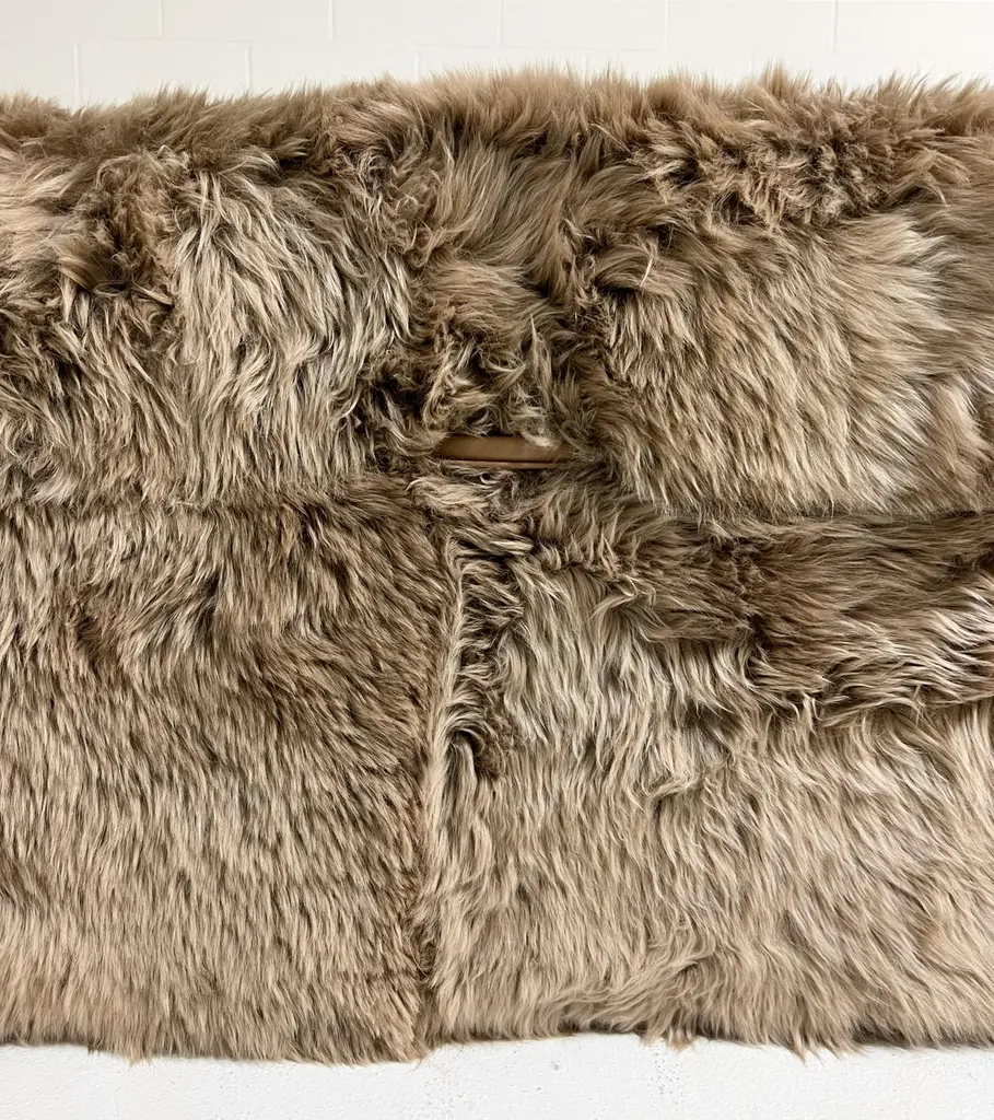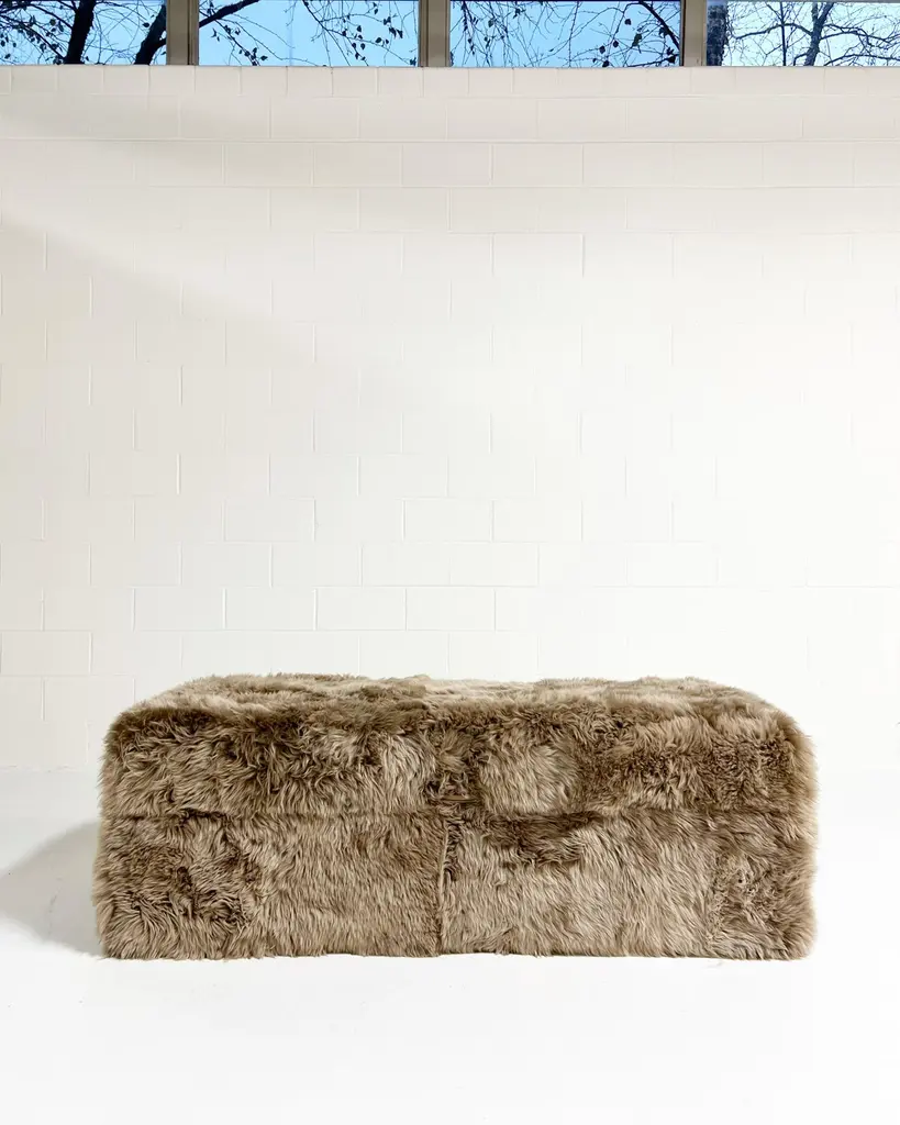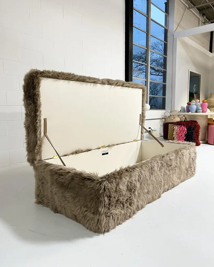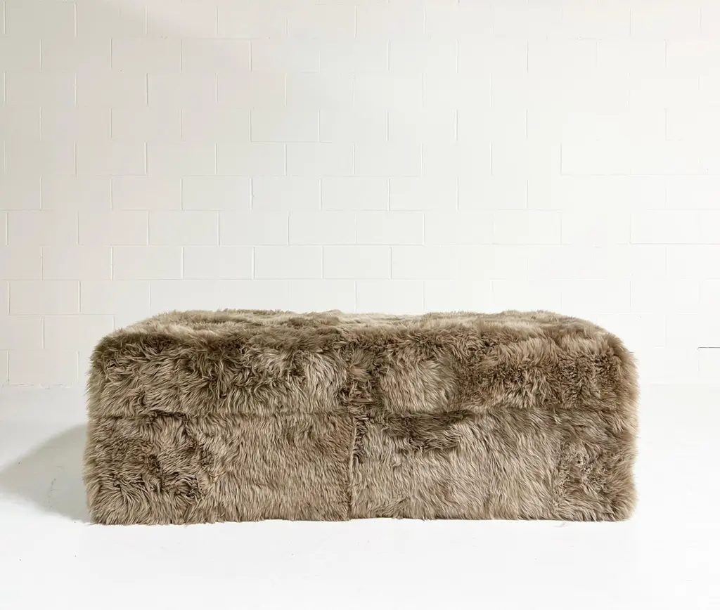 Part of the Forsyth Ottoman Collection. Soft and luxurious, the Forsyth Large Storage Ottoman is designed to be a versatile piece in a room adding an element of natural texture. The perfect coffee table, ottoman, or extra seating. Each ottoman is completely handmade by our amazing team of master upholsterers. Lift the lid with an attached leather strap to find ample storage space inside for extra blankets, toys, you name it. The inside storage space is finished with a beautiful ivory cotton canvas.Custom made to order. Please allow 10-12 weeks. Also note, the ottoman can be made completely bespoke to meet your design needs. If you are interested in a different size or color for your space, just ask - we can custom make any size you need in a variety of colors and materials. Example shown is the Forsyth New Zealand Sheepskin in smokey taupe colorway.