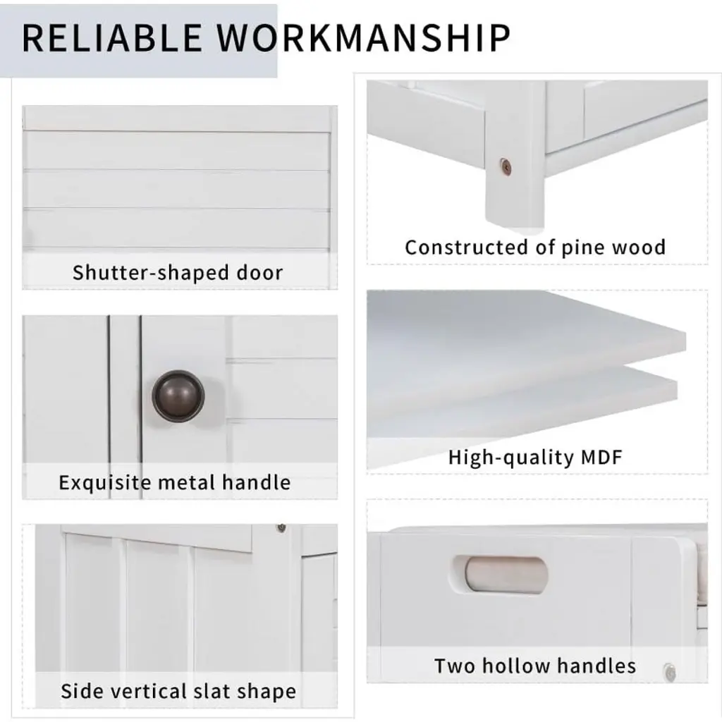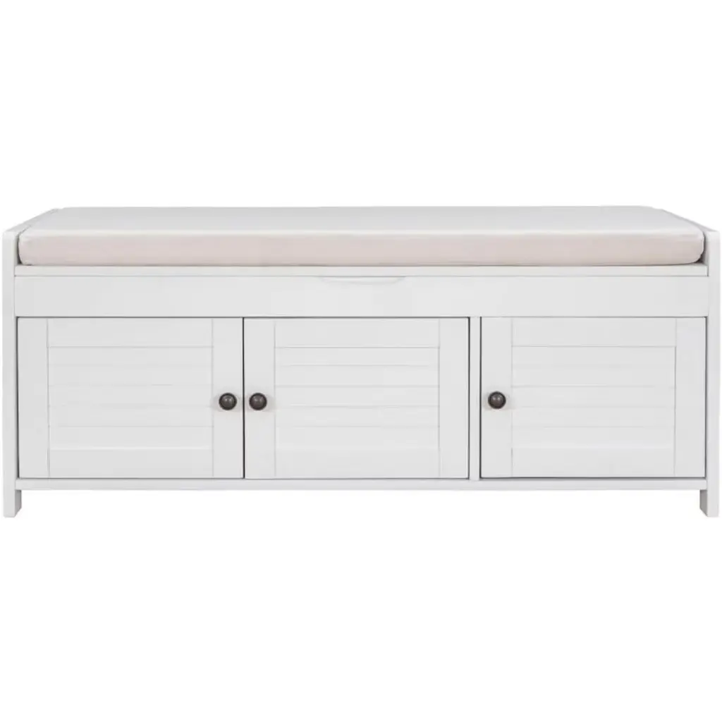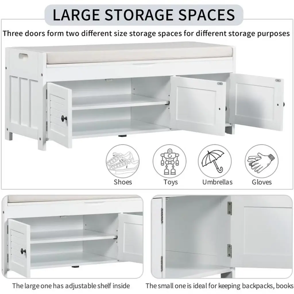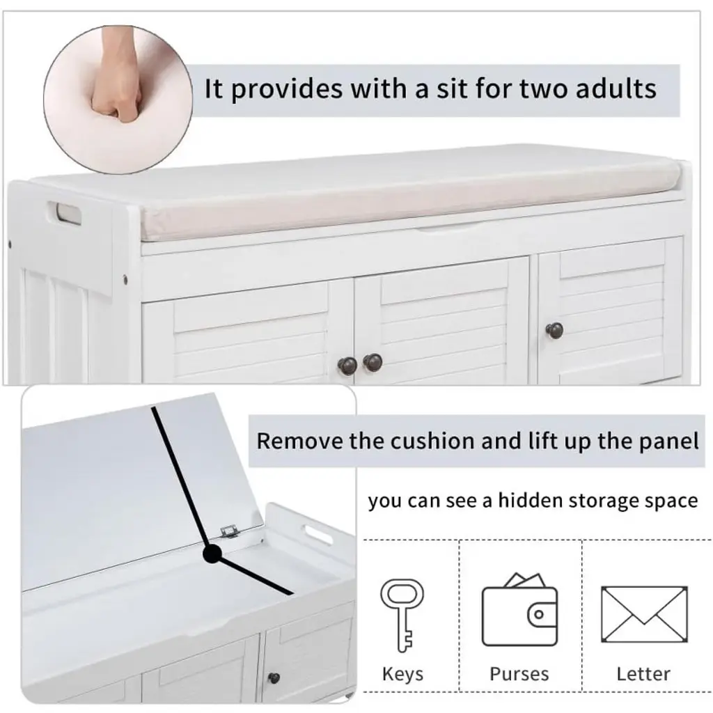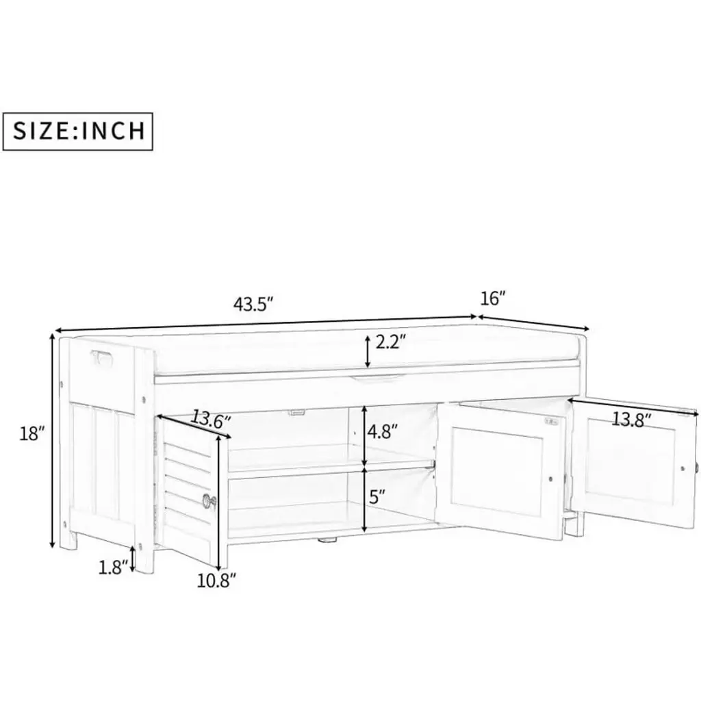 Product DescriptionThis rustic storage bench combines style and function with its unique louvered doors, elegant metal handles, and vertical slat sides for a touch of charm. Made from pine and quality MDF, it offers lasting durability and a vintage look. The bench features two spacious compartments behind three doors—one with adjustable shelves for flexible organization. Perfect for storing shoes, books, or backpacks, it also includes a hidden storage area under the seat. Measuring 43.5" L x 16" W x 18" H, it’s an ideal multi-functional piece for entryways, bedrooms, or living rooms. Assembly instructions included.Product InformationColor: White/BlueMaterial: WoodFrame Material: PineStyle: RusticItem Weight: 57.8 poundsProduct Dimensions: 47.64"D x 18.9"W x 9.45"HFabric Type: PineWeight Capacity: Seat: 155 LBS Drawer: 55 LBSProduct Care Instructions: Wipe with Dry Cloth