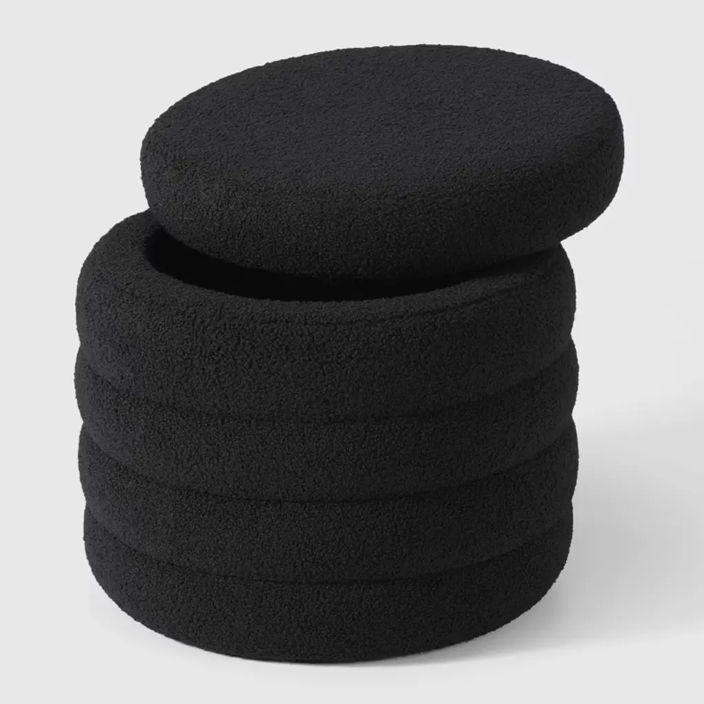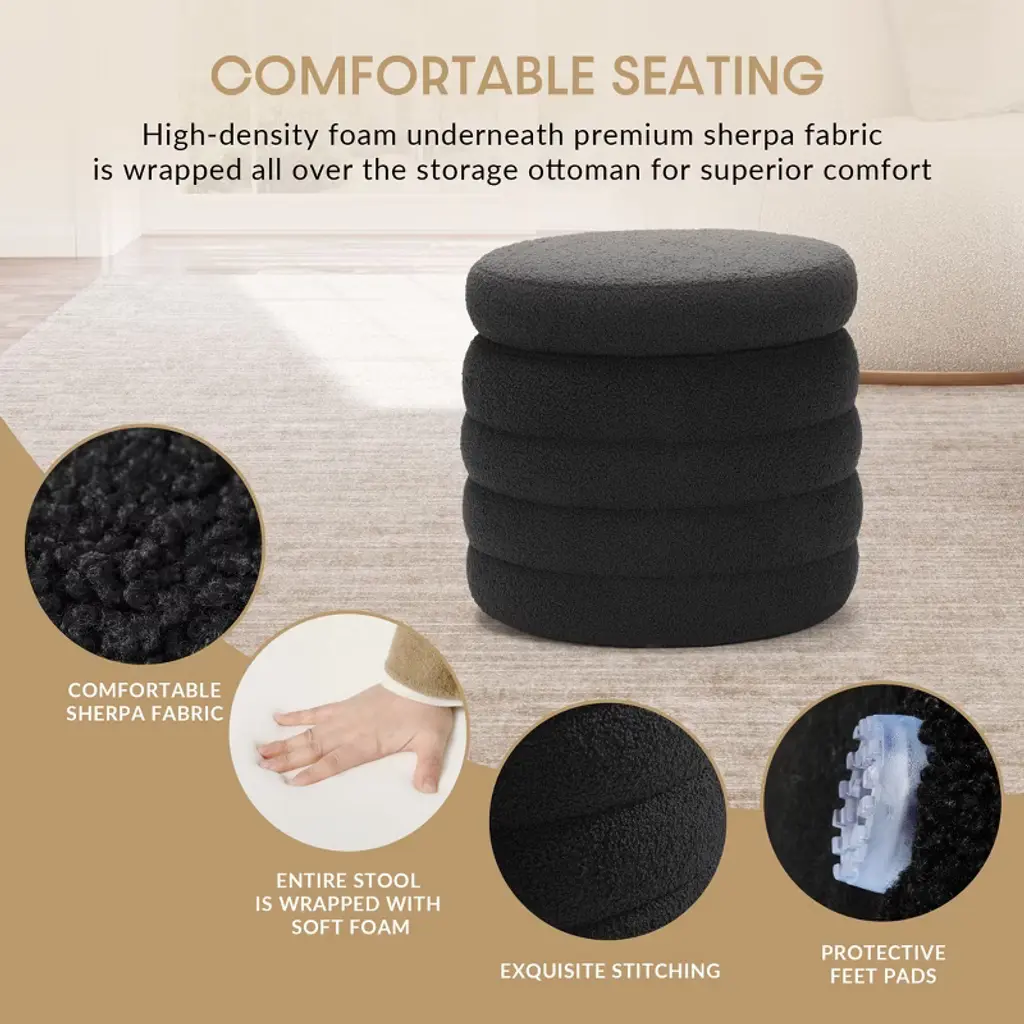Elevate your living space with this versatile round Shearling ottoman, featuring ample storage for toys, small blankets, or other essentials. Its compact size makes it ideal for smaller spaces, while the plush, foam-filled lid provides comfortable seating or a convenient footrest. Enjoy the perfect blend of style and functionality with this luxurious small-circle ottoman with storage.FeaturesUpholstered All Around with a Soft Shearling FabricRemovable Lid Top with an Inner Storage Space Dimensions of 12" D x 12" W x 11.5" HConstructed with Solid Plywood for added durabilityMutlifunctional Design Allows you to Use as an Extra Seat and Storage SpaceLightweight and Simple to Move aroundDurable Frame That Can Support Up To 300lbsProtective Foot Pads to Prevent Damage to Your FloorsDetails: Product Type: Ottomans & PoufsDimensions: 17.25" W x 17.25" D x 16" HWeight: 10.5 Lbs.Storage Space Height: 11.5"Weight Capacity: 300 Lbs.