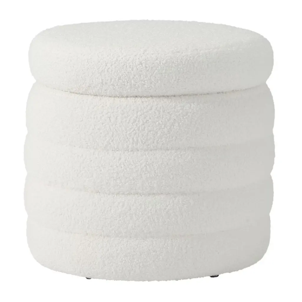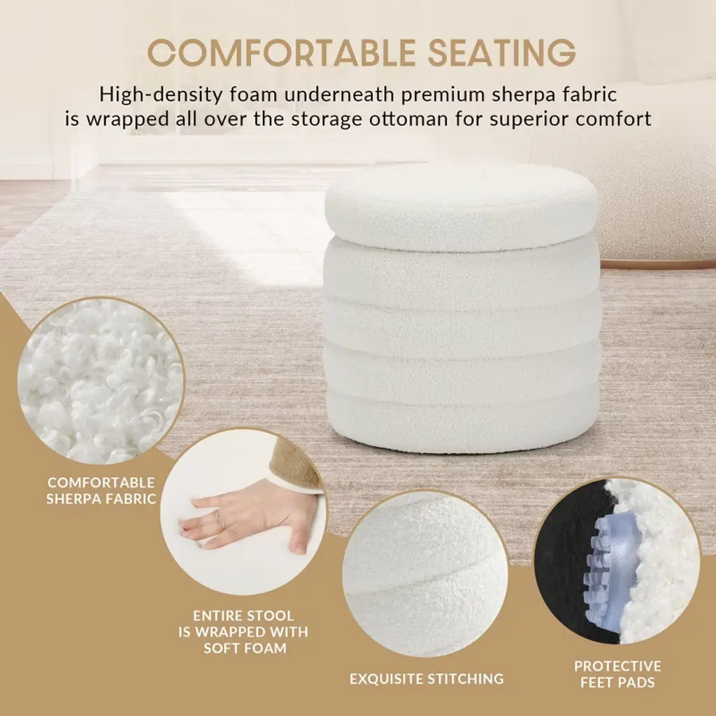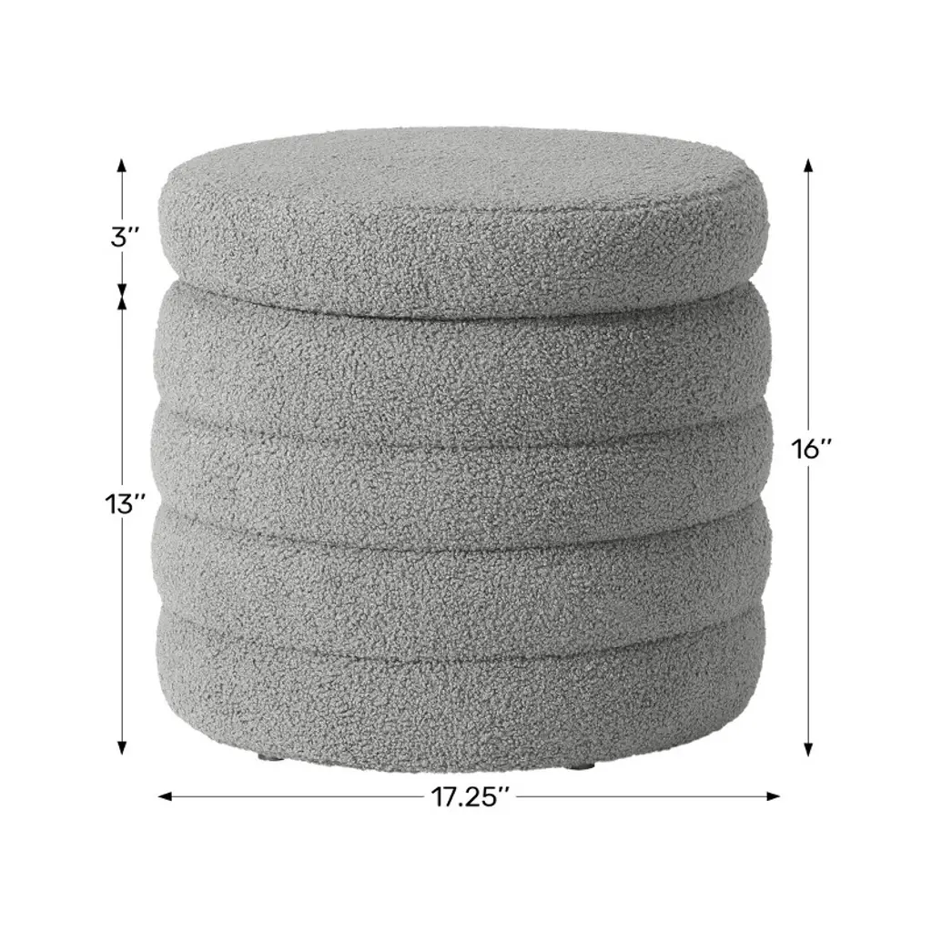 Elevate your living space with this versatile round Shearling ottoman, featuring ample storage for toys, small blankets, or other essentials. Its compact size makes it ideal for smaller spaces, while the plush, foam-filled lid provides comfortable seating or a convenient footrest. Enjoy the perfect blend of style and functionality with this luxurious small-circle ottoman with storage.FeaturesUpholstered All Around with a Soft Shearling FabricRemovable Lid Top with an Inner Storage Space Dimensions of 12" D x 12" W x 11.5" HConstructed with Solid Plywood for added durabilityMutlifunctional Design Allows you to Use as an Extra Seat and Storage SpaceLightweight and Simple to Move aroundDurable Frame That Can Support Up To 300lbsProtective Foot Pads to Prevent Damage to Your FloorsDetails: Product Type: Ottomans & PoufsDimensions: 17.25" W x 17.25" D x 16" HWeight: 10.5 Lbs.Storage Space Height: 11.5"Weight Capacity: 300 Lbs.