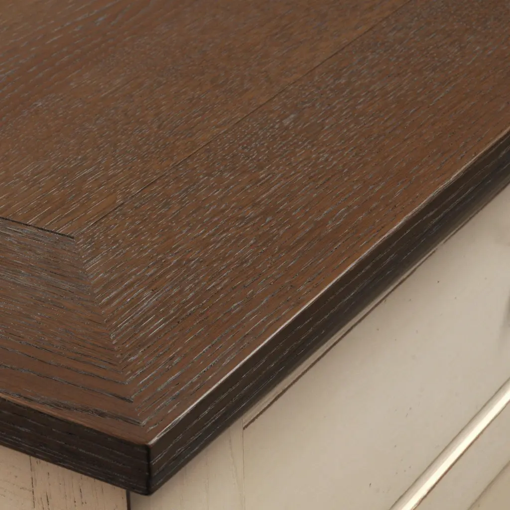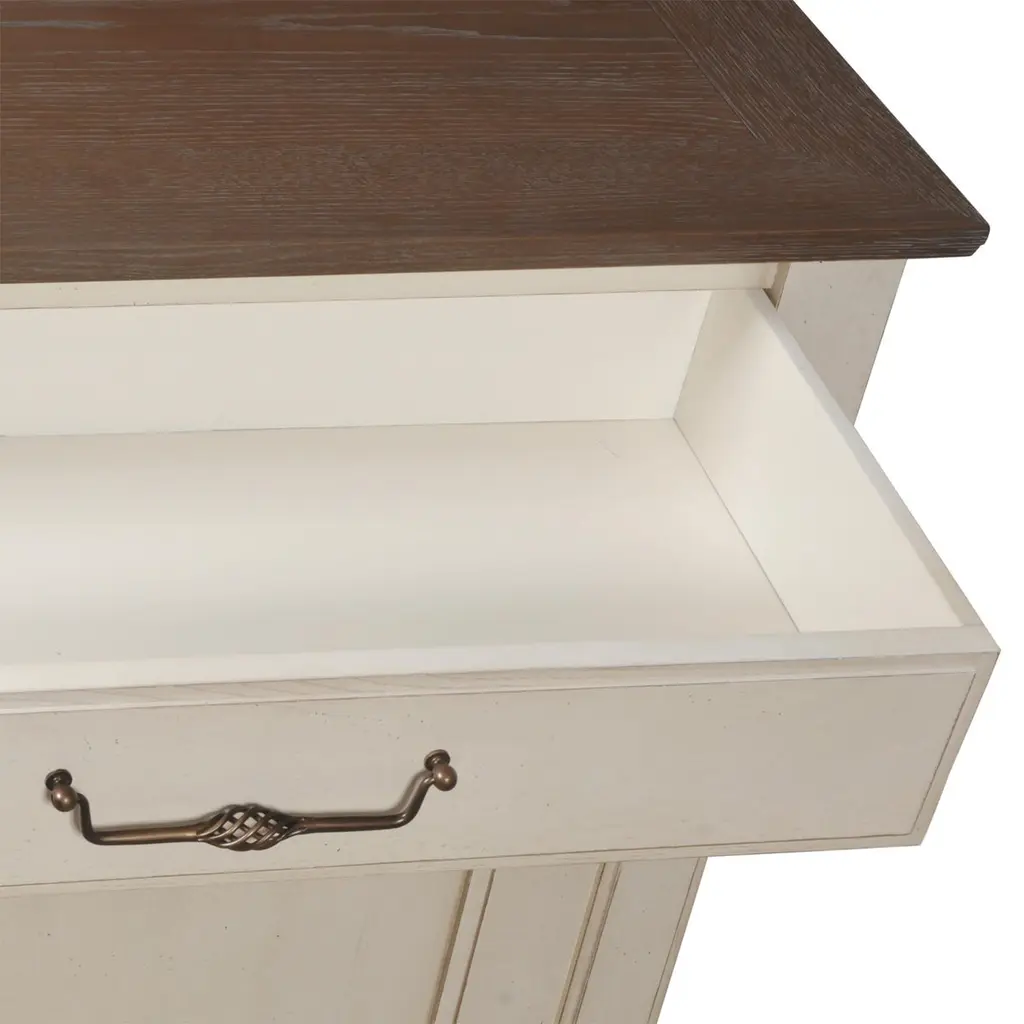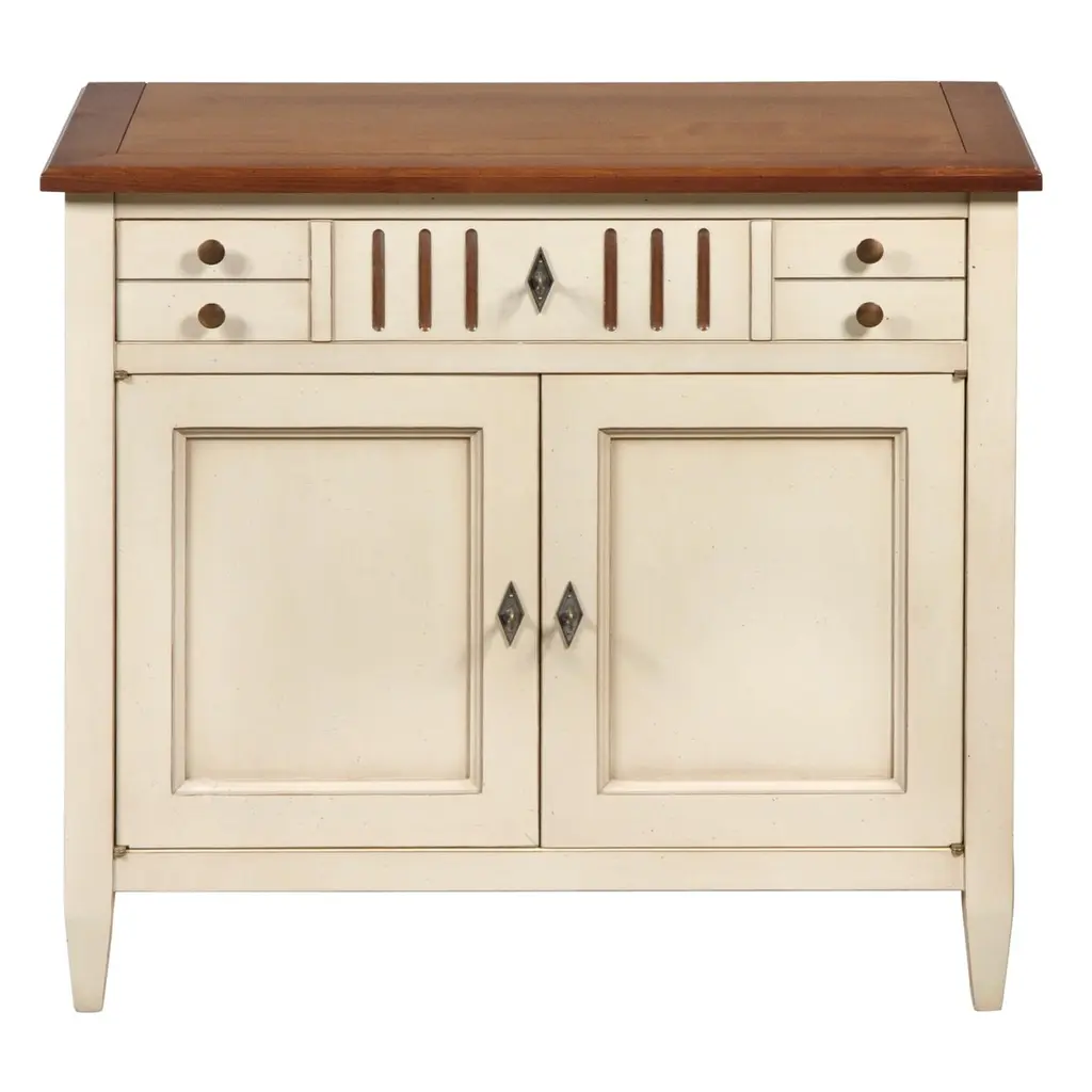 This sideboard belongs to our Rive Gauche Collection, very elegant and full of charm in a typical French countryside classical style. The Top is royal dark brown stained and the rest is white-cream lacquered with a satin varnish. This buffet features 2 large drawers with dovetails mounted fronts and 2 doors with a working lock and key.A vertical divider separates 2 internal storage compartments. A wooden shelf in each storage unit is removable and adjustable on wooden racks . Handles for drawers and entries and keys are in black iron. The solid oak comes exclusively from sustainably managed French forests.Gontier, a brand of MON PETIT MEUBLE FRANCAIS group, provides you exclusively with 100% made in France classical and contemporary pieces of furniture.The manufacture of each furniture is made accordingly to traditional French techniques of woodworking by small craft workshops in the western countryside of France (Loire Valley and Bretagne). We offer a 5 year warranty on each piece.