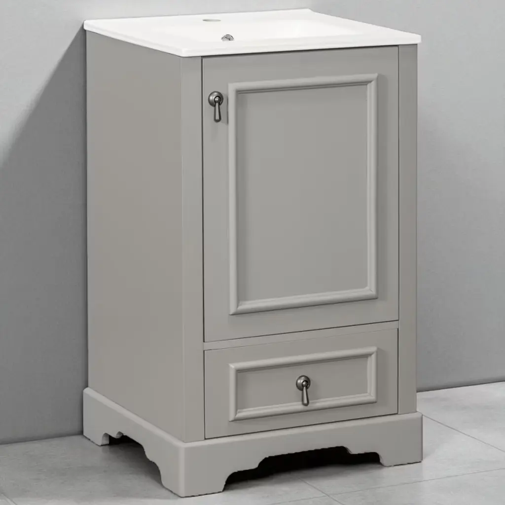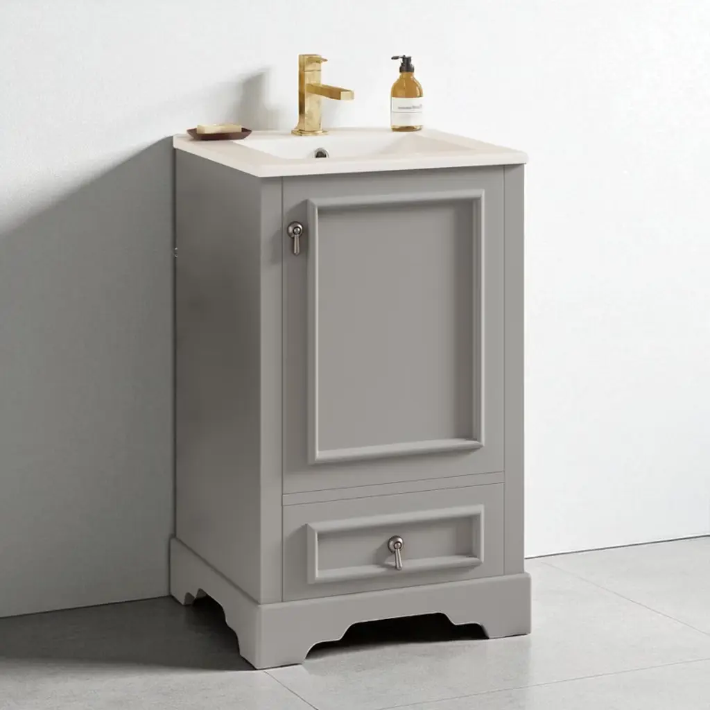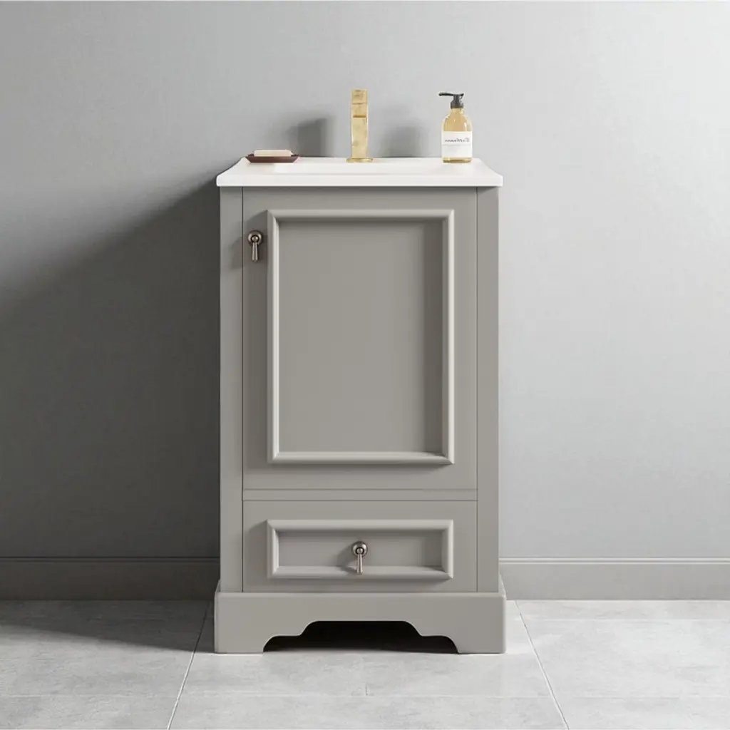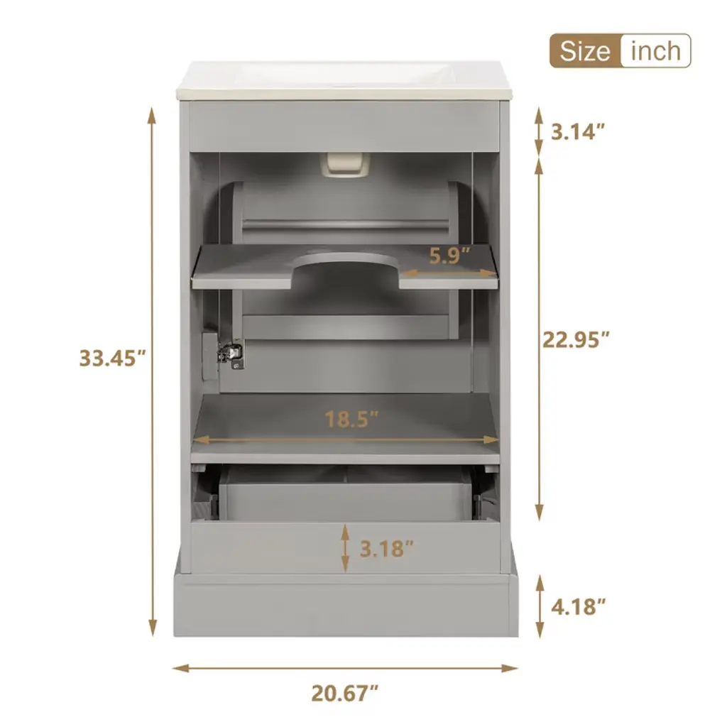 Product Overview Enhance your bathroom with this 20-inch modern freestanding vanity, thoughtfully designed for compact spaces. Featuring a sleek grey finish and a solid wood frame, it brings both durability and contemporary elegance to your home. The easy-to-clean ceramic sink includes an overflow hole and pre-drilled faucet mount, while the interior offers multiple smart storage features such as a compartment drawer, an adjustable U-shaped shelf, and a door-mounted organizer. With its soft-close hinges and noise-reducing design, this vanity delivers comfort, convenience, and a stylish upgrade to any small bathroom. Product Features Space-Saving Design: Measuring 20" W x 18.3" D x 34" H, this compact vanity is perfect for small bathrooms, powder rooms, or guest suites where space is limited.Durable Ceramic Sink: Features a smooth, scratch-resistant ceramic basin with an overflow hole and single pre-drilled faucet mount (faucet not included), ensuring easy maintenance and everyday use.Smart Storage Combination: Includes an adjustable U-shaped shelf to accommodate plumbing, a door-mounted rack for toiletries, and a divided compartment drawer for organized storage of smaller essentials.Solid Construction: Built with a sturdy solid wood frame and high-quality MDF cabinet body for long-lasting strength and resistance to humidity.Soft-Close Mechanism: Both the drawer and door are equipped with soft-close hardware to ensure quiet operation and reduce wear and tear.Stylish Details: Finished with a smooth, moisture-resistant painted surface and a corrosion-resistant aluminum alloy handle that adds a modern touch while standing up to daily use.Open Back Design: Allows for flexible plumbing installation and promotes better airflow to reduce moisture buildup. Specifications Product Name: Bathroom VanityProduct Size: 20"W x 18.3"D x 34"HWeight: 77.16 lbsSink Size: 20"W x 18.3"D x 6.29"HVanity Size: 19.7"W x 17.87"D x 33.45"HWeight Capacity: Overall: 110 lbs | Shelf Divider: 22 lbsStyle: ModernMounting Type: Free-standingColor: GreySink Material: CeramicCabinet Material: Solid Wood + MDFHandle Material: Aluminum AlloyFinish Type: Painted FinishSink Type: Undermount/Drop inSink Shape: RectangularFaucet Mount: Single Hole (faucet not included)Overflow Hole Included: YesVanity Top Edge Type: FlatEdge Thickness: 0.55"Number of Doors: 1Number of Drawers: 1Adjustable Shelves: YesAssembly Required: YesOrigin: VietnamNumber of Packages: 1 Suitable Scenarios Ideal for small bathrooms, apartments, powder rooms, and guest suites where space is limited but style and storage are essential. Its versatile grey color and clean design easily complement a variety of interior d茅cor styles. Notes Faucet is not included with the vanity.Assembly is required; instructions and hardware are included for easy setup.Wipe clean with a damp cloth and avoid abrasive cleaners to preserve the painted finish.