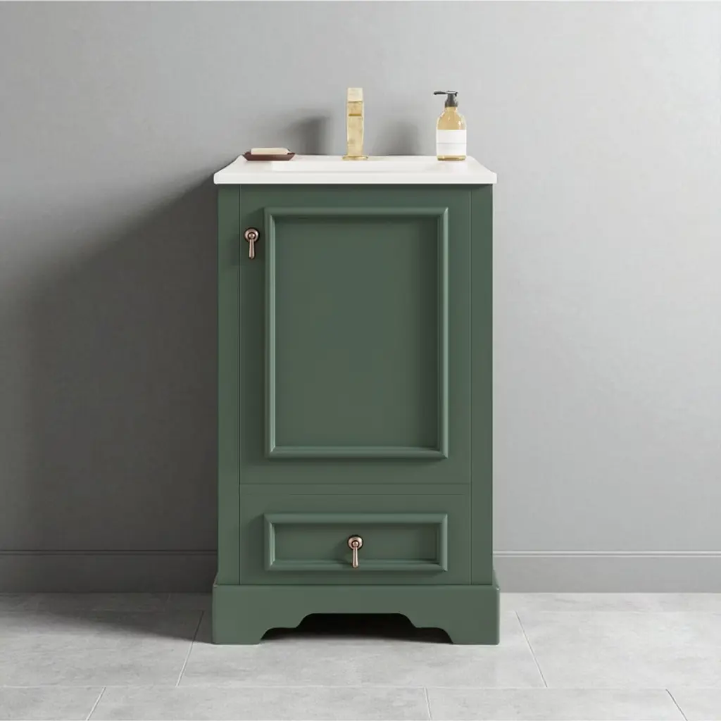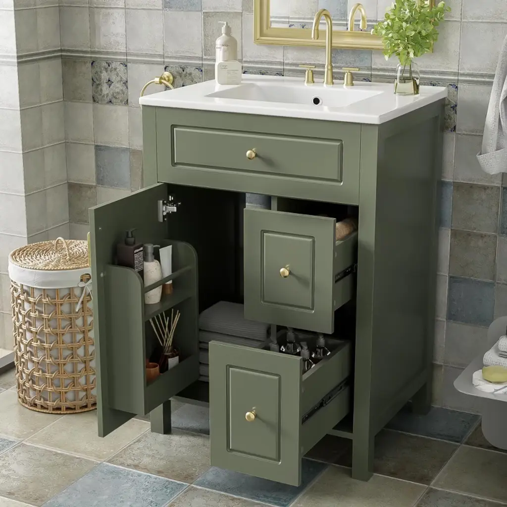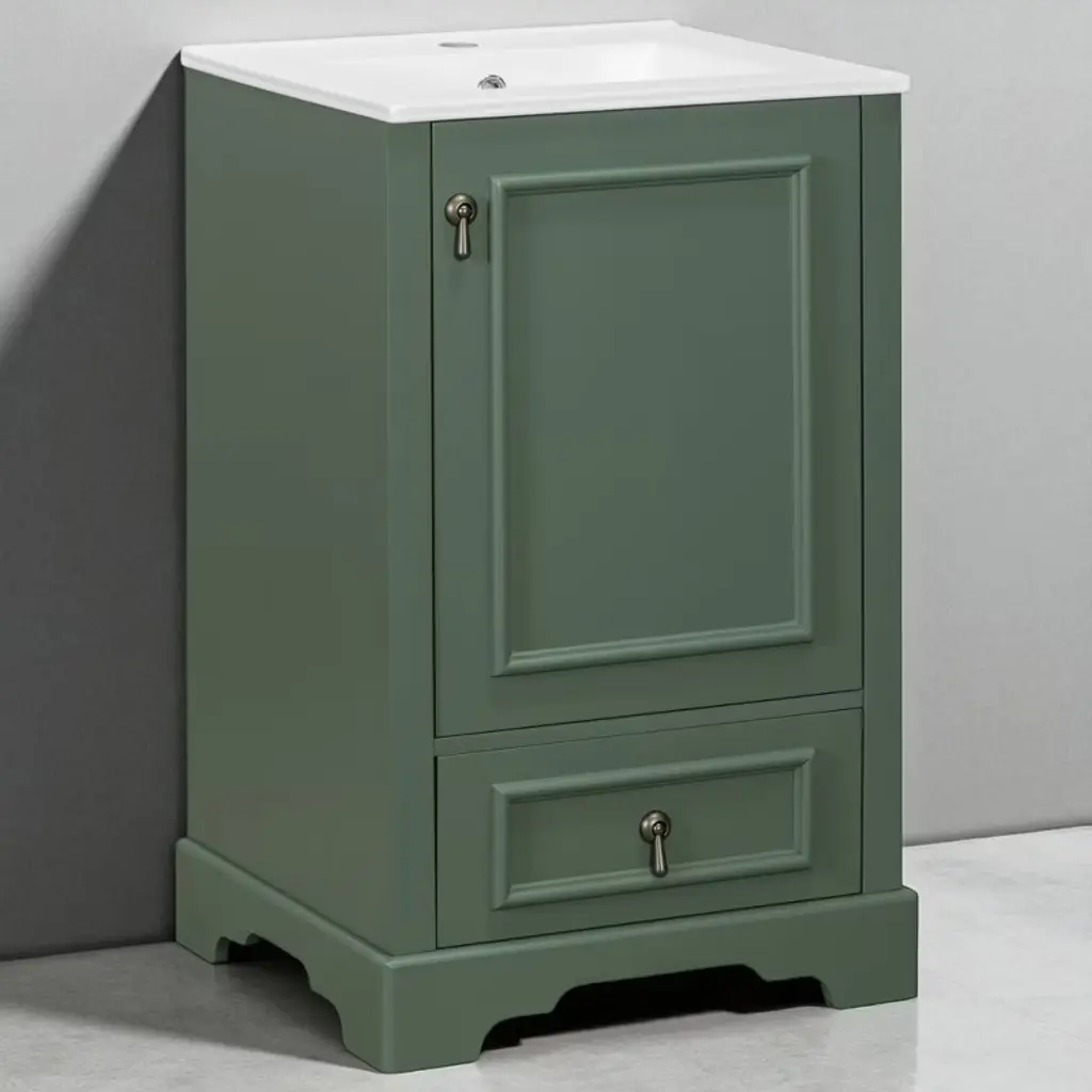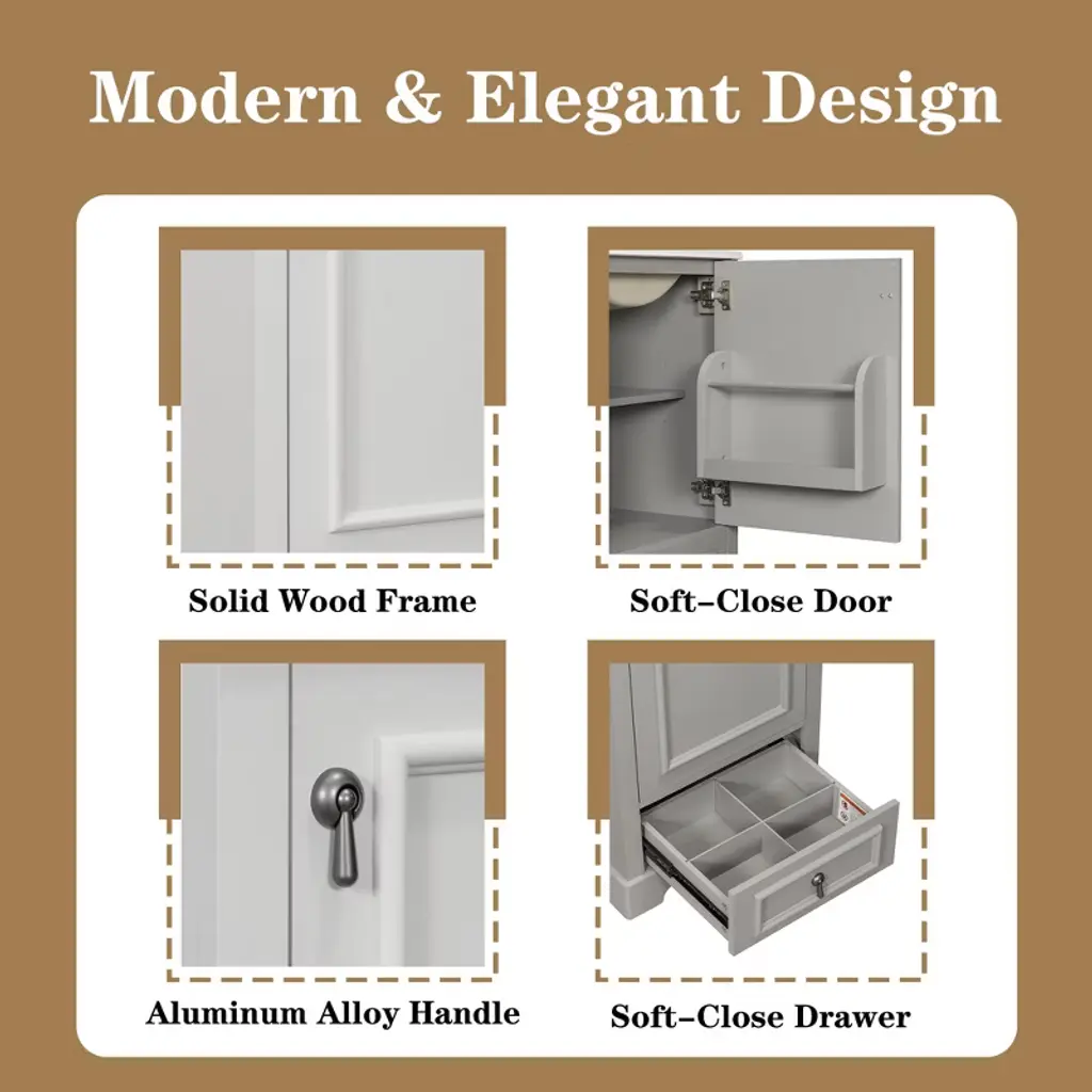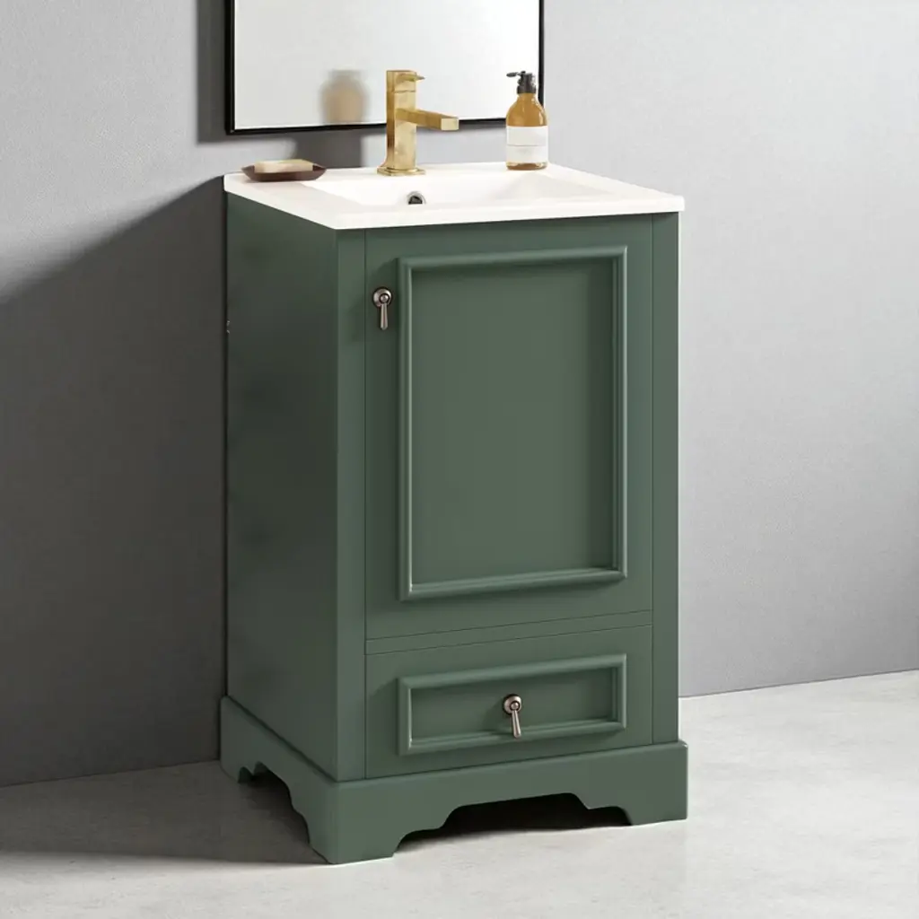 Product Overview Enhance your bathroom with this 20-inch modern freestanding vanity, thoughtfully designed for compact spaces. Featuring a sleek grey finish and a solid wood frame, it brings both durability and contemporary elegance to your home. The easy-to-clean ceramic sink includes an overflow hole and pre-drilled faucet mount, while the interior offers multiple smart storage features such as a compartment drawer, an adjustable U-shaped shelf, and a door-mounted organizer. With its soft-close hinges and noise-reducing design, this vanity delivers comfort, convenience, and a stylish upgrade to any small bathroom. Product Features Space-Saving Design: Measuring 20" W x 18.3" D x 34" H, this compact vanity is perfect for small bathrooms, powder rooms, or guest suites where space is limited.Durable Ceramic Sink: Features a smooth, scratch-resistant ceramic basin with an overflow hole and single pre-drilled faucet mount (faucet not included), ensuring easy maintenance and everyday use.Smart Storage Combination: Includes an adjustable U-shaped shelf to accommodate plumbing, a door-mounted rack for toiletries, and a divided compartment drawer for organized storage of smaller essentials.Solid Construction: Built with a sturdy solid wood frame and high-quality MDF cabinet body for long-lasting strength and resistance to humidity.Soft-Close Mechanism: Both the drawer and door are equipped with soft-close hardware to ensure quiet operation and reduce wear and tear.Stylish Details: Finished with a smooth, moisture-resistant painted surface and a corrosion-resistant aluminum alloy handle that adds a modern touch while standing up to daily use.Open Back Design: Allows for flexible plumbing installation and promotes better airflow to reduce moisture buildup. Specifications Product Name: Bathroom VanityProduct Size: 20"W x 18.3"D x 34"HWeight: 77.16 lbsSink Size: 20"W x 18.3"D x 6.29"HVanity Size: 19.7"W x 17.87"D x 33.45"HWeight Capacity: Overall: 110 lbs | Shelf Divider: 22 lbsStyle: ModernMounting Type: Free-standingColor: GreySink Material: CeramicCabinet Material: Solid Wood + MDFHandle Material: Aluminum AlloyFinish Type: Painted FinishSink Type: Undermount/Drop inSink Shape: RectangularFaucet Mount: Single Hole (faucet not included)Overflow Hole Included: YesVanity Top Edge Type: FlatEdge Thickness: 0.55"Number of Doors: 1Number of Drawers: 1Adjustable Shelves: YesAssembly Required: YesOrigin: VietnamNumber of Packages: 1 Suitable Scenarios Ideal for small bathrooms, apartments, powder rooms, and guest suites where space is limited but style and storage are essential. Its versatile grey color and clean design easily complement a variety of interior d茅cor styles. Notes Faucet is not included with the vanity.Assembly is required; instructions and hardware are included for easy setup.Wipe clean with a damp cloth and avoid abrasive cleaners to preserve the painted finish.
