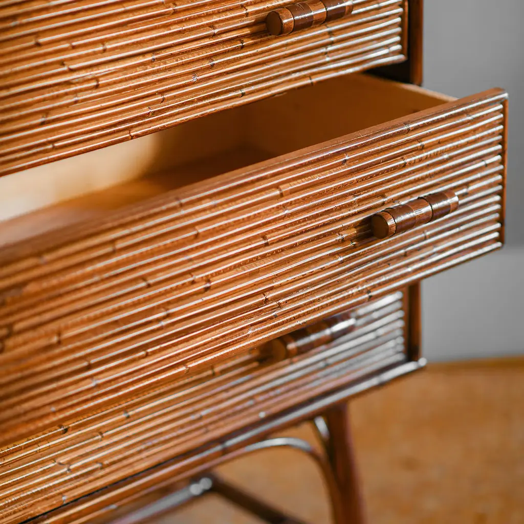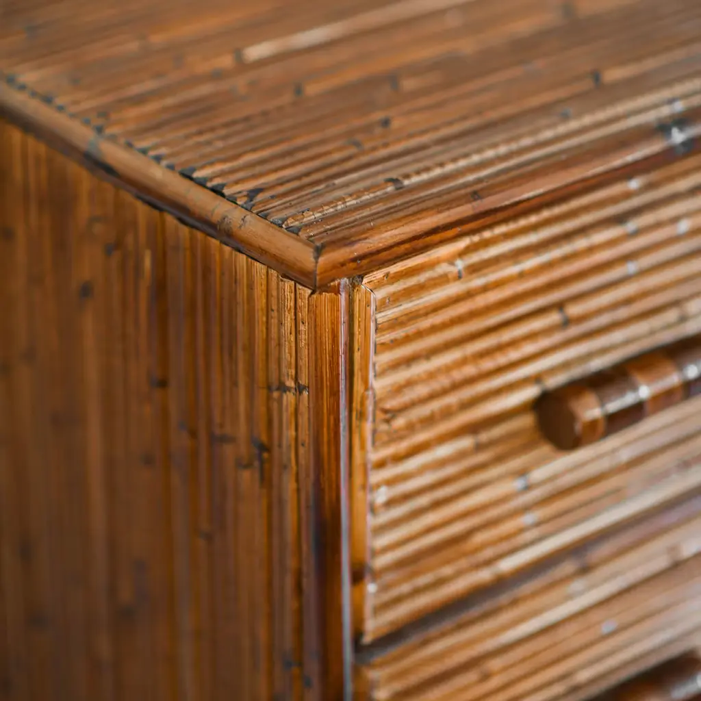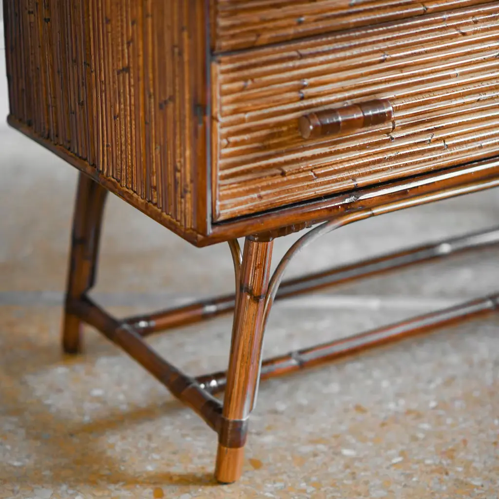Precious leather bindings enrich this bamboo chest of drawers with accents of sartorial elegance. Minutely crafted and finished by master artisans' hands, its silhouette consists of an airy four-legged base that offers sustain to a bold storage unit organized into three wide drawers. Its textural dynamism is entirely owed to the juxtaposition of bamboo canes, which implies the uniqueness of every single piece.