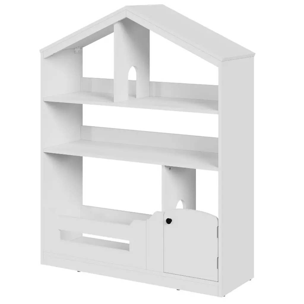 this charming 3-tier kids bookshelf combines playful house-shaped design with smart functionality, making storage fun and interactive. the built-in sensor light creates a cozy reading nook, while multiple compartments (open shelves, fabric bins, and drawers) keep books, toys, and other things neatly organized. crafted from premium, child-safe wood, its sturdy anti-tip structure and rounded edges ensure safety. perfect for nurseries, playrooms, or bedrooms, this durable and whimsical bookshelf inspires imagination while keeping spaces clutter-free.1.FITS ANY ROOM: No matter where you put it—your kid's bedroom, playroom, or study—this two-tiered bookshelf looks great. Its simple and classic house design works well with all kinds of kids' decor styles, whether you like modern, cozy, or something in between. It's an easy way to spruce up any space while being functional for kids.2.LOOKS JUST LIKE A HOUSE: This bookshelf isn't your average storage unit—it's shaped like a cute little house, designed especially for kids! Its fun design makes it look like something straight out of a storybook. With two easy-to-reach tiers, kids can easily grab their favorite books or toys. It’s a great way to add a playful and unique touch to any child’s room, and it’s sure to be a favorite topic when friends come over.3.LOTS OF ROOM FOR BOOKS AND TOYS: Don’t let its cute look fool you—this two-tiered bookshelf has plenty of space to hold all your child’s things. The upper tier is perfect for displaying special toys or storybooks, while the lower one is great for everyday items like coloring books and small toys. It’s ideal for small kids’ rooms, helping them keep everything tidy without taking up too much floor space.