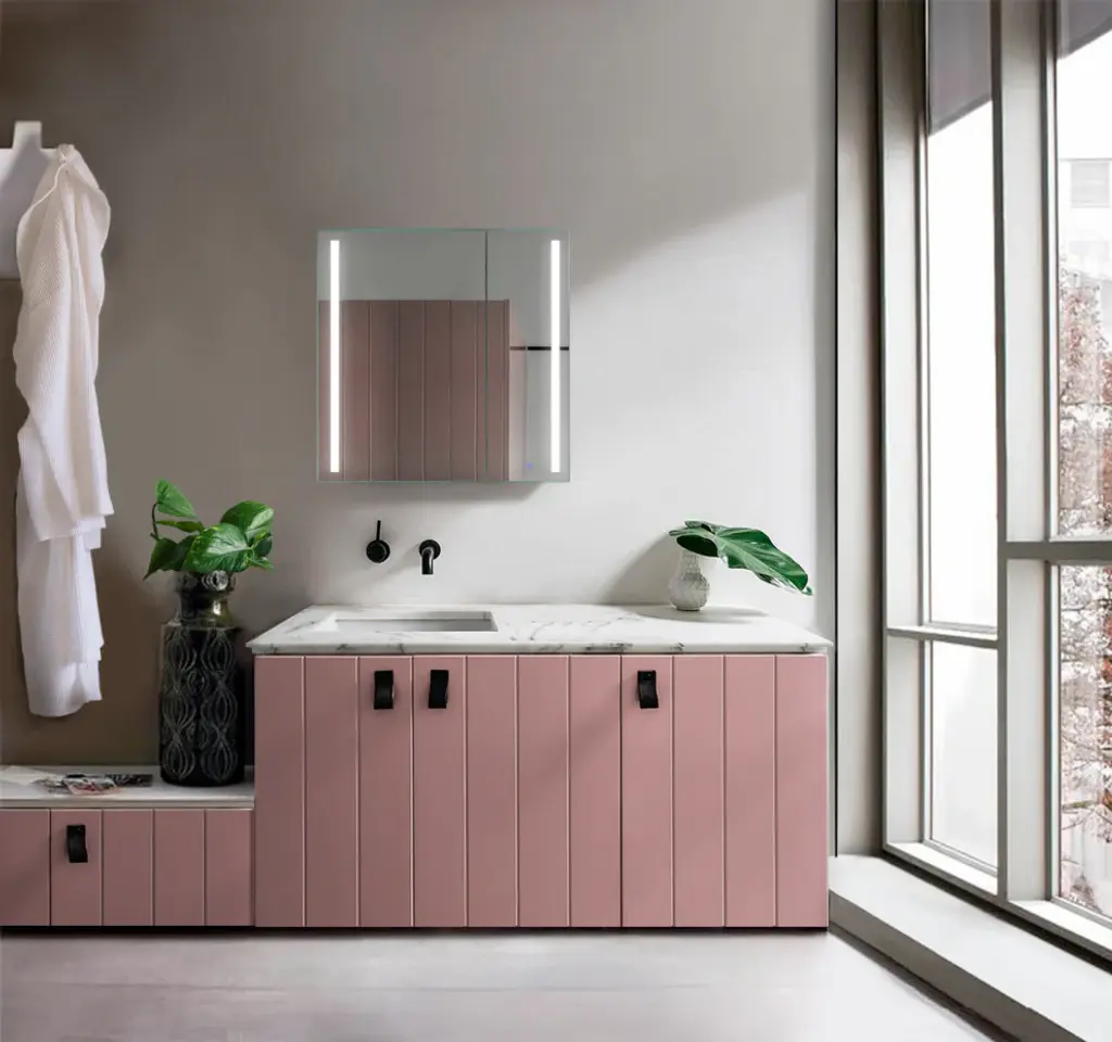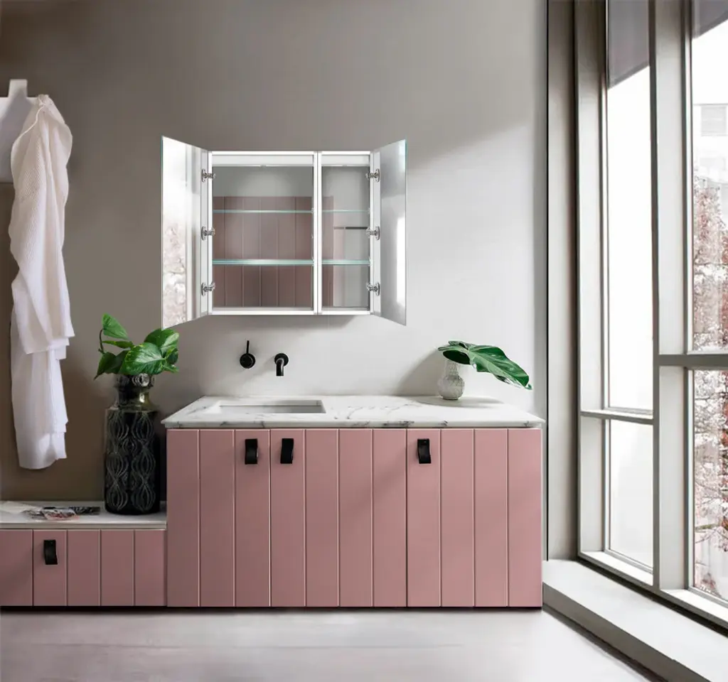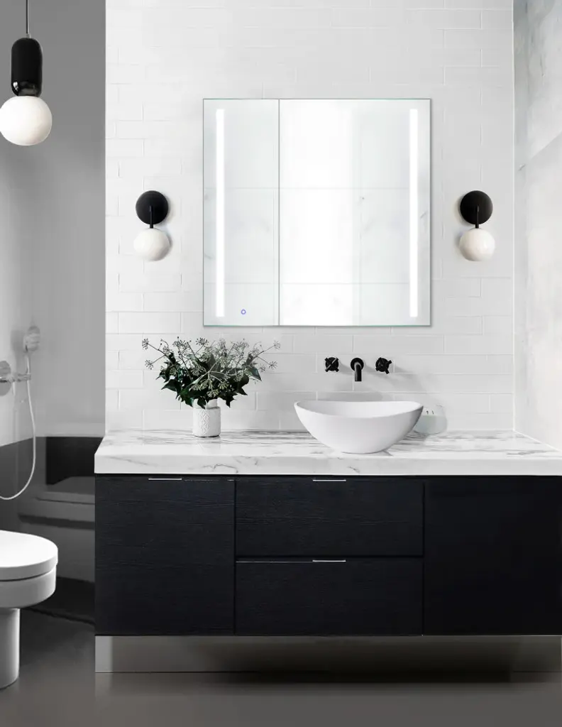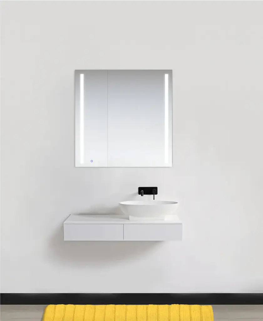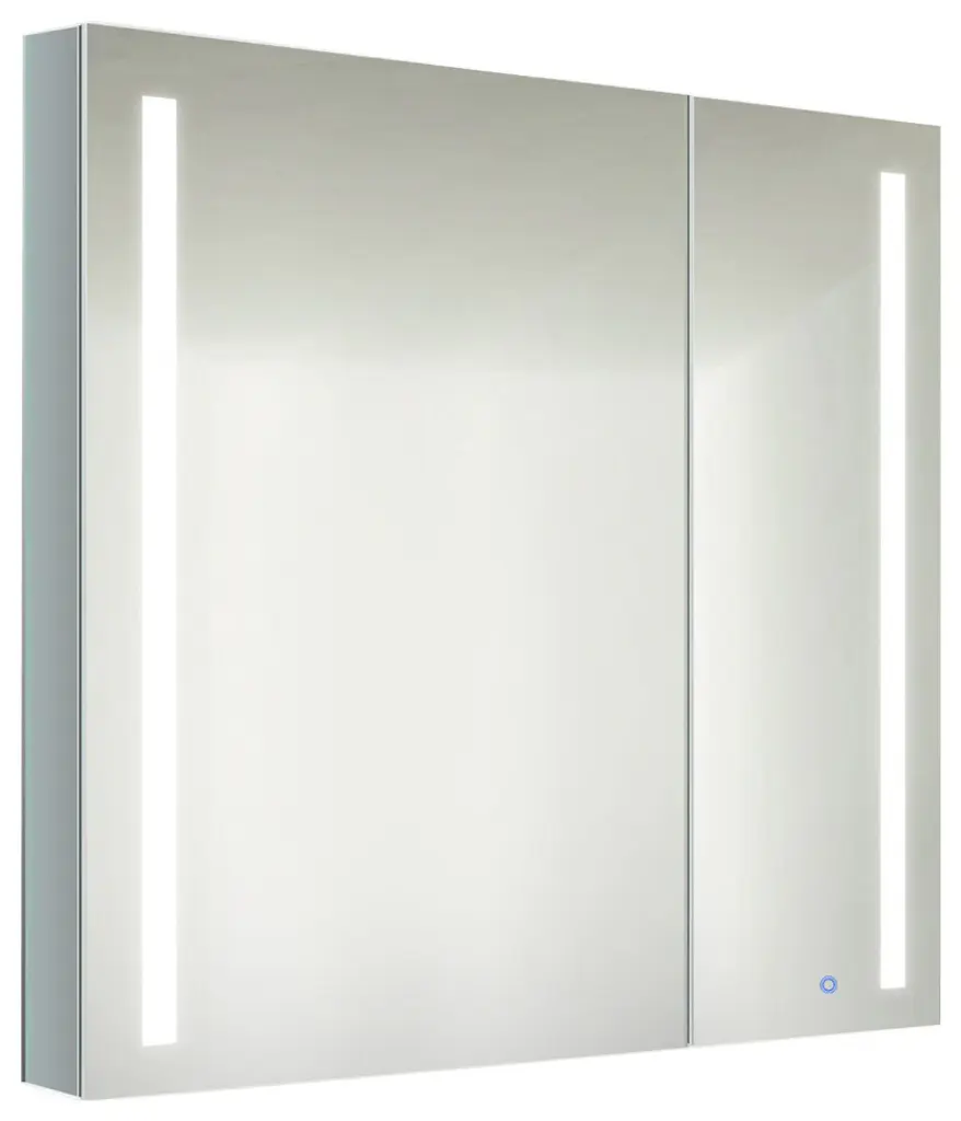 Optimal storage unites with modern design with the Krugg Reflections Kinetic 30x30 double door medicine cabinet. Soft, eco-friendly LED task lights along the sides of the cabinet are easily adjusted with the smart touch dimmer and an integrated heating element ensures your reflection is always clear. The cabinet features three clear, adjustable glass shelves, as well as a divider to help you organize bath items. Other premium touches include German Blum hinges that allow you to softly shut the doors and ensures a quiet bathroom atmosphere. For flexible installation, the cabinet can be recessed or surface mounted.
