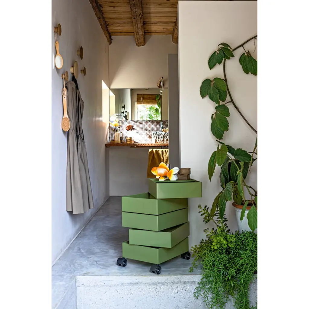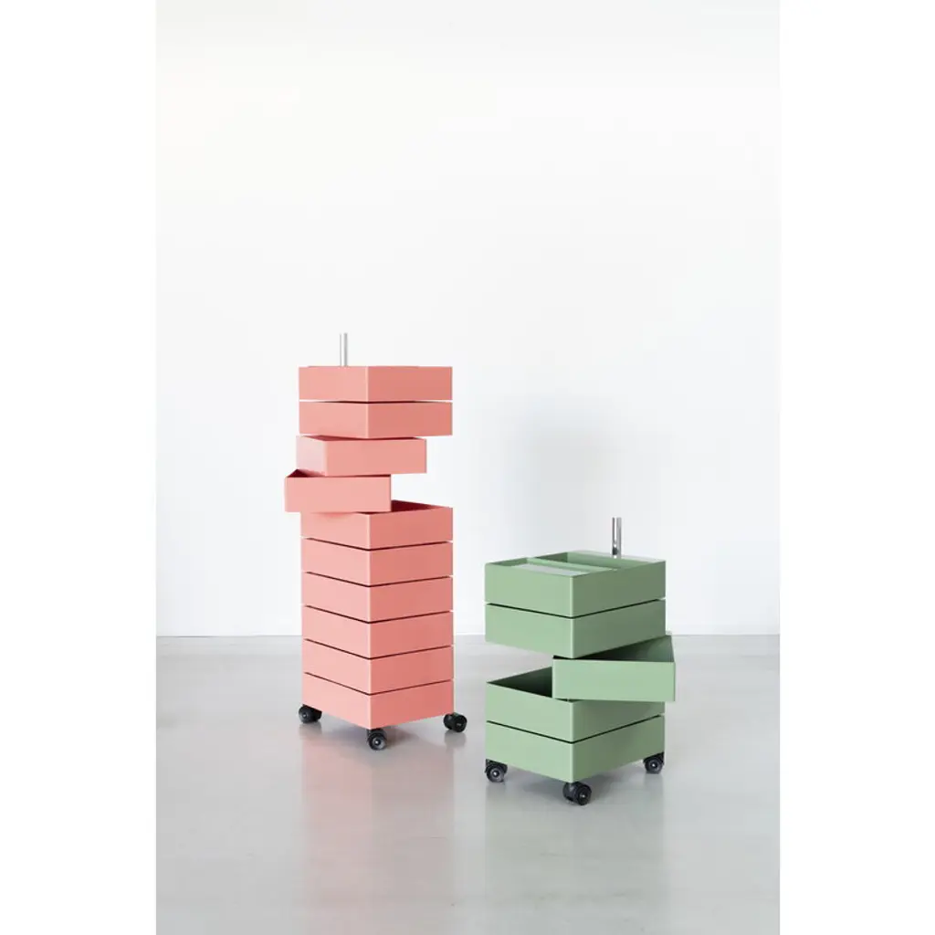 Magis' 360° drawer unit is a delightful way to add some much-needed extra space to your home office, kids' room or hallway. Designed by Konstantin Grcic, the drawer unit charms with its distinctive design: five boxes have been placed around an aluminum tube, right on top of each other. All five drawers rotate a full 360 degrees around the tube – hence the name of the storage unit. The 360° drawer unit is made of durable, shiny ABS plastic and has wheels underneath, so you can easily move it from one place to another if needed.