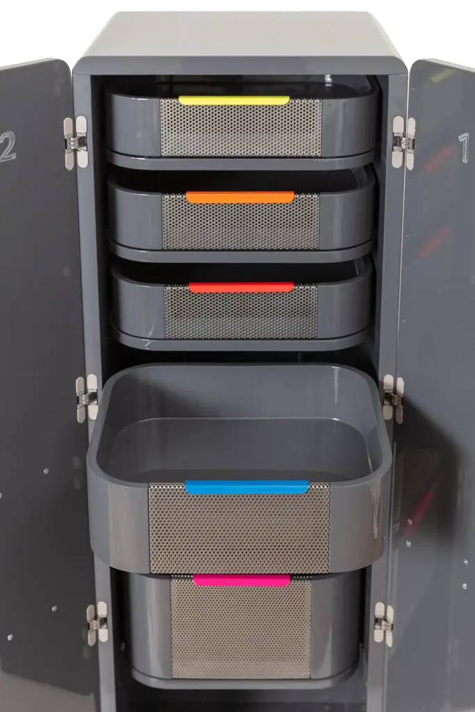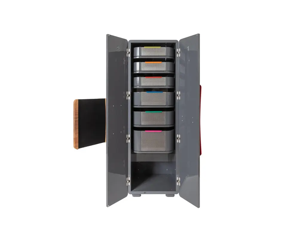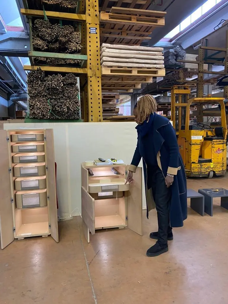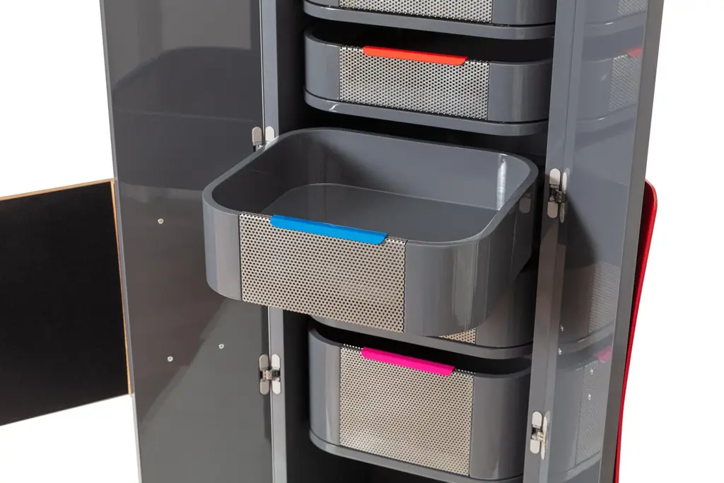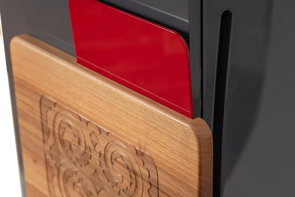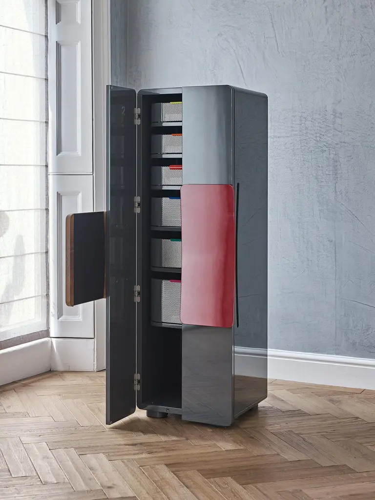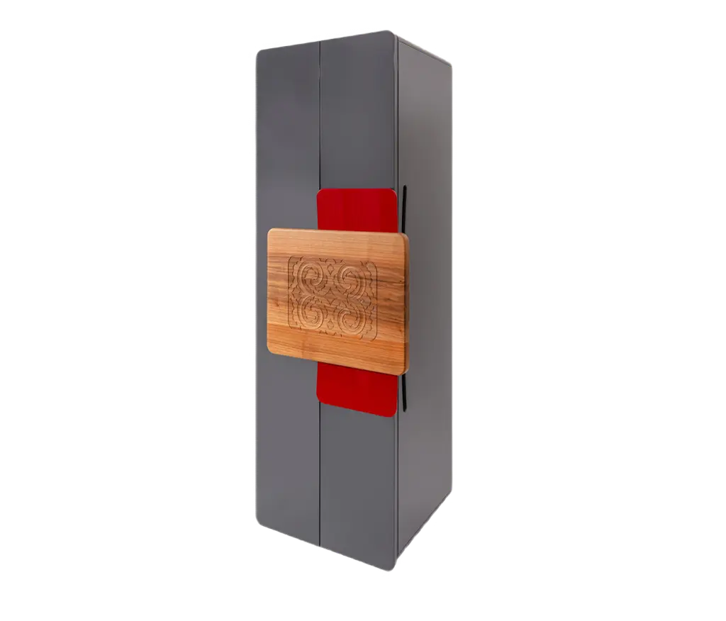 The All Aid Wellness Cabinet from SoShiro’s Ainu collection, a collaboration between award-winning artist Toru Kaizawa and Shiro Muchiri, was initially imagined as a large-scale medicine cabinet. Its combination of exquisite craftsmanship with modern manufacturing techniques makes for a versatile storage unit in any room.Made in Italy from eco-friendly wood and steel, this grey-and-red lacquered cabinet features a utilitarian stainless-steel interior with six drawers that are colour-coded with magnetic and switchable handles and concealed ultra-smooth drawer mechanisms for optimal organisation. Its unique solid-oak handle with a Blakiston’s fish owl eyes motif was designed by celebrated Ainu sculptor Mamoru Kaizawa and beautifully carved by Ainu artisans. The Blakinston’s fish owl, a symbol of protection for the Ainu people, brings to our living spaces the epic story of their community.The Ainu collection celebrates the artistry of the indigenous Ainu people of the Japanese archipelago and their sacred relationship to forests and nature. For the Ainu, wood is considered an extraordinary material, treated with special care. Each live tree is subject to rituals that inform the sensitive harvesting of bark to make garments and other ornaments. The sculptors commune with the wood they work on and pay homage to the trees.This "All Aid" cabinet has LED lighting to illuminate the cabinet drawers - this is powered by a plug socket. Dimensions: L 45cm, W 43cm, H 141cm (17.71in x 16.92in x 55.51in).