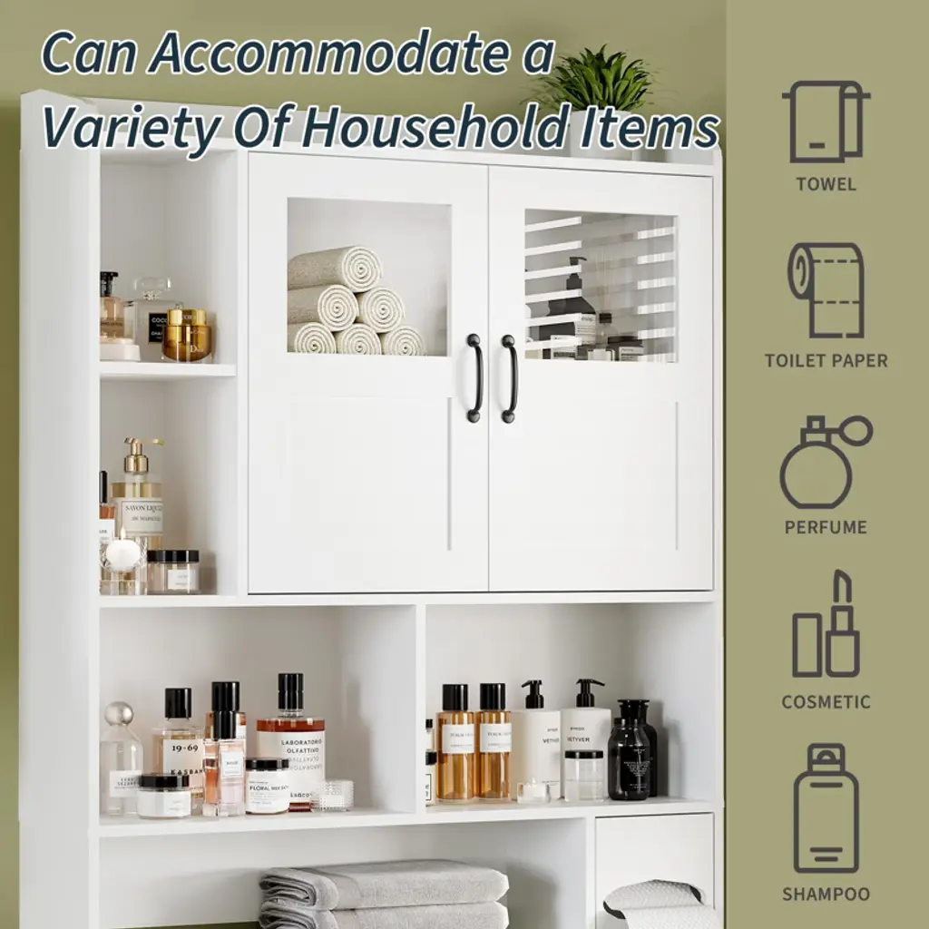 Enhance your bathroom organization with our Over the Toilet Storage Cabinet, designed to maximize your space while adding a modern touch. Crafted from high-quality engineered wood and tempered glass, this sturdy and safe storage unit promises long-lasting durability. The wall-mounted design, paired with an anti-tip kit, ensures enhanced stability and safety, making it ideal for any bathroom setting.