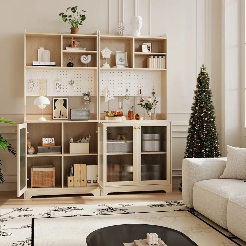 This multi-functional storage unit combines a spacious tabletop, handy pegboard, adjustable shelves, and two-door cabinet to keep your kitchen essentials perfectly organized. The customizable shelving adapts to store everything from tall bottles to small appliances, while the sturdy engineered wood construction ensures lasting durability.
