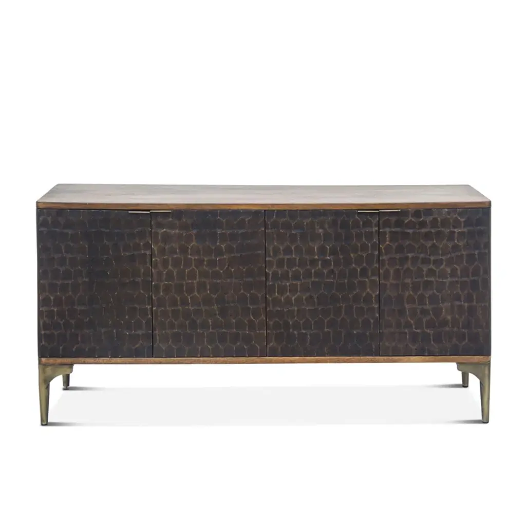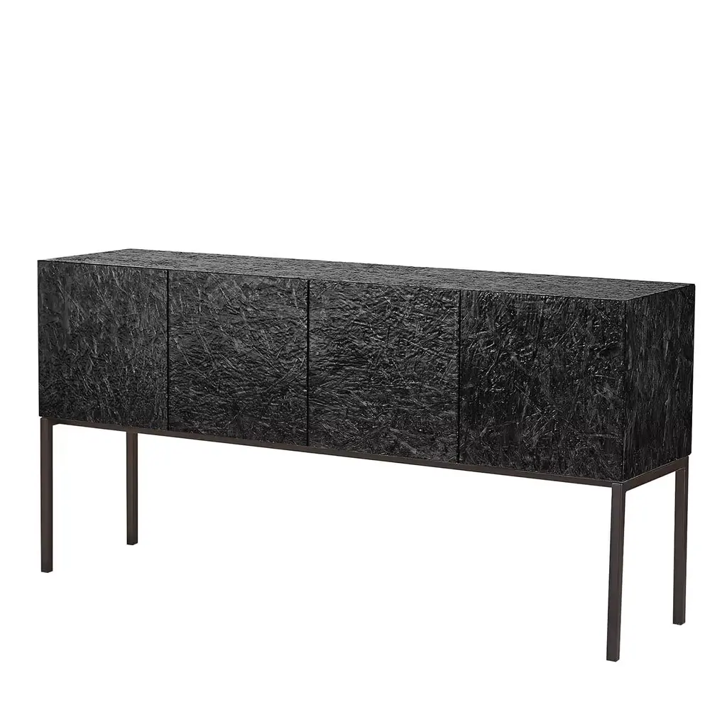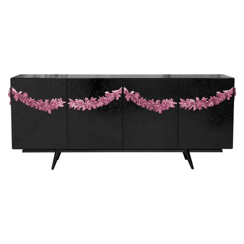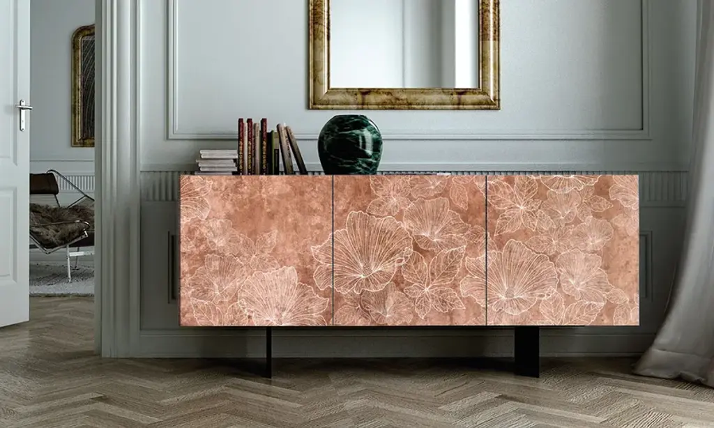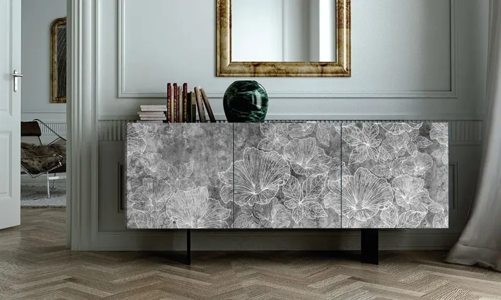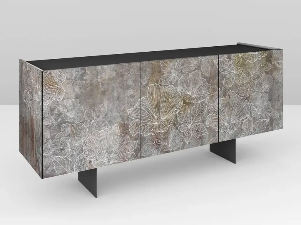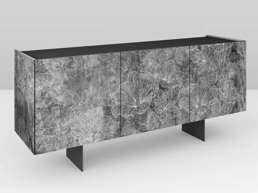 Antique is a sideboard with sides and doors in melamine faced MDF, thickness 19 mm worked at 45. Top, bottom, back and shelves in 19 mm thick melamine faced chipboard. “CARB2/TSCA Title VI-Attestation" and FSC certification. Doors closing with cushioned hinges. The storage unit comes with graphite grey varnished metal pedestal and two adjustable shelves. Digitally printed graphics with protective water-based varnish. Exterior and interior lacquered with water-based varnish recalling the predominant color of the graphics. The cabinet is supplied assembled with suitable cardboard packaging.
