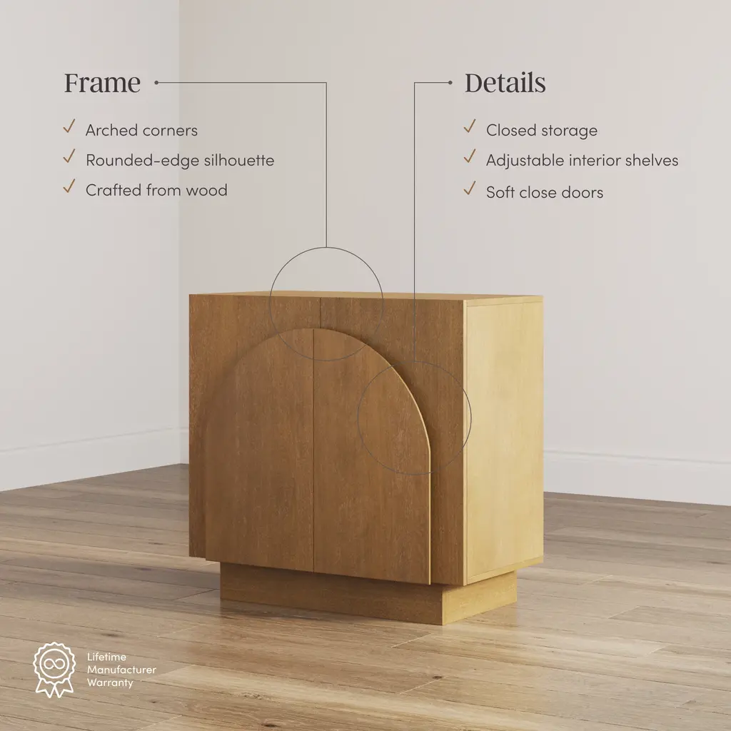 Meet our Iris Storage Cabinet! Inside, discover a handy closed storage shelf and ample storage space tucked behind its distinctive arched cabinet doors. The interior shelves are adjustable, allowing you to customize the storage to your needs. Crafted from wood, the natural material adds warmth to your space, though it's important to note that natural wood can have variations in wood grain, making each piece one-of-a-kind. Whether you place it in your bedroom, living room, or dining room, the Iris Storage Unit not only provides functionality but also enhances the overall ambiance of your living space with its elegant and calming design.