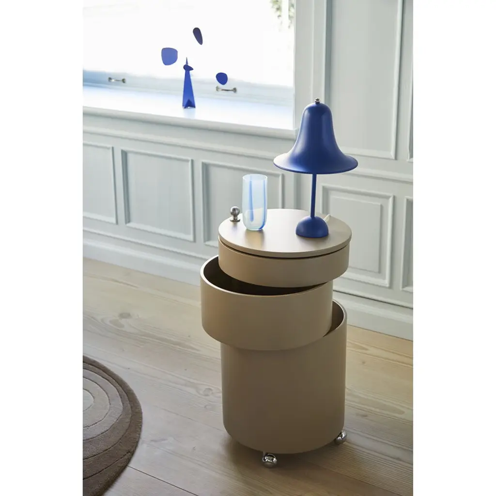 Verpan’s Barboy is a re-release of Verner Panton’s versatile bar trolley and mobile storage unit from 1963. Made of molded wood, Barboy consists of four cylindrical elements, two of which swing out to the sides. When in bar use, you can place glasses and snacks on the top levels, and fill the lowest element with bottles and carafes. Besides a serving trolley, Barboy also makes an excellent nightstand, side table or convenient storage trolley for example in the hallway or office. Thanks to the chrome-plated castors, Barboy is easy to move from one room to another.