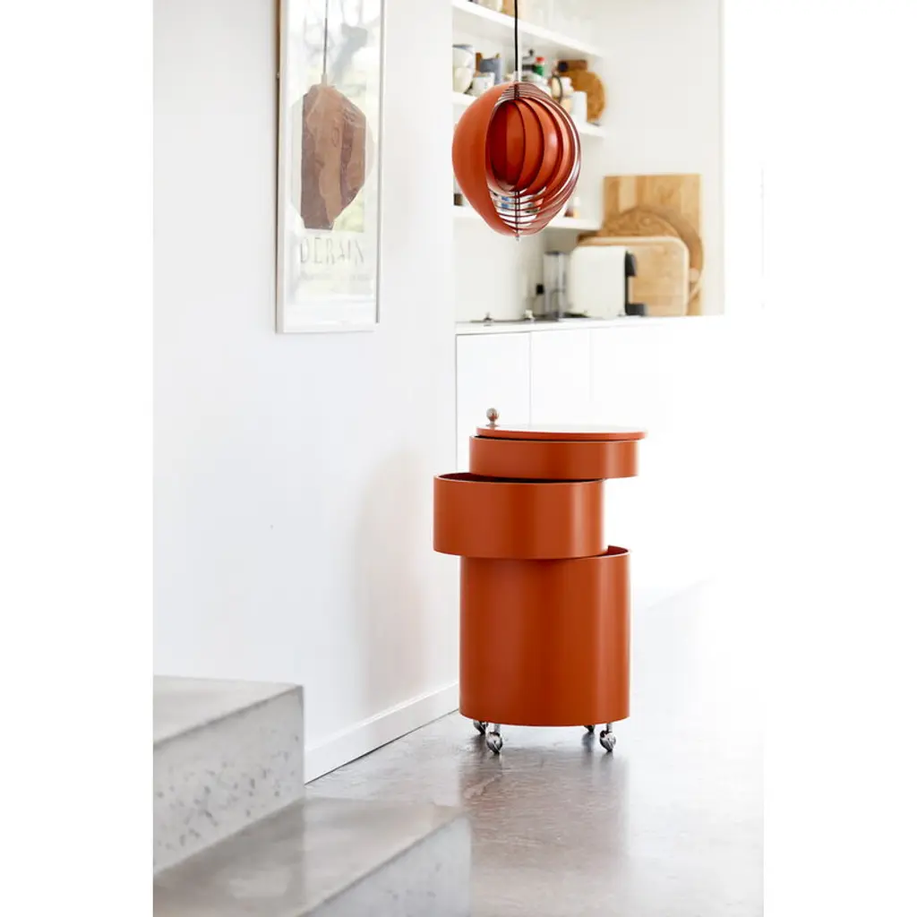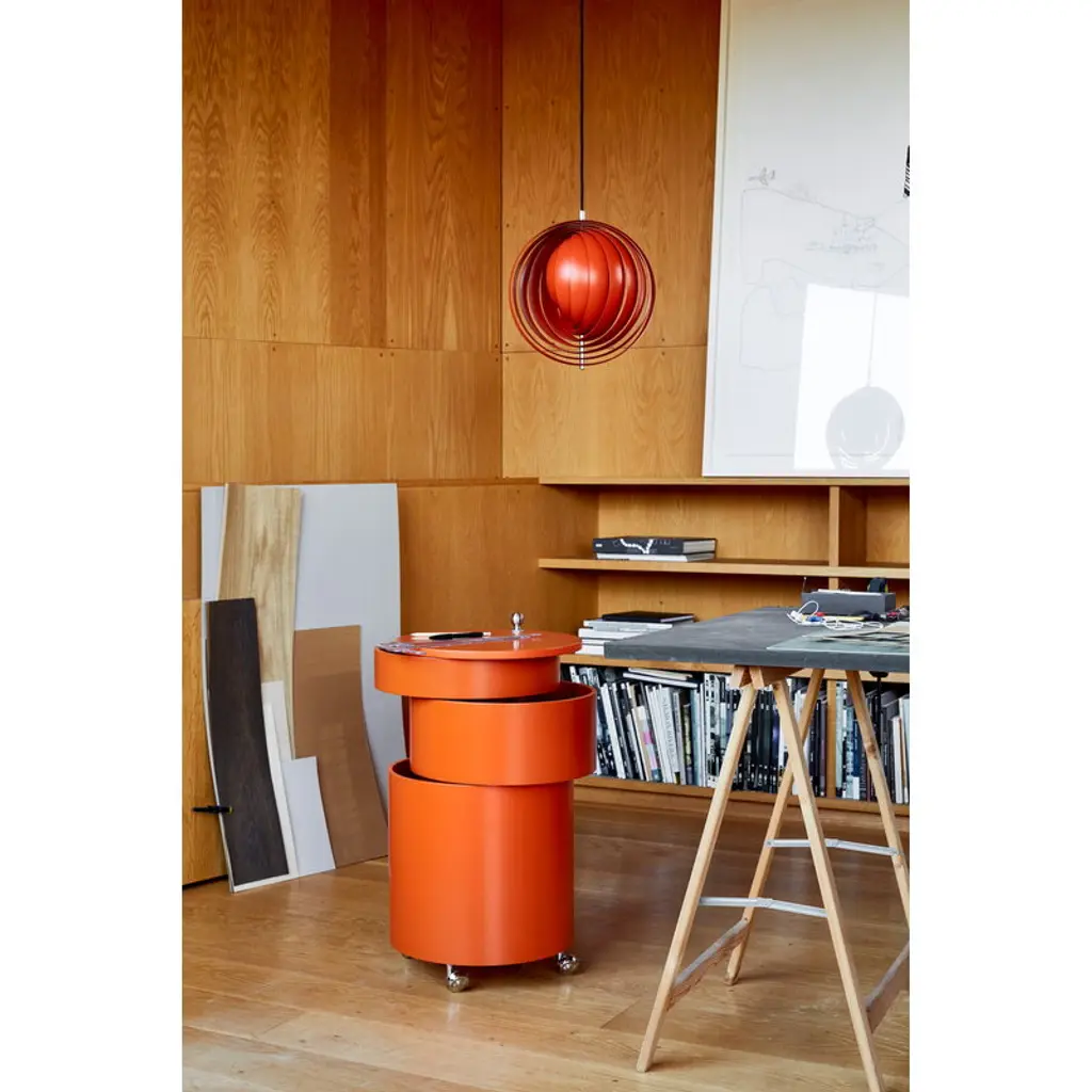 Verpan’s Barboy is a re-release of Verner Panton’s versatile bar trolley and mobile storage unit from 1963. Made of molded wood, Barboy consists of four cylindrical elements, two of which swing out to the sides. When in bar use, you can place glasses and snacks on the top levels, and fill the lowest element with bottles and carafes. And besides a serving trolley, Barboy also makes an excellent nightstand, side table or convenient storage trolley for example in the hallway, bathroom or office. Thanks to the chrome-plated castors, Barboy is easy to move from one room to another.