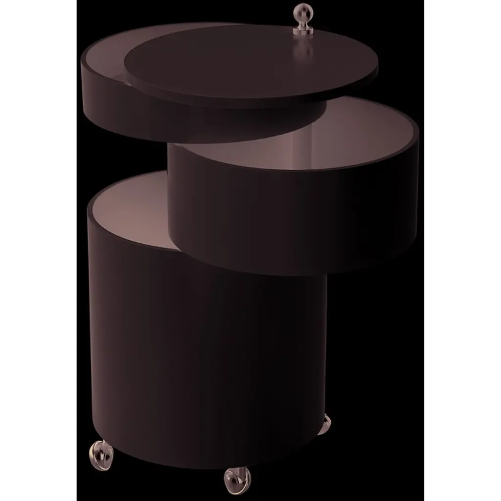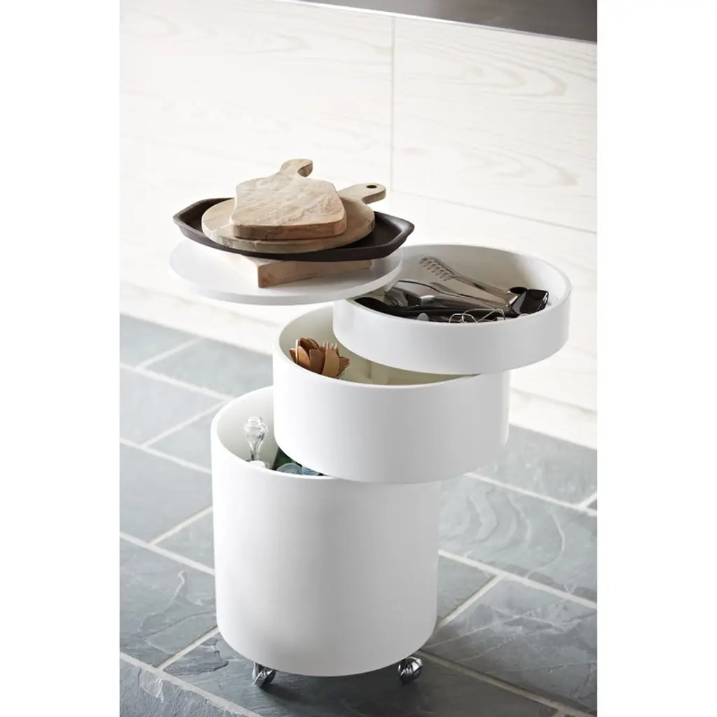 Verpan’s Barboy is a re-release of Verner Panton’s versatile bar trolley and mobile storage unit from 1963. Made of molded wood, Barboy consists of four cylindrical elements, two of which swing out to the sides. When in bar use, you can place glasses and snacks on the top levels, and fill the lowest element with bottles and carafes. Besides a serving trolley, Barboy also makes an excellent nightstand, side table or convenient storage trolley for example in the hallway or office. Thanks to the chrome-plated castors, Barboy is easy to move from one room to another.