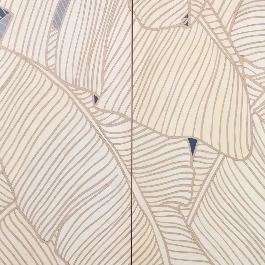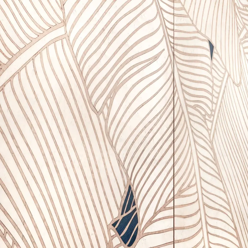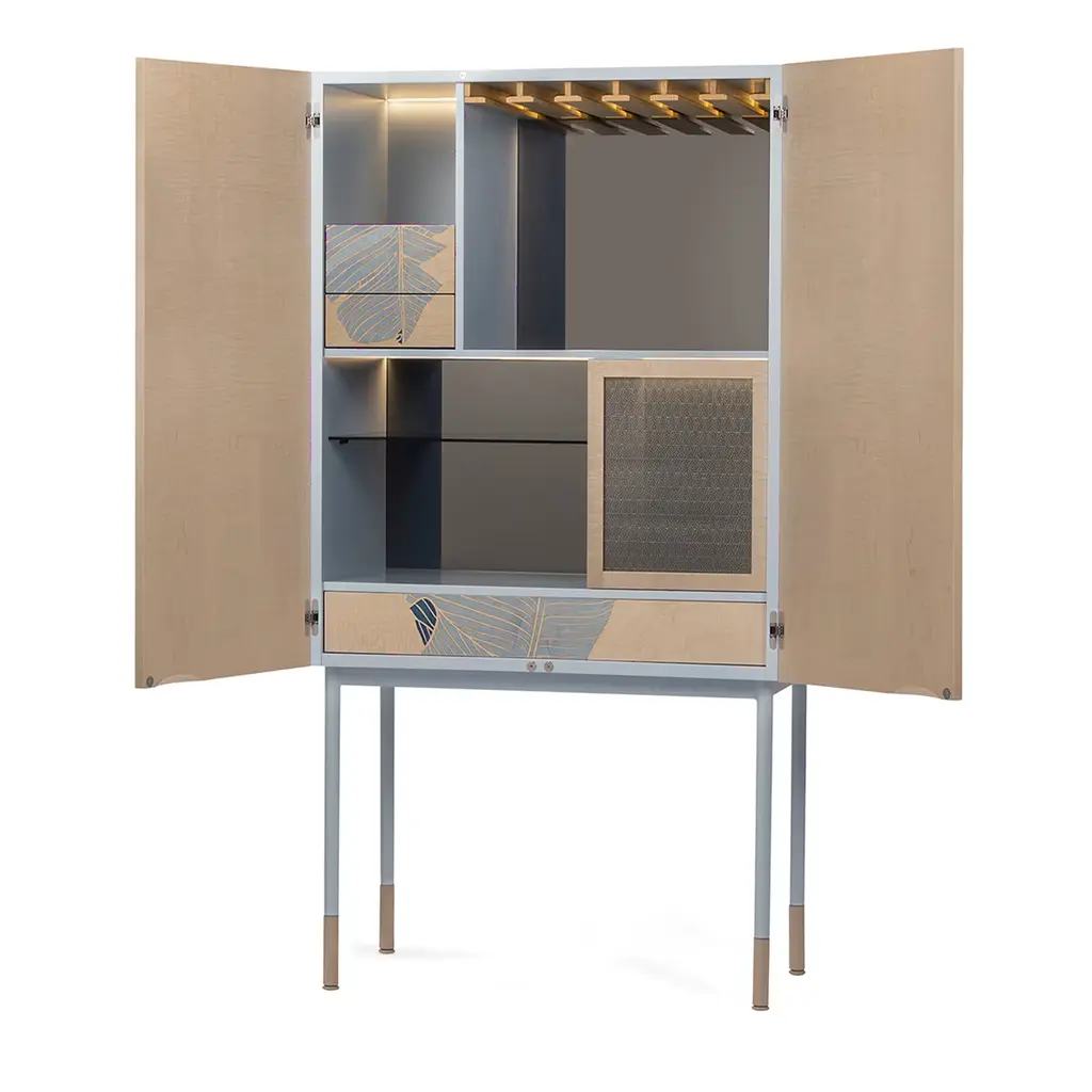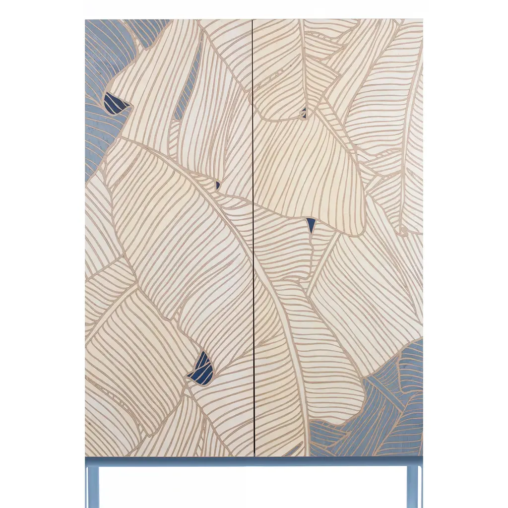 Marked by a delightful white and azure color palette, this cabinet draws inspiration from the unattainable perfection of nature. It stands on thin metal legs, creating an appealing interplay of solids and voids with the storage unit above, which is crafted of sky-blue-lacquered cedar. A minutely handcrafted inlay depicting Musa Basjoo's leaves in their organic, spontaneous beauty completes the piece.