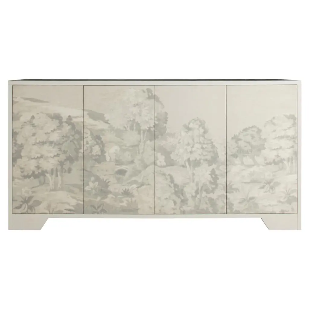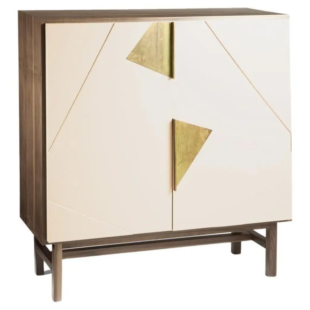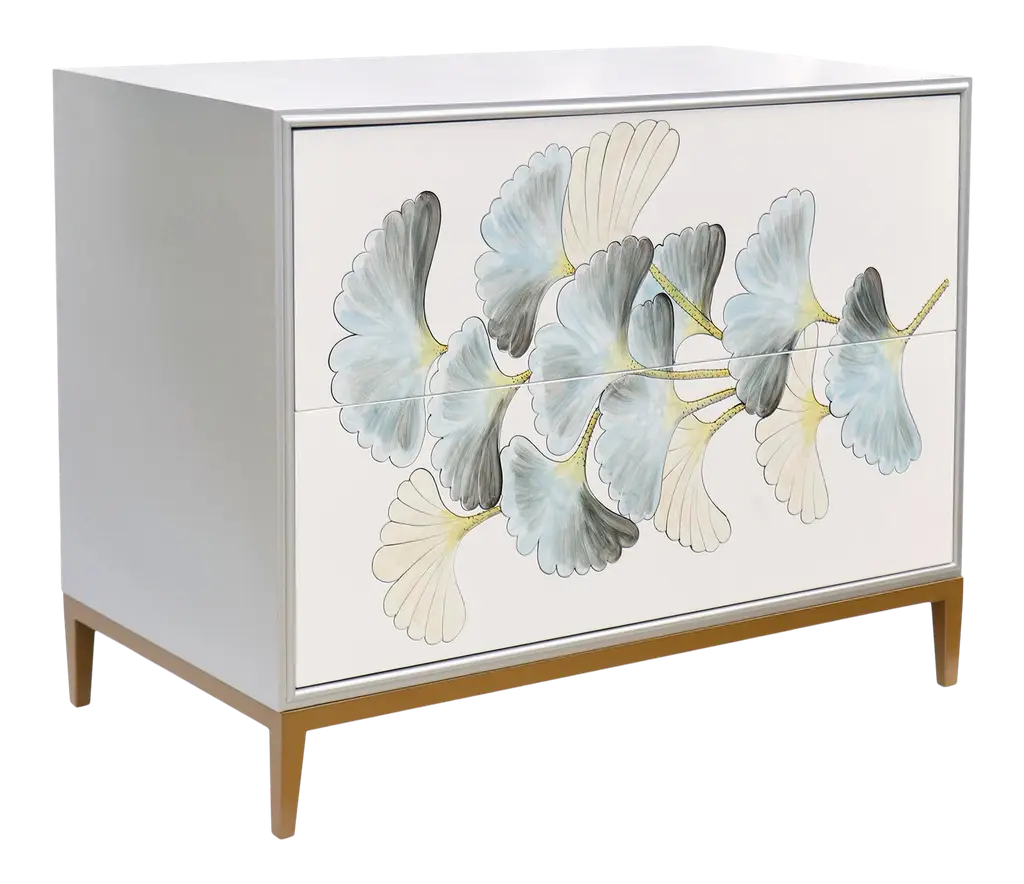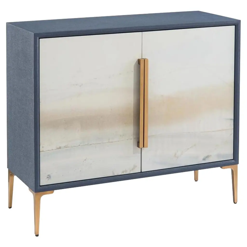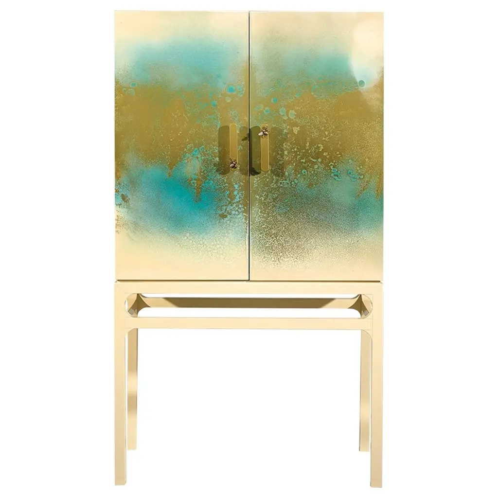 Marked by a delightful white and azure color palette, this cabinet draws inspiration from the unattainable perfection of nature. It stands on thin metal legs, creating an appealing interplay of solids and voids with the storage unit above, which is crafted of sky-blue-lacquered cedar. A minutely handcrafted inlay depicting Musa Basjoo's leaves in their organic, spontaneous beauty completes the piece.