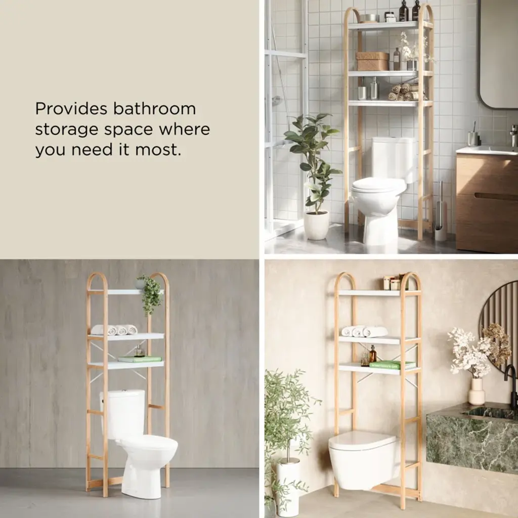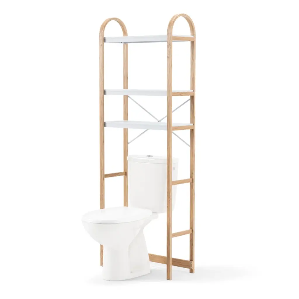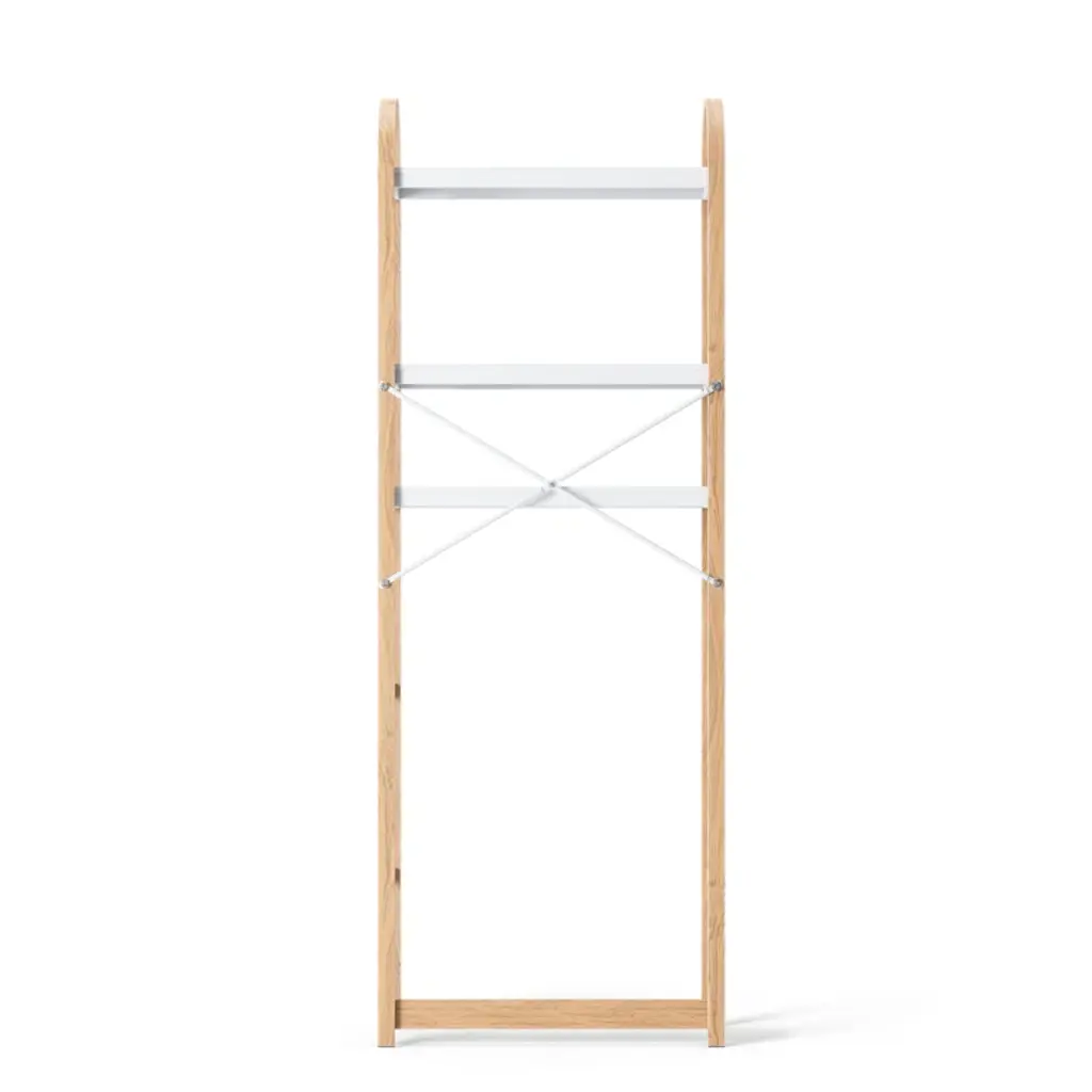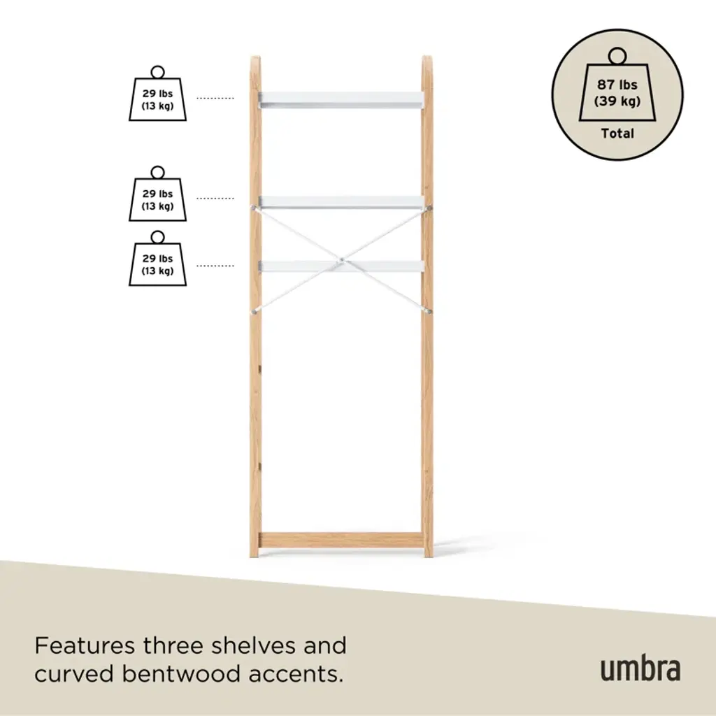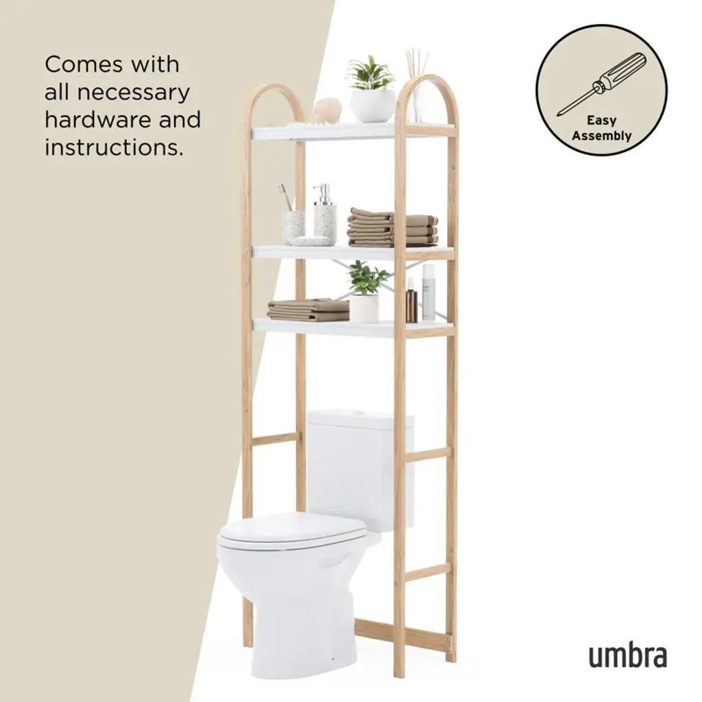 Instantly declutter and provide extra storage in your bathroom with Bellwood over the toilet shelf. With three tiers, each with a dowel bar to hang items like towels, this freestanding storage unit provides storage space where you need it most. Easy to assemble, Bellwood includes rubber feet and a furniture safety strap. Bellwood is part of Umbra's Bellwood family including a matching side table, coffee table, umbrella stand, wall shelves, freestanding shelves, and more.