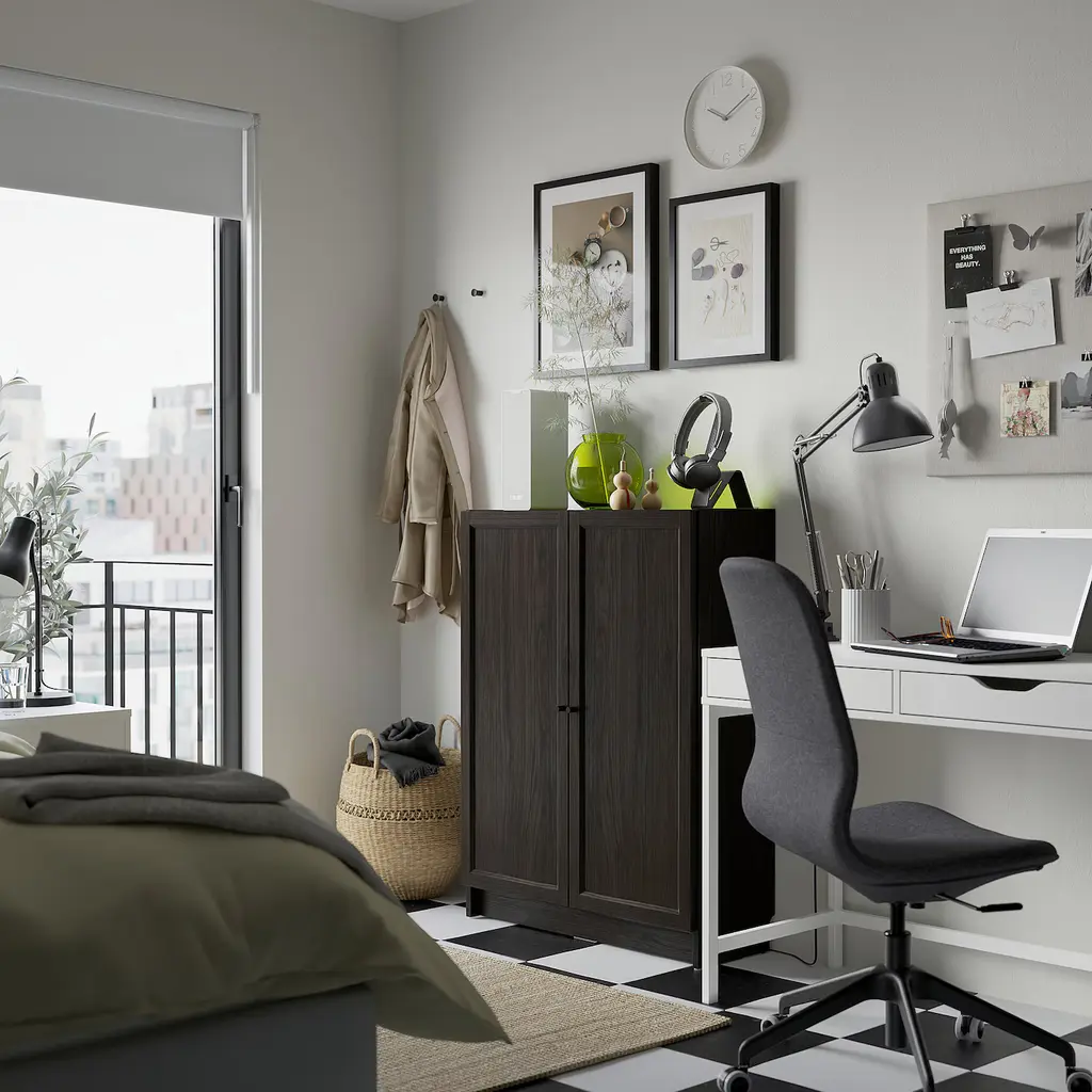 BILLY / OXBERG Bookcase with doors - dark brown oak effect 31 1/2x11 3/4x41 3/4 ". BILLY is a versatile bookcase that works just as good as a storage unit and is suitable to use in many different ways at home. Behind the panel doors you can keep your belongings hidden and free from dust.