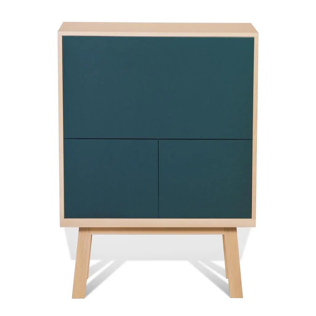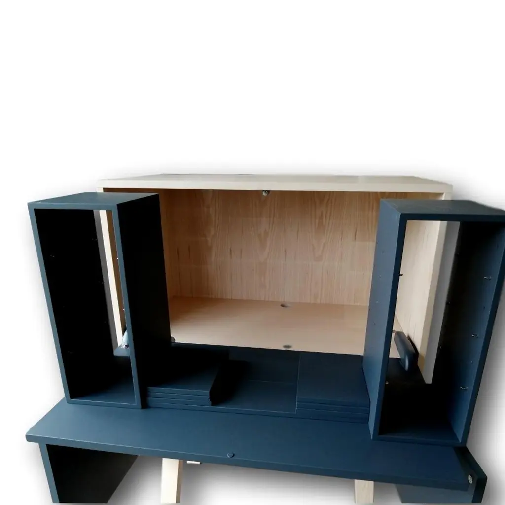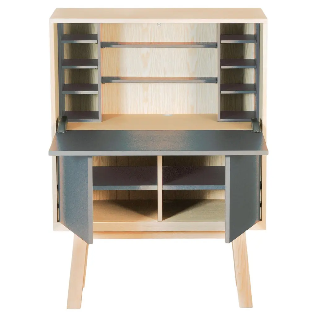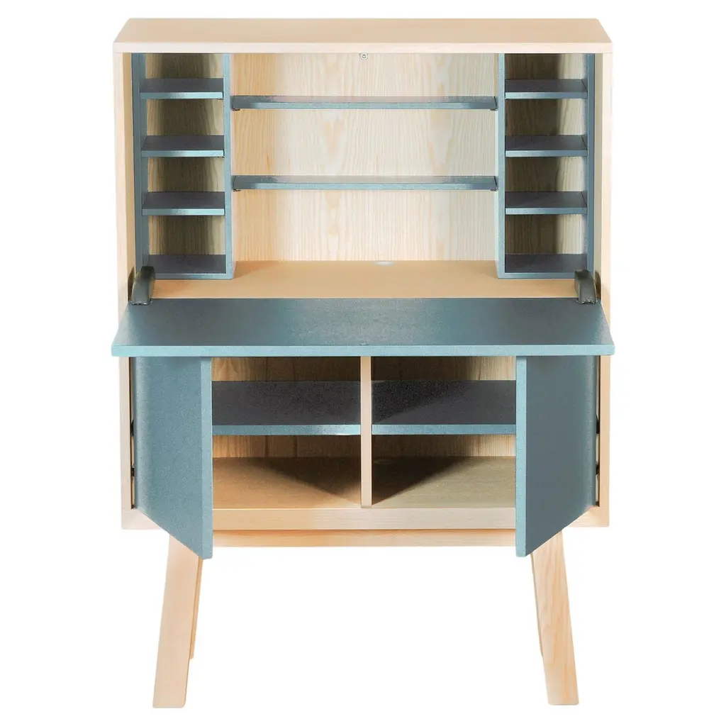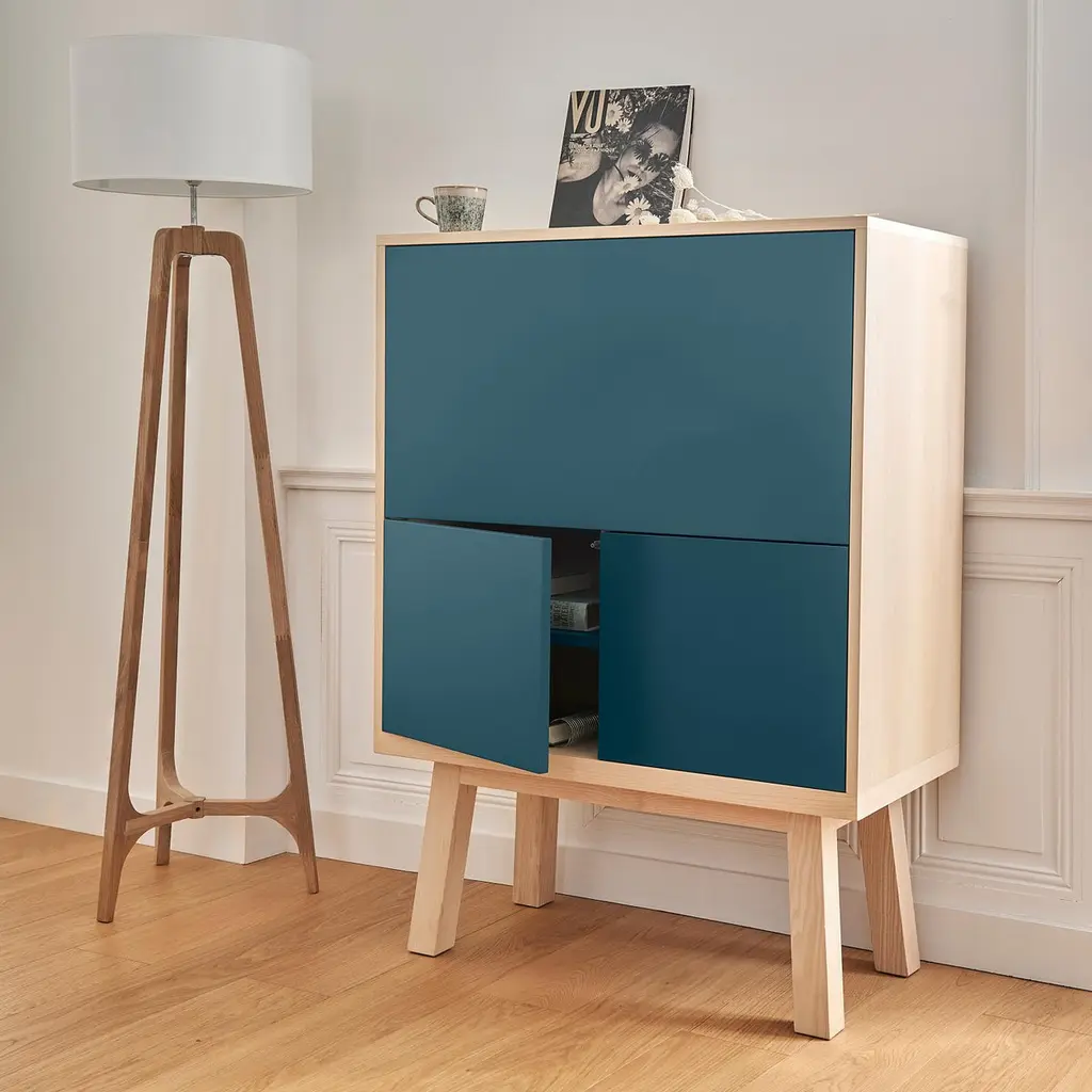 This secretary Desk belongs to our ÉGÉE COLLECTION and has been created in a KUBE concept for optimized storage spaces. The ÉGÉE collection is designed by the Parisian designer Eric Gizard. Eric adopts for this collection the refined codes of Scandinavian design, combining natural materials and sobriety of lines and adds very beautiful muted and "trendy" colours.The wood used for this collection is Ash.For all dimensions, we kindly advise to have a look at the scheme with dimensions in the pictureThe dimensions of the box itself are width 90 cm / 35.4'' x height 90 cm / 35.4'' x depth 46 cm / 18;11''Height of the feet is 35 cm / 13.8''Useful height behind the lower hinged doors is 37 cm / 14.6''Overall width of each compartment behind the hinged doors is 42 cm / 16.5'' and useful width is 38 cm / 15.0'' due to the hinges. The vertical interior divider can be moved during the manufacture process to allow the installation of printers with a width> 42 cm / 16.5''.The upper working part is fitted with a flap door on a "push-loose" opening for an efficient work with your laptop and smartphone. The storage space inside the cube and behind the flap is for your screen or to store your paperwork in the removable shelves. The lower part with the 2 hinged doors opens with a "push-to-release" pressure in the middle of the flap. The horizontal 2 shelves are on cleats and removable. The cable passage is made made in the middle of niche behind the flap and at the back of each low removable shelf. MON PETIT MEUBLE FRANÇAISoffers you exlusively 100% French products. The solid wood comes exclusively from sustainably managed French forests, PEFC certified.The manufacture and finishes are of very high-end quality, carried out in workshops in Mayenne, France.
