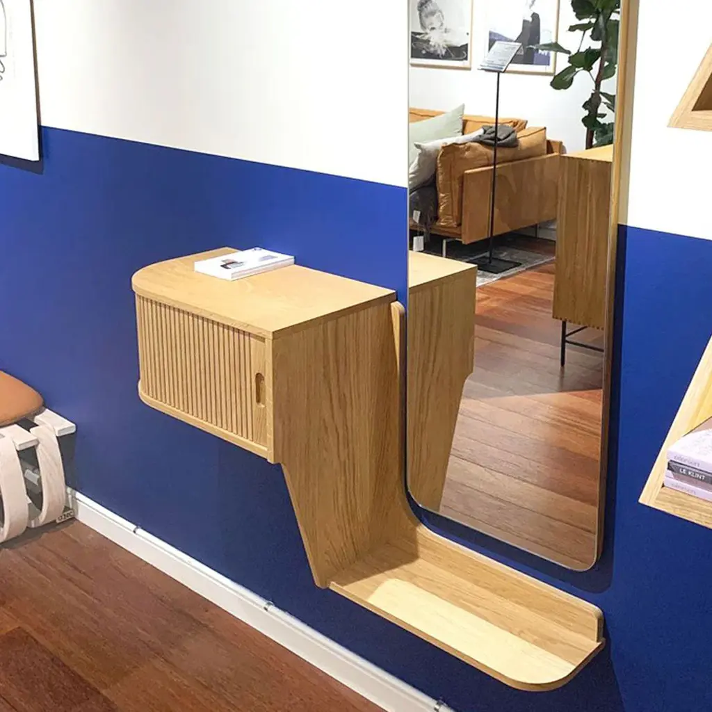 Hallway no. 127, a wall-mounted storage unit for smart and stylish storage. A combination of a console table and a mirror to check yourself out before leaving. The storage compartment features a sliding tambour door that rolls seamlessly into the back. A rare technique today that is not only pleasing to the eye, but is also functionally ideal as it minimizes the space needed. A vertical wall-mounted mirror on a frame of solid wood with finger-jointed corners; A visual proof of high quality cabinetmaking. Beautiful, clean lines and distinctive grain pattern in the wood give the pieces a unique character. A stylish, sophisticated and functional addition to any hallway or bedroom. Designed in 1955 and tapped into the essence of Danish Modern with its clean lines, functional design and expert craftsmanship. All made of solid wood and available in oak and walnut. Mirror and Wall Unit Sold Separately.