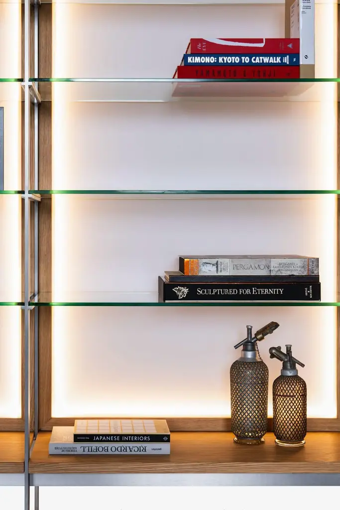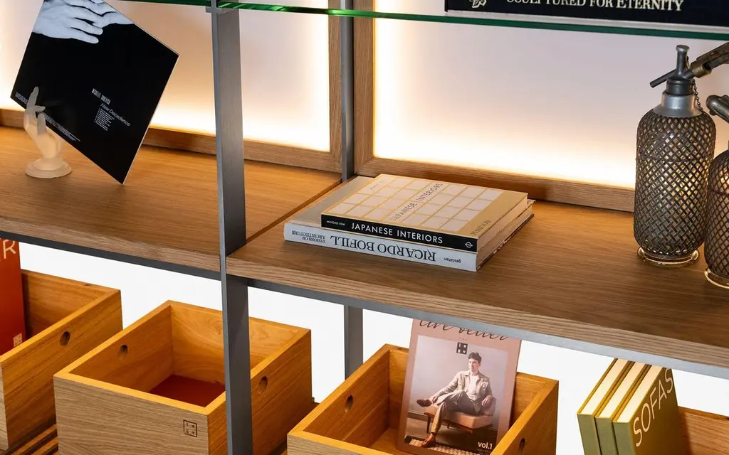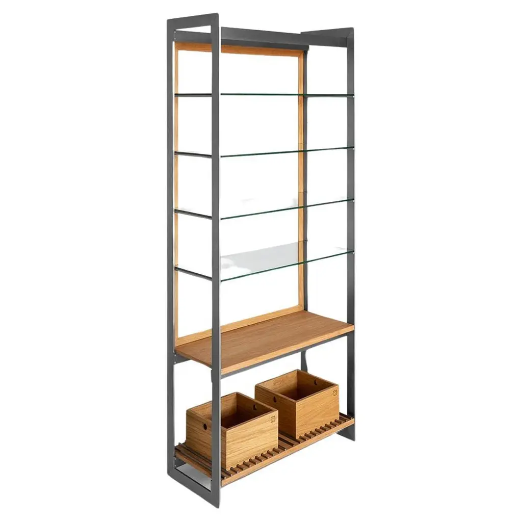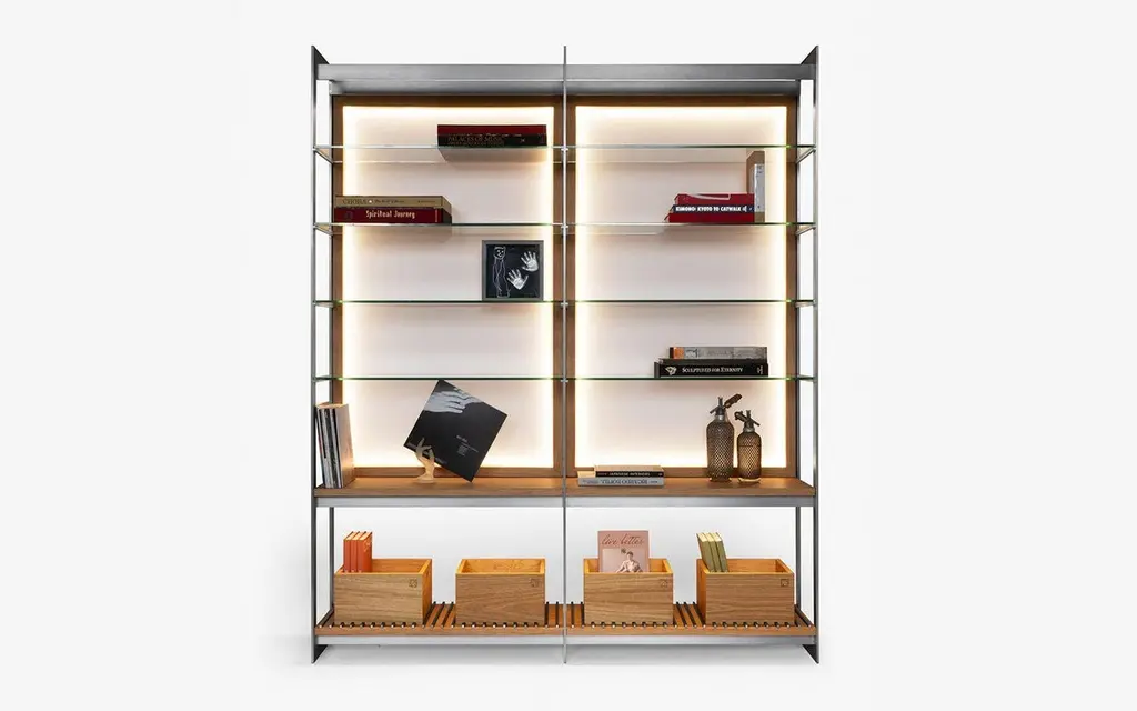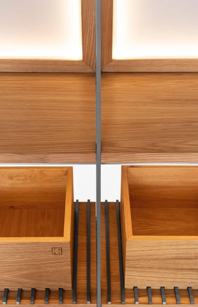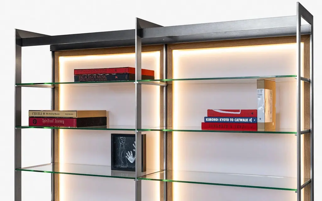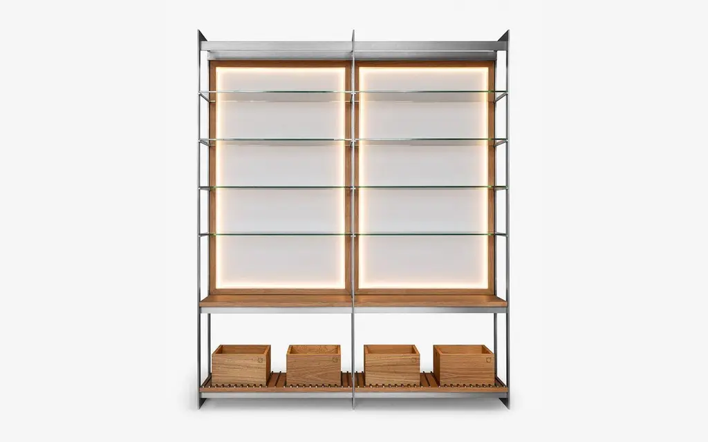 - LED illuminated back panel- Natural oak veneer shelves- Natural oak veneer removable storage cases- Robust metal frame