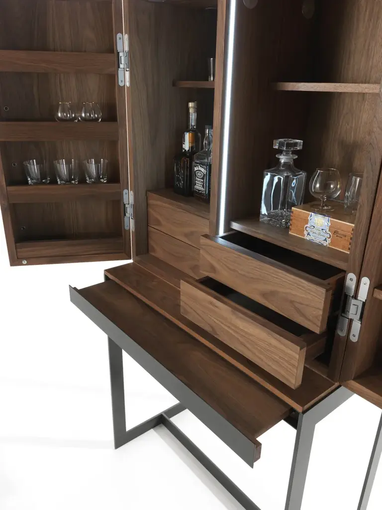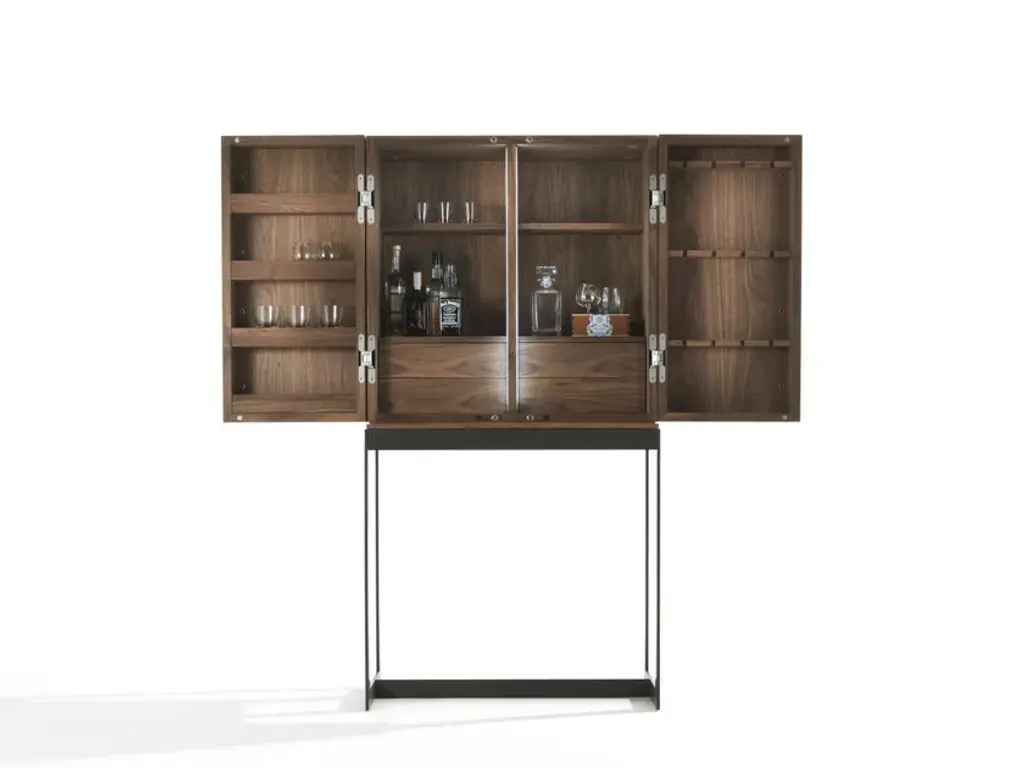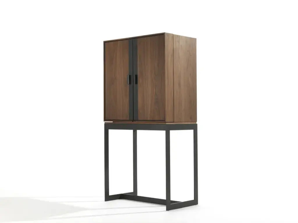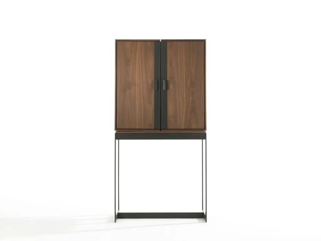 Cambusa Fly is a multifunctional storage unit in blockboard with double doors and drawers in solid wood assembled with dovetail joints, characterized by a structure in iron. The unit and the interior accessories are designed to meet storage and functional needs: depending on the version (RESERVE, STORAGE or VANITY) it is conceived to organize wine and spirit bottles and cigars, dishes and glasses or cosmetics, perfumes, jewels and various accessories. The doors are also conceived as containers and between the unit and the lower structure there is a useful pull-out shelf. The inside is illuminated by LED strips along the inner side or in the top, activated automatically via sensors when the doors are opened.Standard version: iron handle, profile and base lacquered irondust colour (b2); drawers and pull-out shelves with push-pull system, on metal runnerAVAILABLE FINISHES:A1: walnut without knots, walnut with knotsA2: oak without knots, oak with knots, cherryA4: oak without knots pigmented: milk white, total blackoak with knots pigmented: milk white, total blackN.B.: pigmented surfaces on outside only, inside oakAVAILABLE FINISHES - IRON HANDLES, BAND AND BASE:B2: lacquered iron: irondust, RAL (selected colours only)B3: matt brushed lacquered iron: antique bronze, steel, titaniumAVAILABLE FINISHES - DOORS:C: concrete: beige, grey, medium grey, black