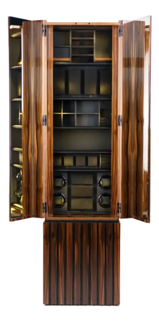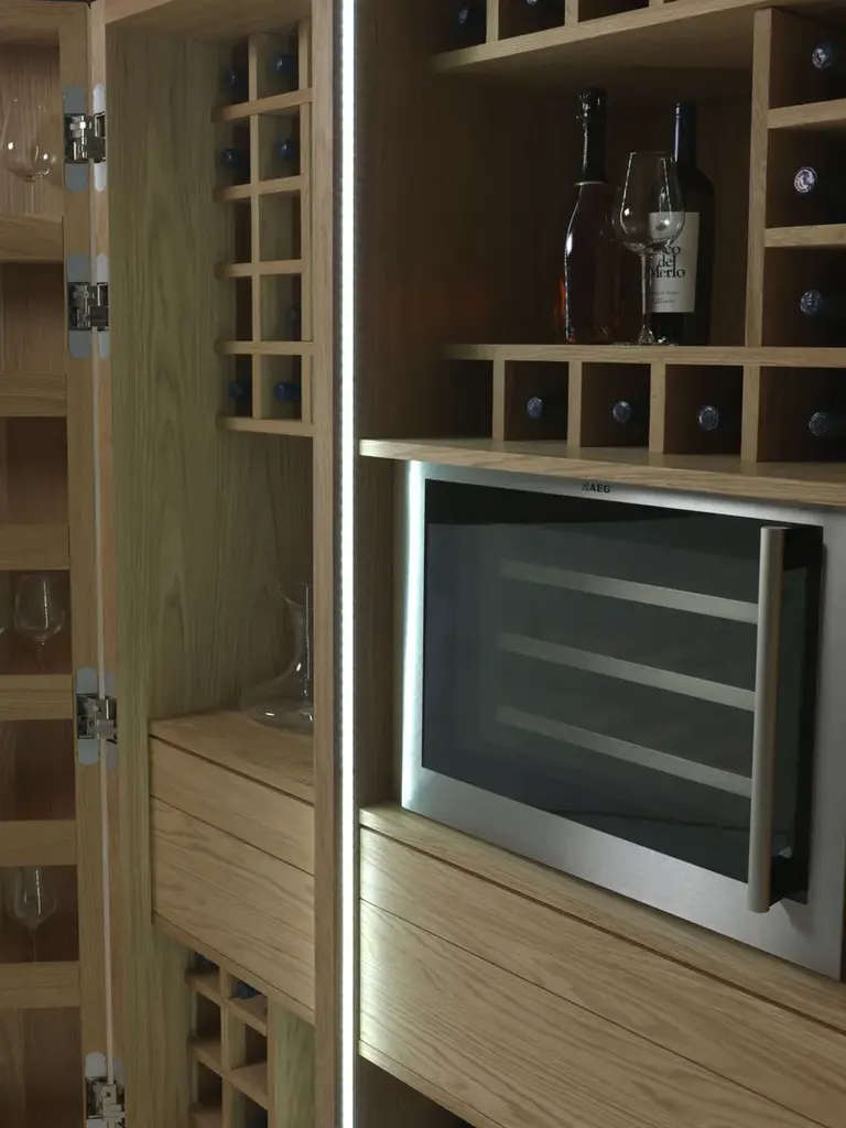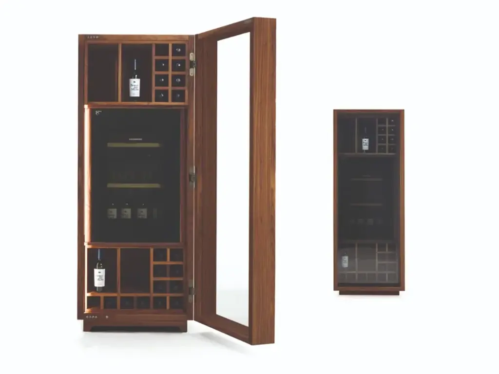 Cambusa Wine Small/Jumbo is a multifunctional storage unit in blockboard and solid wood, with single door opening to 180°. Designed as a wine-storage unit, inside there are grids and containers for bottles and glasses, with the possibility to insert small electrical appliances (Jumbo version). The door's inner structure allows to organise glasses and accessories. The inside is illuminated by a LED strip along the outer side, activated automatically via sensors when the door is opened.FOR JUMBO VERSION (with the possibility to insert small electrical appliances such as fridge, microwave oven, wine cellar): maximum size for built-in appliances W.56 D.55 H.45 cm, but the space can also be customized. STANDARD VERSION: IRON HANDLE AND PROFILE LACQUERED IRONDUST COLOUR (B2); DRAWER AND PULL-OUT SHELF WITH PUSH-PULL SYSTEM, ON METAL RUNNERSATTENTION: BEFORE ASSEMBLING THE DOOR IT IS COMPULSORY TO FIX THE CABINET TO THE WALLAVAILABLE FINISHES:A1: walnut without knots, walnut with knotsA2: oak without knots, oak with knots, cherryA4: oak without knots pigmented: milk white, total blackoak with knots pigmented: milk white, total blackN.B.: pigmented surfaces only outside, oak insideAVAILABLE FINISHES - IRON HANDLE AND BAND:B2: lacquered iron: irondust, RAL (selected colours only)B3: matt brushed-effect lacquered iron: antique bronze, steel, titaniumAVAILABLE FINISHES - DOORS:C: concrete: beige, grey, medium grey, black