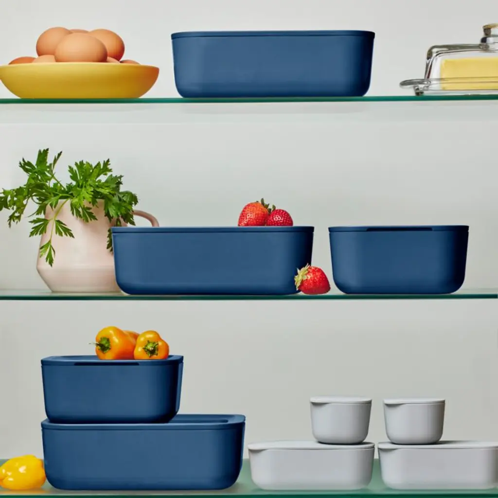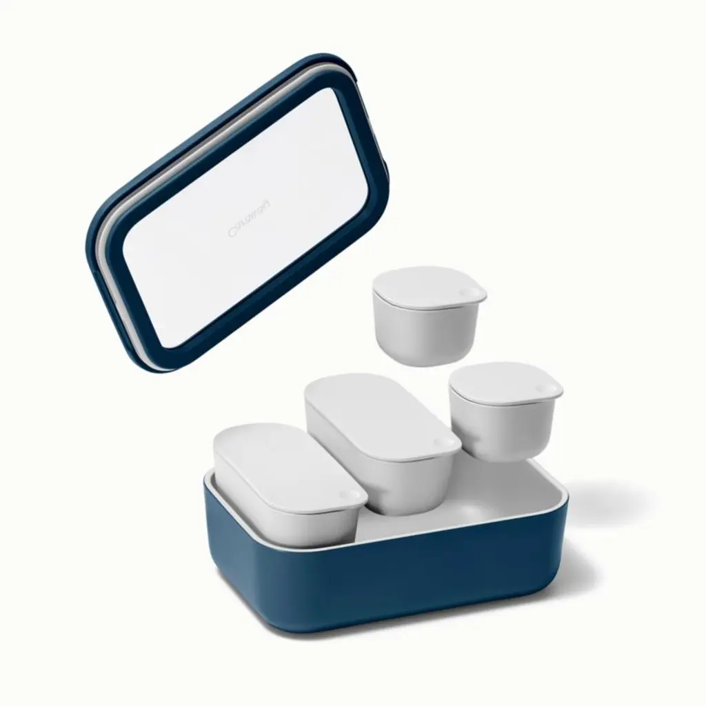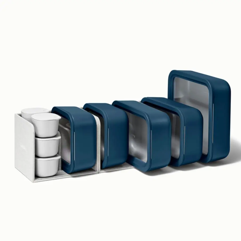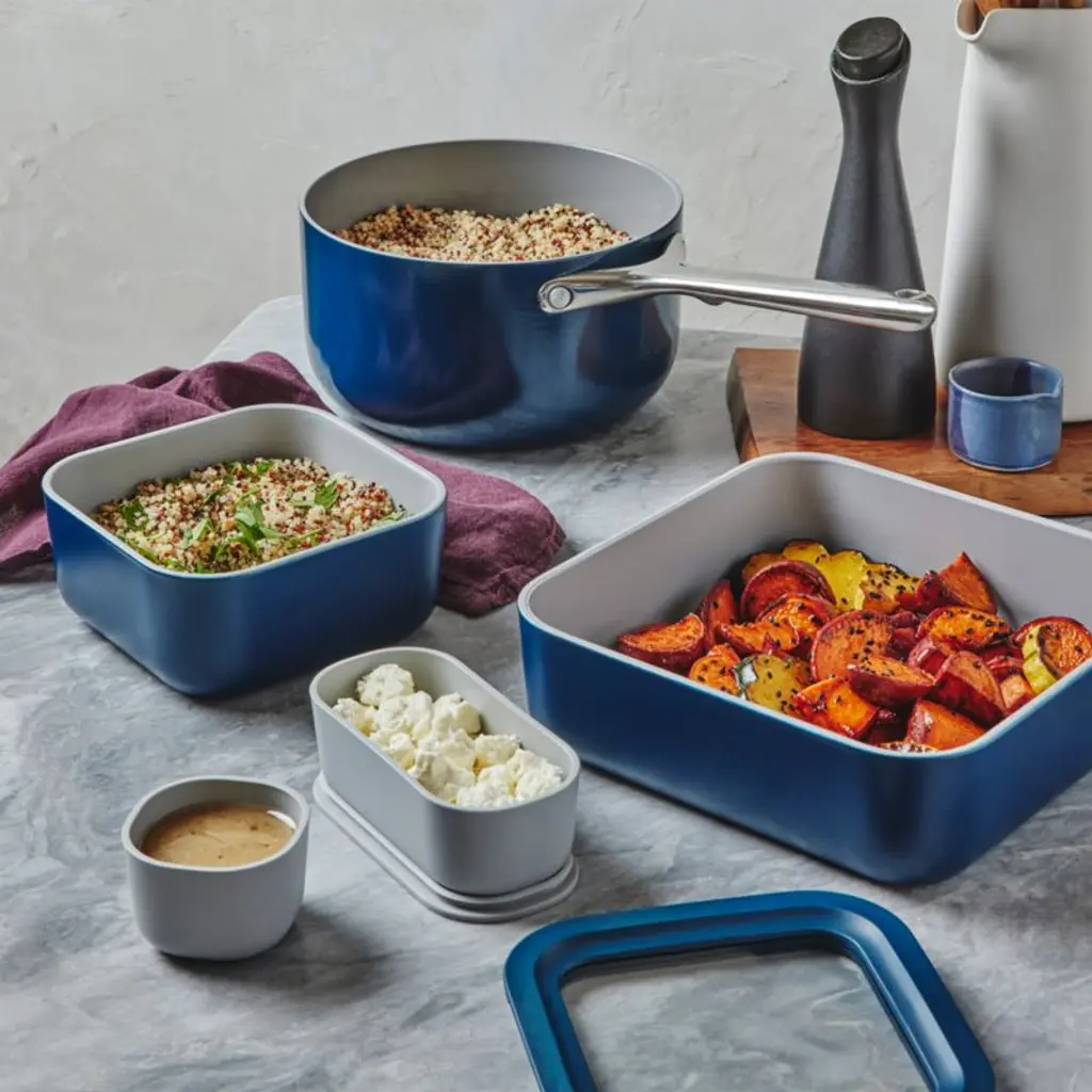 Caraway Home brings its signature beautiful and modern minimalism to food storage with this 17-piece set. Crafted of navy ceramic-coated glass, five containers beautify leftovers, lunches and more while going from freezer or fridge to microwave or oven. Glass lids with matching blue rims and silicone gaskets provide an airtight seal to keep contents fresh. This set also includes four lidded ramekins ideal for snacks and salad toppings as well as two silicone straps and three fabric-wrapped storage units to keep all the components attractively organized.
