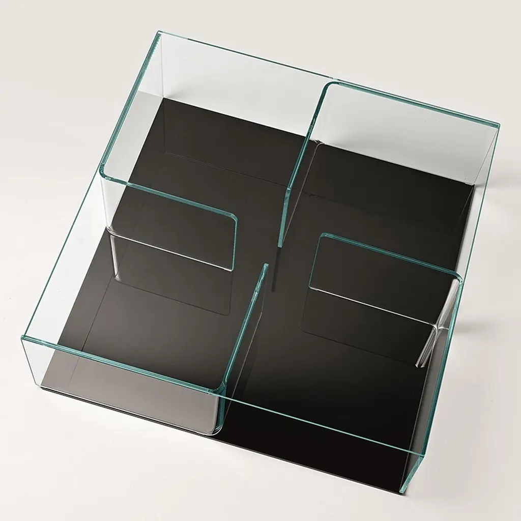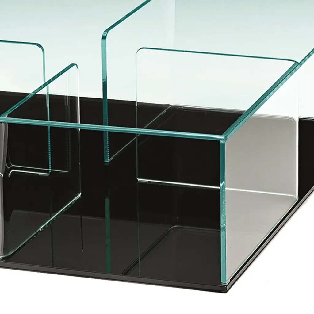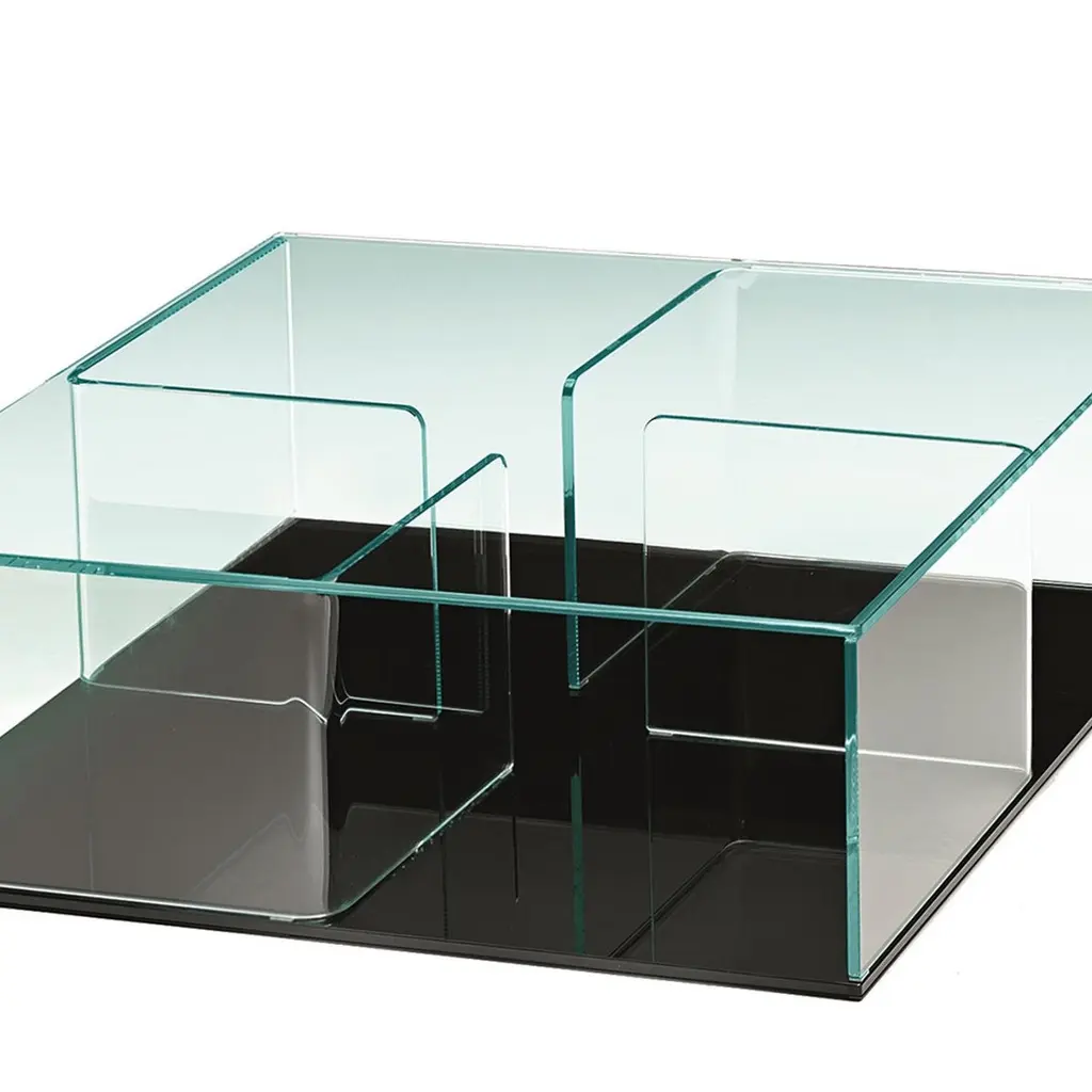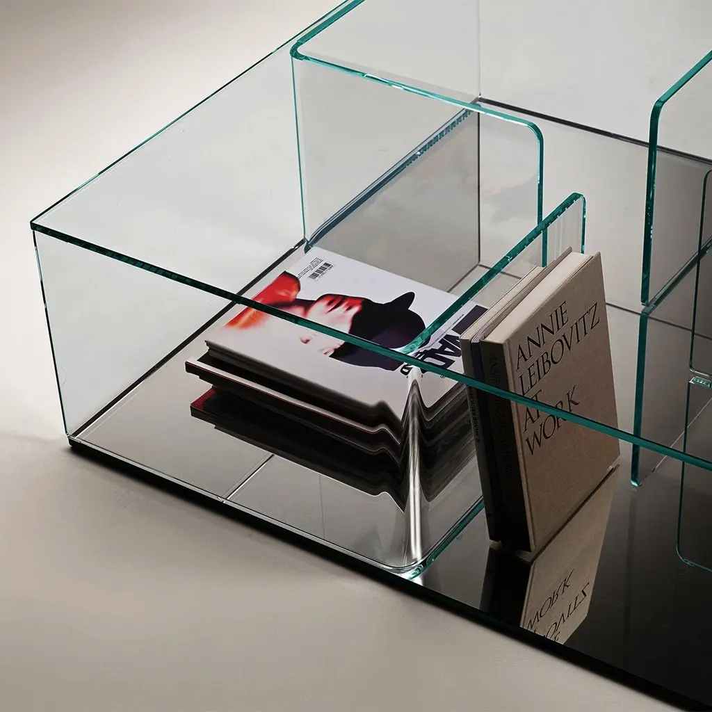Case Coffee Table with structure and base in curved glass. With storage units made of 4 elements in curved glass, 10 mmthickness included between 2 glass racks, 10mm thickness.Sides and top in glass extralight, base in back-painted extralight glass. L120xD120xH30cm, price; 3850,00€Also available in: L90xD90xH30cm, price: 2850,00€.L160xD80xH34cm, price: 3950,00€.Also available with base in white-painted extralight glass.