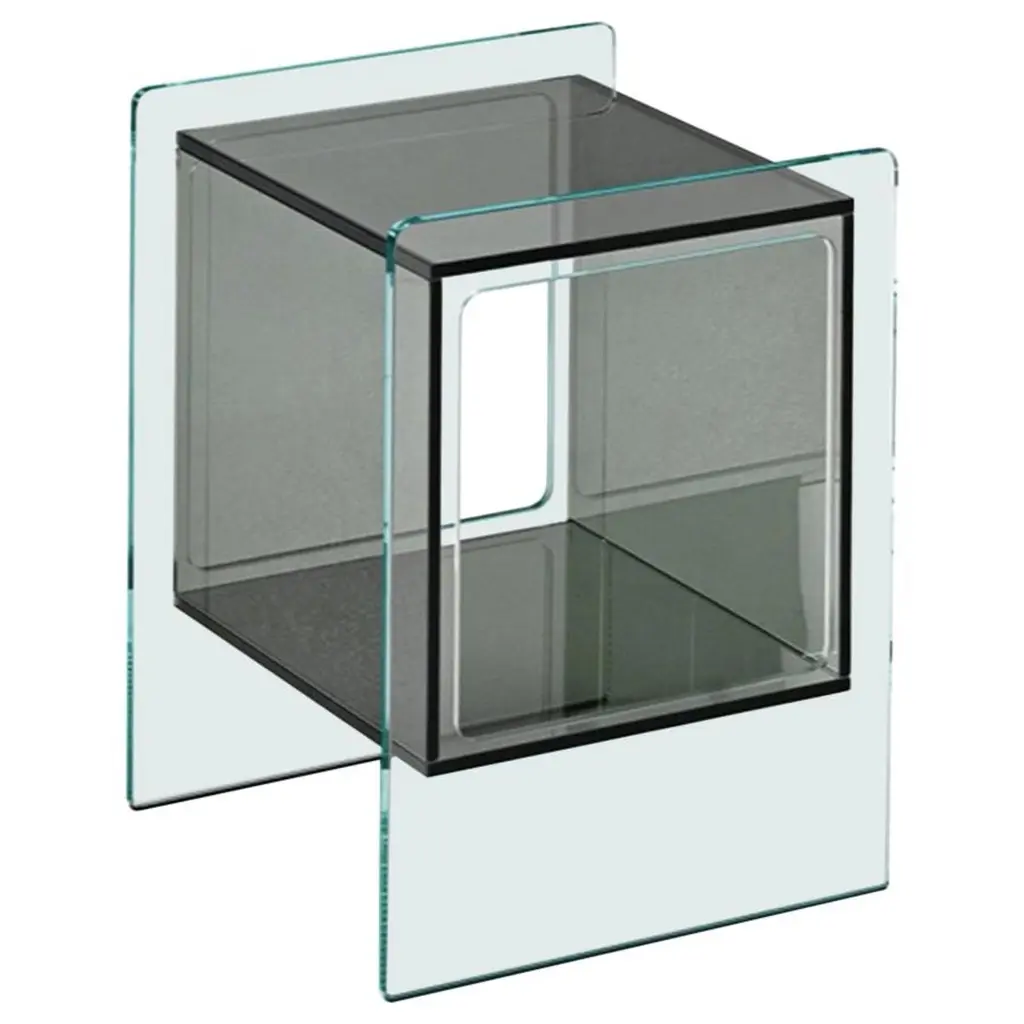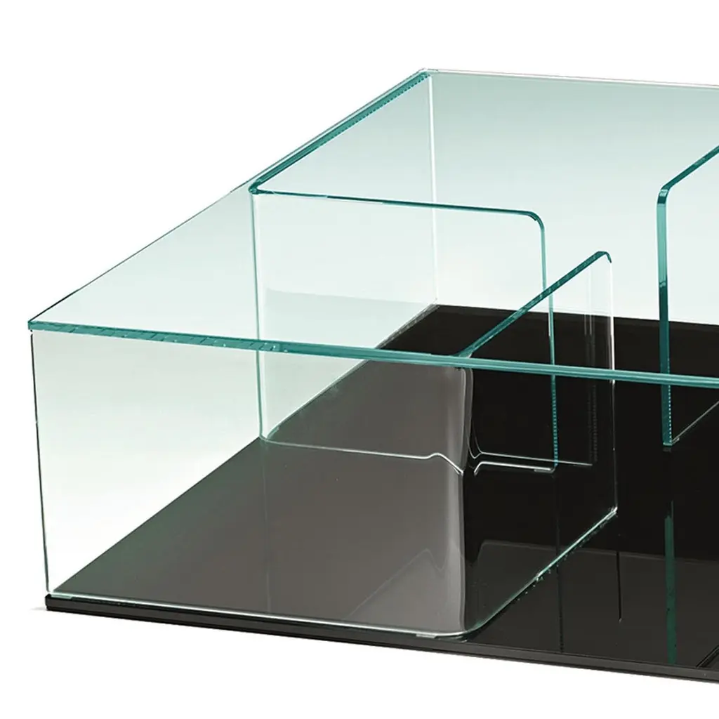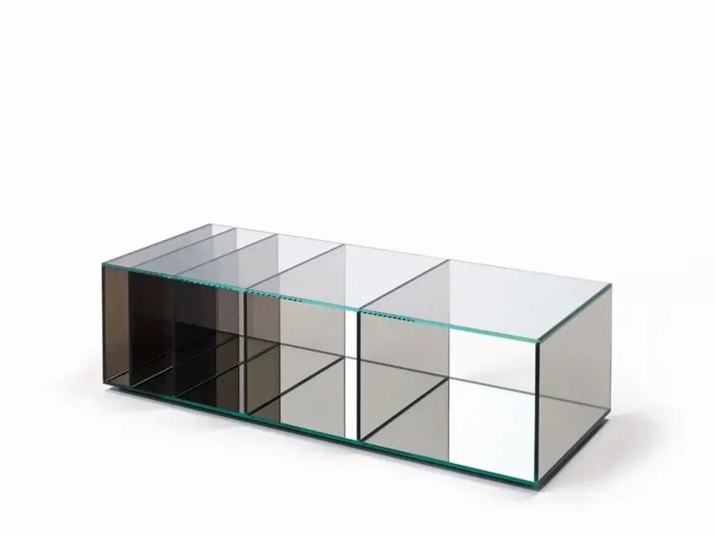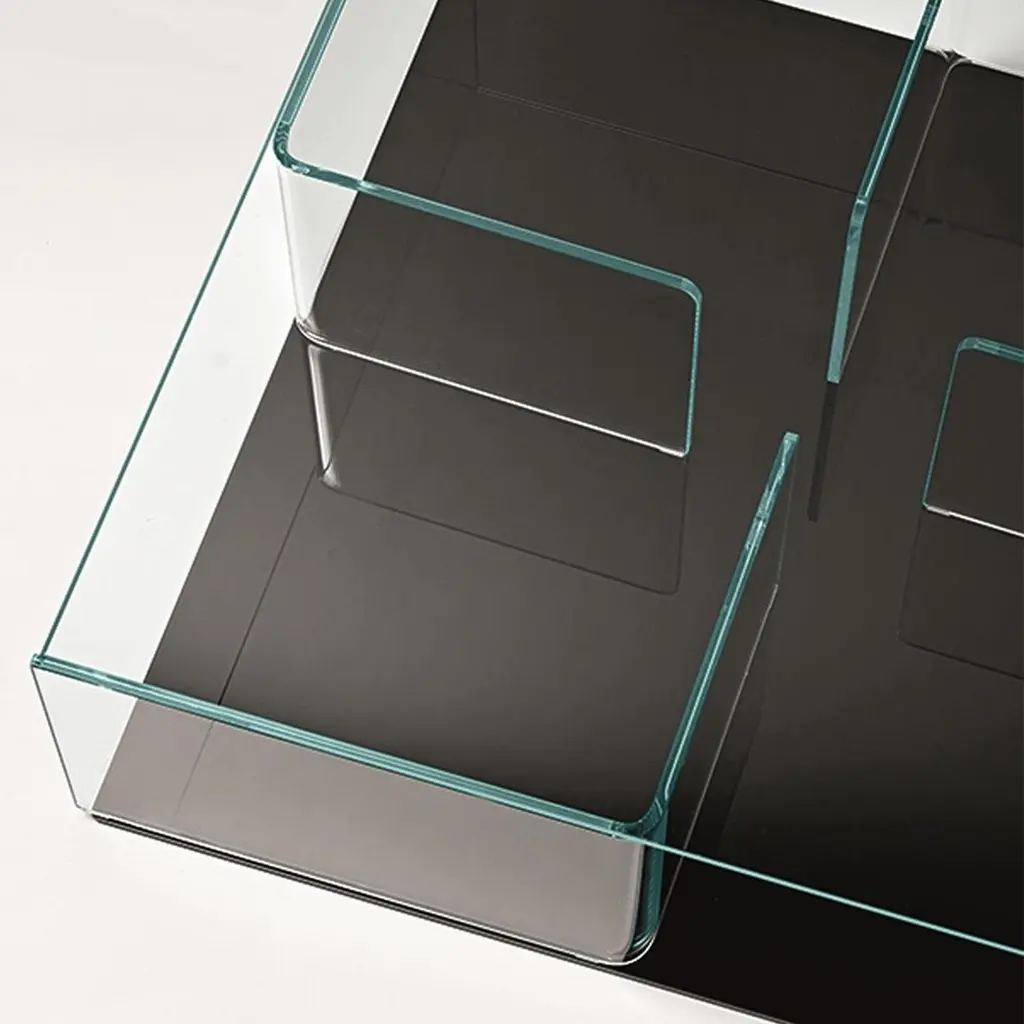 Case Coffee Table with structure and base in curved glass. With storage units made of 4 elements in curved glass, 10 mmthickness included between 2 glass racks, 10mm thickness.Sides and top in glass extralight, base in back-painted extralight glass. L120xD120xH30cm, price; 3850,00€Also available in: L90xD90xH30cm, price: 2850,00€.L160xD80xH34cm, price: 3950,00€.Also available with base in white-painted extralight glass.