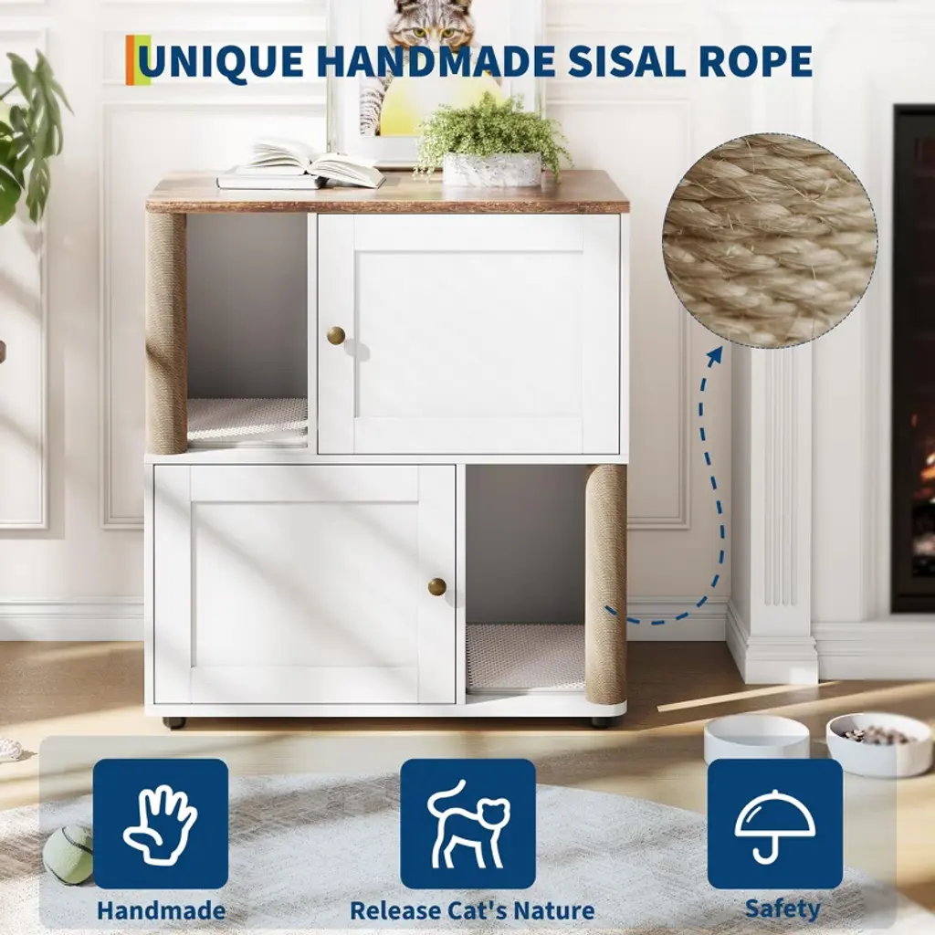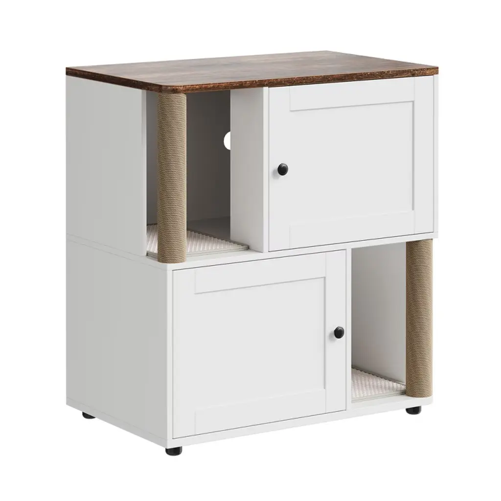 1.Multi-Use Furniture Blending Style and Function?This sleek white double litter box cabinet is more than just a cat washroom¡ªit doubles as a TV stand, buffet table, or decorative storage unit, seamlessly integrating into living rooms, bedrooms, or hallways. Its elegant design adds a touch of sophistication to any space, making it perfect for small homes or multi-purpose rooms where functionality and aesthetics matter equally.? 2.Dual Litter Space for Multi-Cat Households?Designed with an upper-and-lower layout, this enclosure efficiently saves floor space while comfortably holding two litter boxes (each up to 19.7" x 18"). It gives each cat a private, dedicated area to use the litter box, reducing competition and ensuring a stress-free environment for your feline friends.? 3.Built-In Scratching Posts for Healthy Play?Included are two scratching posts of different heights, providing cats with a natural way to sharpen their claws, stretch, and play. These posts cater to both kittens and adult cats, turning the enclosure into a versatile spot for both bathroom needs and playful activity, keeping your furniture safe from scratches.? 4.Cleaner Home with Reduced Litter Tracking?Double-layer litter mats at the entrance and exit trap scattered litter, significantly reducing mess on your floors. The enclosed cabinet hides the litter boxes from view, keeping your home looking tidy and organized while offering cats a discreet, cozy bathroom space where they can feel secure.? 5.Durable Construction for Easy Maintenance?The spacious tabletop is waterproof and scratch-resistant, making it simple to wipe clean of spills or dust. Back ventilation holes promote airflow, helping to minimize odors and keep the interior fresh. With a smooth wooden surface, this enclosure is designed for hassle-free upkeep, ideal for busy pet owners seeking both durability and convenience.?