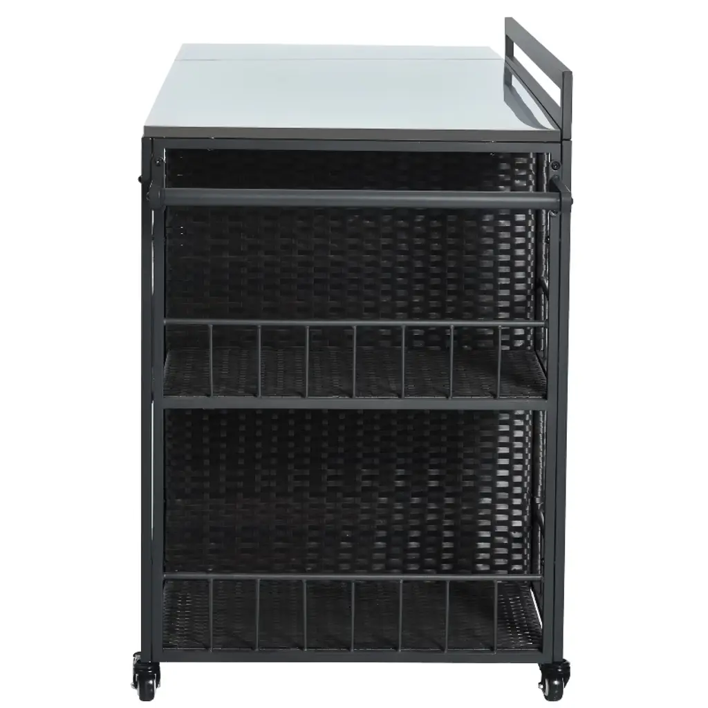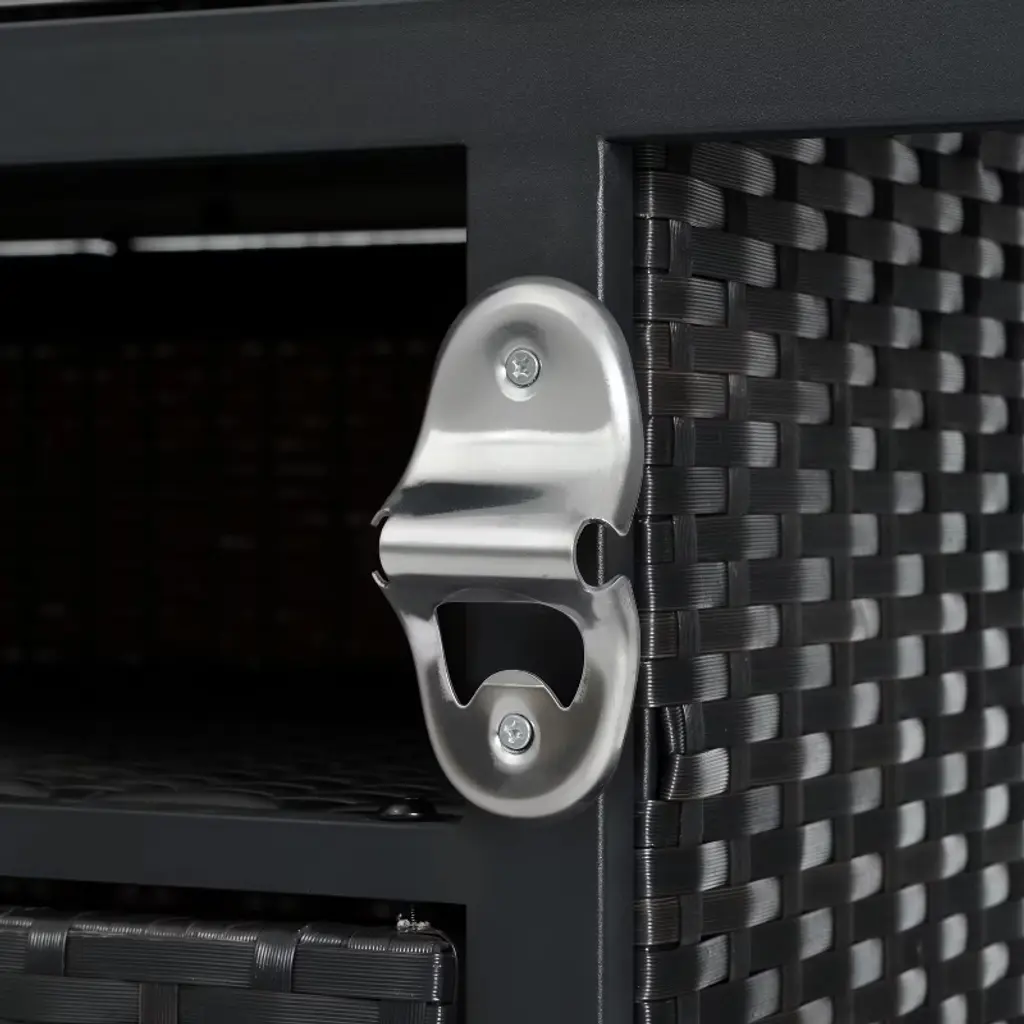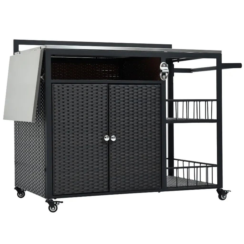 This Multifunctional Outdoor Serving Cart is perfect for entertaining, serving as a mobile bar, buffet station, or storage unit. Built with a sturdy iron frame and weather-resistant PE rattan, it features a foldable stainless steel tabletop, multiple storage compartments, and a built-in bottle opener for added convenience. Lockable caster wheels ensure stability, while a versatile side rack doubles as a towel holder and handle. Designed for durability, this cart is a stylish and practical addition to any outdoor space.