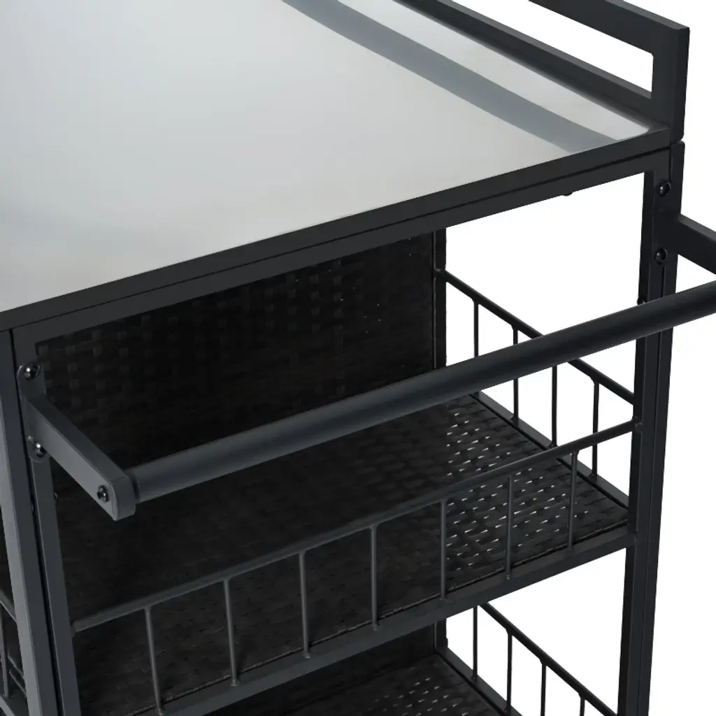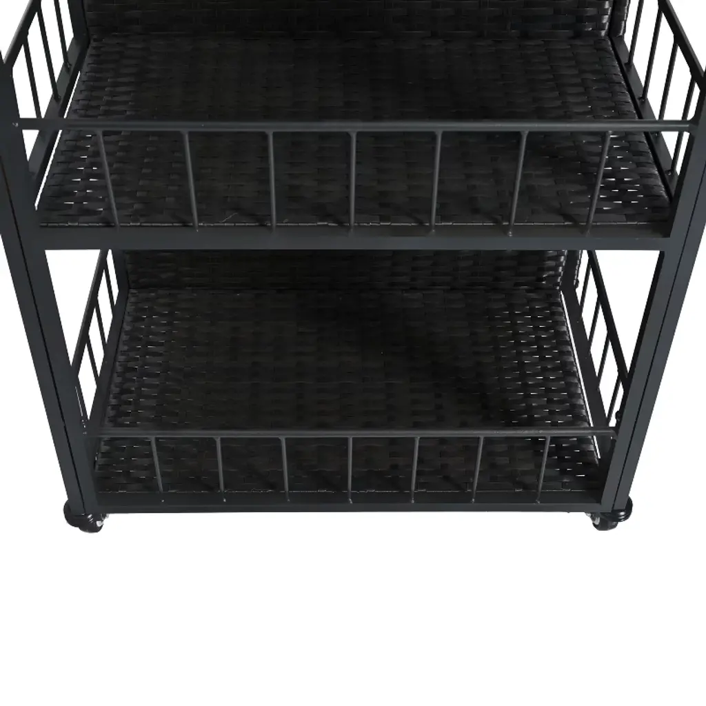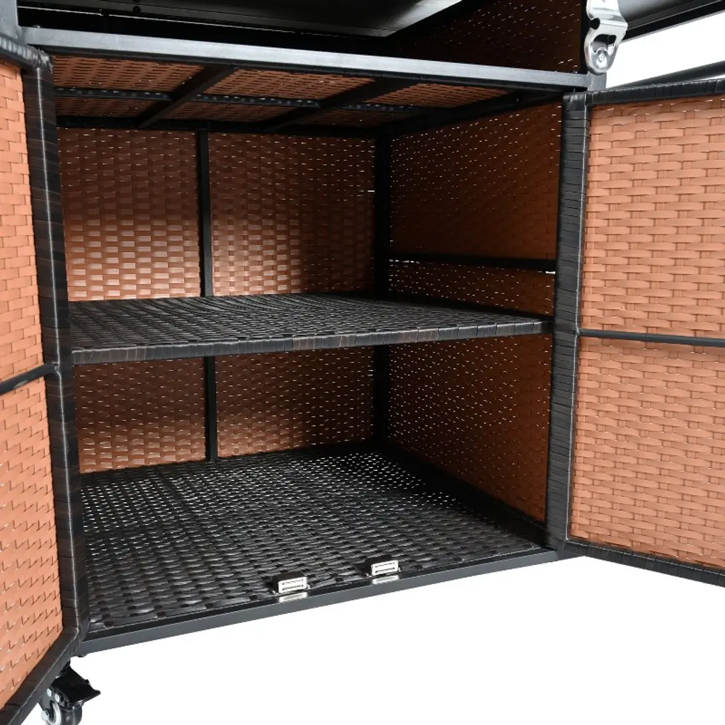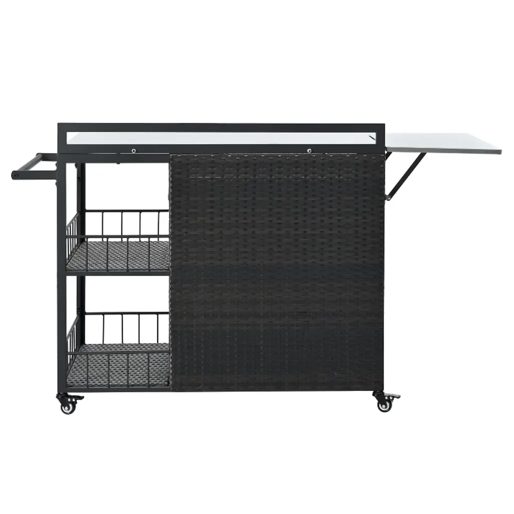 This Multifunctional Outdoor Serving Cart is perfect for entertaining, serving as a mobile bar, buffet station, or storage unit. Built with a sturdy iron frame and weather-resistant PE rattan, it features a foldable stainless steel tabletop, multiple storage compartments, and a built-in bottle opener for added convenience. Lockable caster wheels ensure stability, while a versatile side rack doubles as a towel holder and handle. Designed for durability, this cart is a stylish and practical addition to any outdoor space.