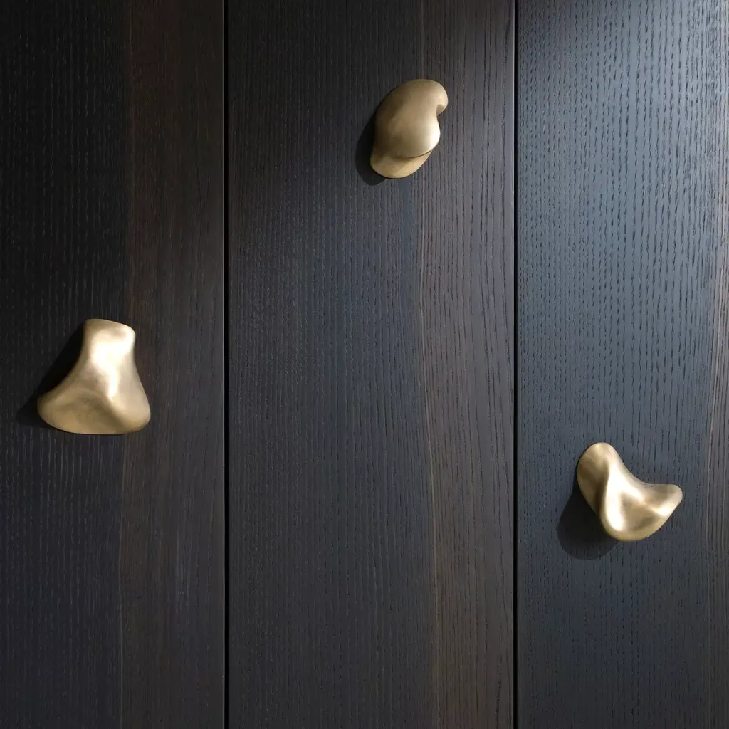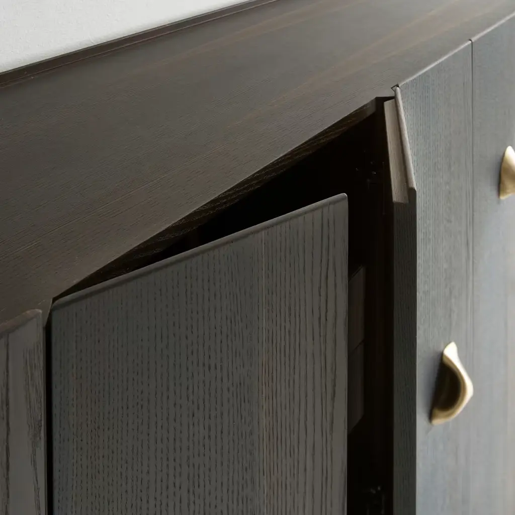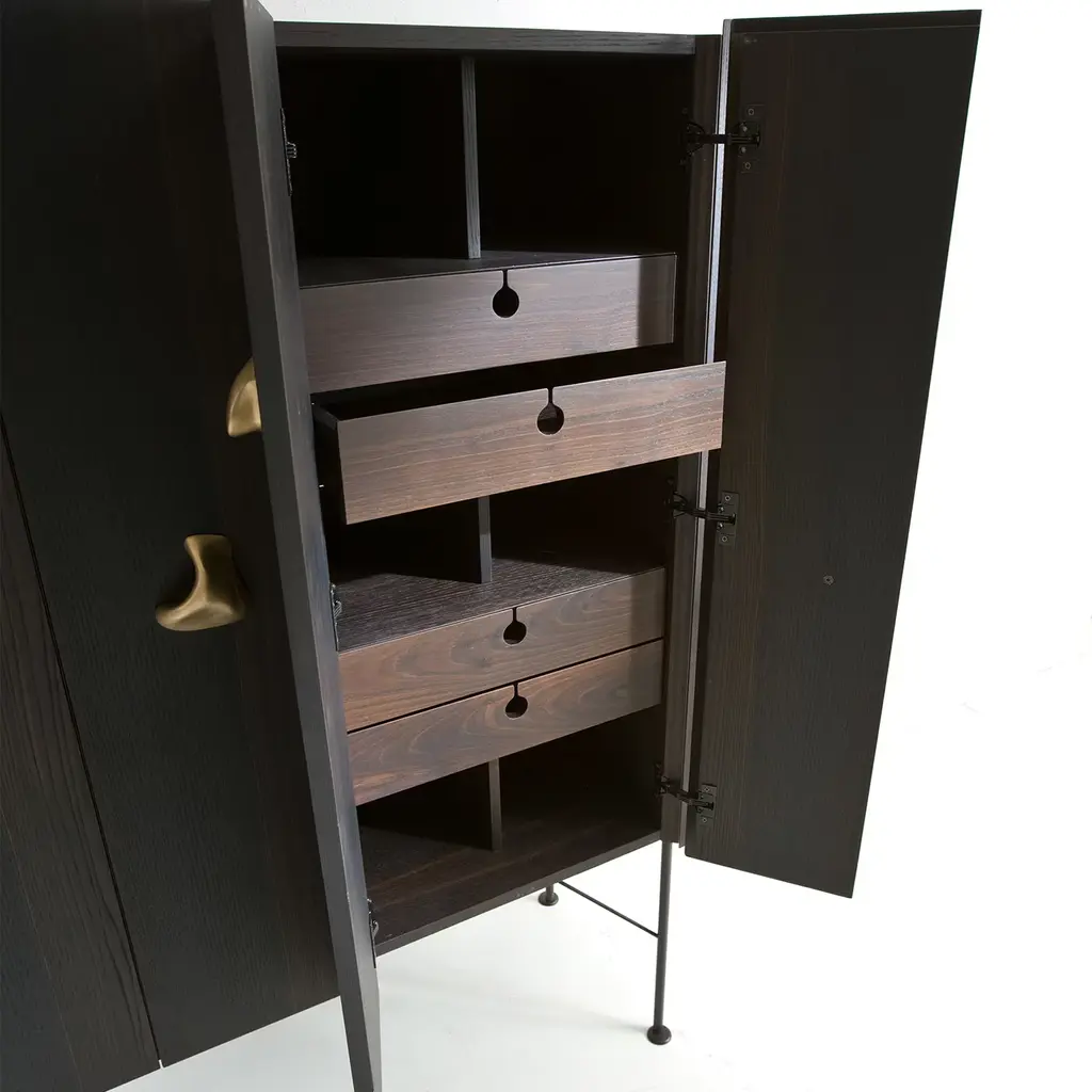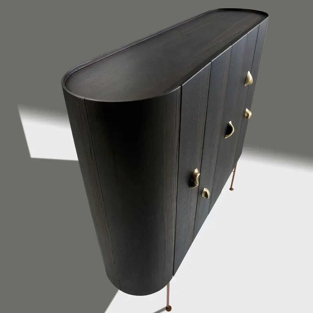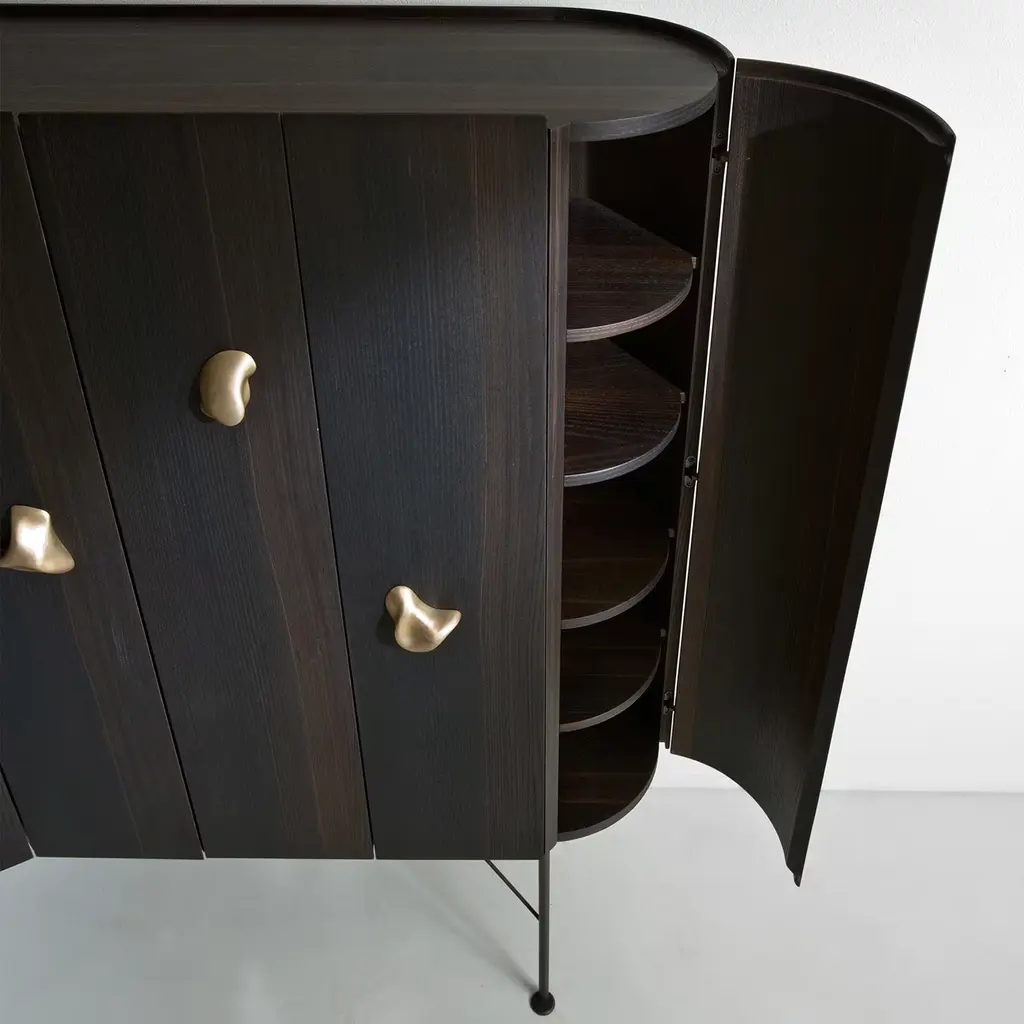 Brimming with an exclusive personality, this dresser is crafted using Siberian ash that can be admired in its entire storage unit with curved sides. Raised on satin brass legs, eight internal drawers and shelves can be accessed by pulling the slender seven door handles. The five irregular handles from the Sesel Collection in cast bronze add a delightful artistic dash to the piece. Please contact the Concierge for variants.