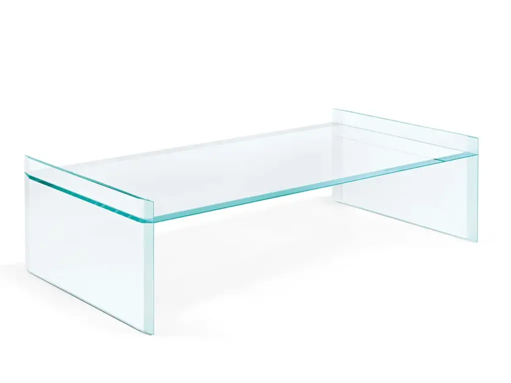 Collection of low tables, display units, display cases and storage units and sideboards with sides and top in transparent extralight 8 mm. glass.The sides are curved to fit the shape of the top, to which they are attached.The display cases-storage units are supplied with hardware in black anodized aluminium and a shelf.The bases are in solid open pore black lacquered ash and, for the low tables only, they are also available with a flush recessed mirror.The display case-storage units and the sideboards (COR03 -COR04 - COR05 – COR06) have doors, available also in silvered glass, while the low tables have two sliding front parts.With the mirror finish the hinges remain inside the furniture.