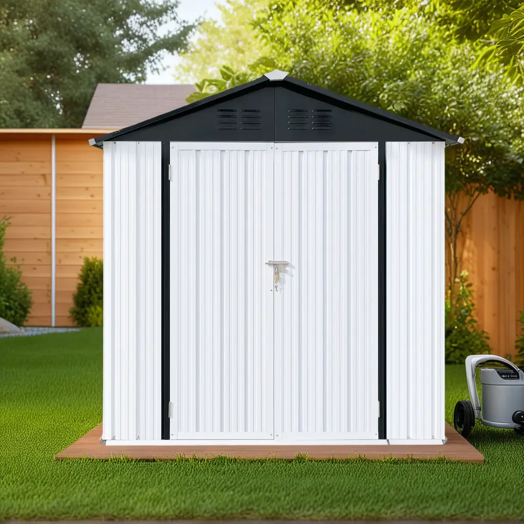 Features: [Practical Garden Storage Solution] Featuring a pent roof, this 4ft x 6ft storage shed provides impressive storage room for garden tools, equipment, and materials. [Punched Vents] Unlike typical sheds with plastic vents, this shed comes with two integrated punched vents which will not deteriorate against sunlight. [Hinged Door and Padlock] A hinged door offers more customization opportunities than a sliding door does. A heavy-duty complimentary padlock grants extra safety. [Easy to assemble] The uniquely designed aluminum frames provide not only extra sturdiness but also a smooth assembly process. No experience is needed to finish the shed.Product Features · This shed comes with two integrated punched vents which will not deteriorate against sunlight.· Featuring a pent roof, this 4ft x 6ft storage shed provides impressive storage room for garden tools, equipment, and materials.· A hinged door offers more customization opportunities than a sliding door does. A heavy-duty complimentary padlock grants extra safety.· The uniquely designed aluminum frames provide not only extra sturdiness but also a smooth assembly process.Color: Black/WhiteAssembled Length (in.): 75.60Assembled Width (in.):46.30Assembled Height (in.):67.90Weight (lbs.):88.50Notes:Assembly RequiredThis product will ship to you in multiple boxes.Disclaimers & Disclosures:Contact US:After-sales Email Address: dhalcomb@doorise.comIf the item comes with any defect, damage(include damaged in transit) or missing partsand, please contact us with detailed images for free replacement or refund.