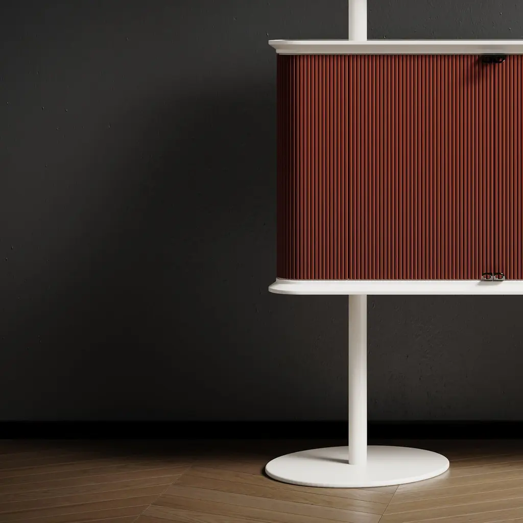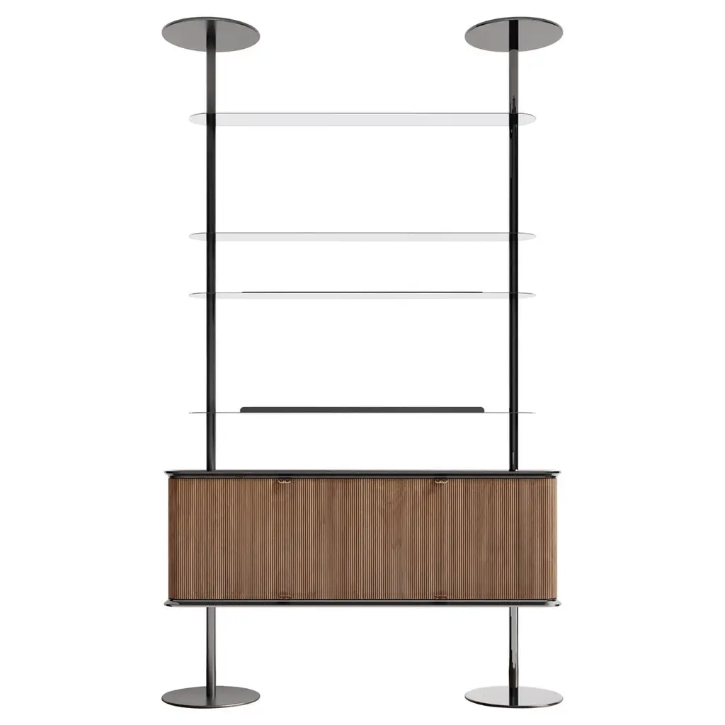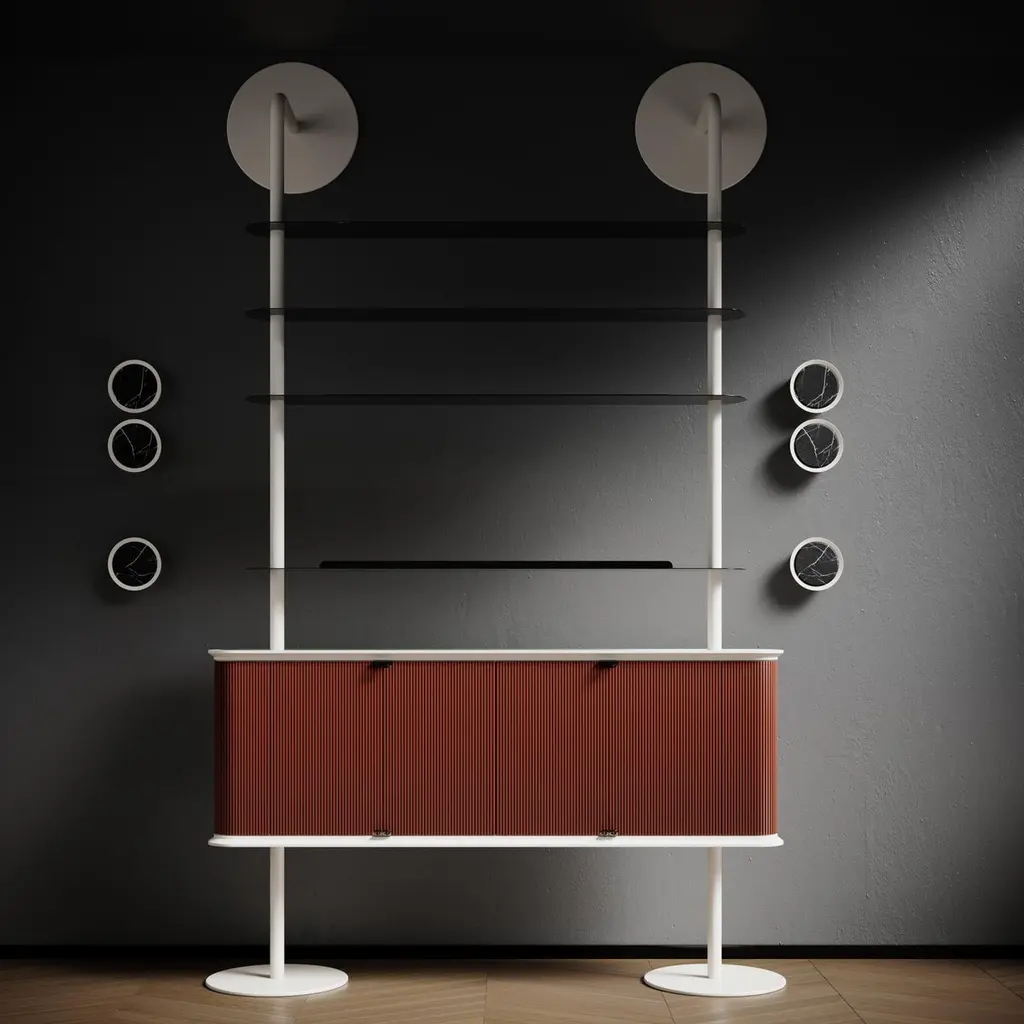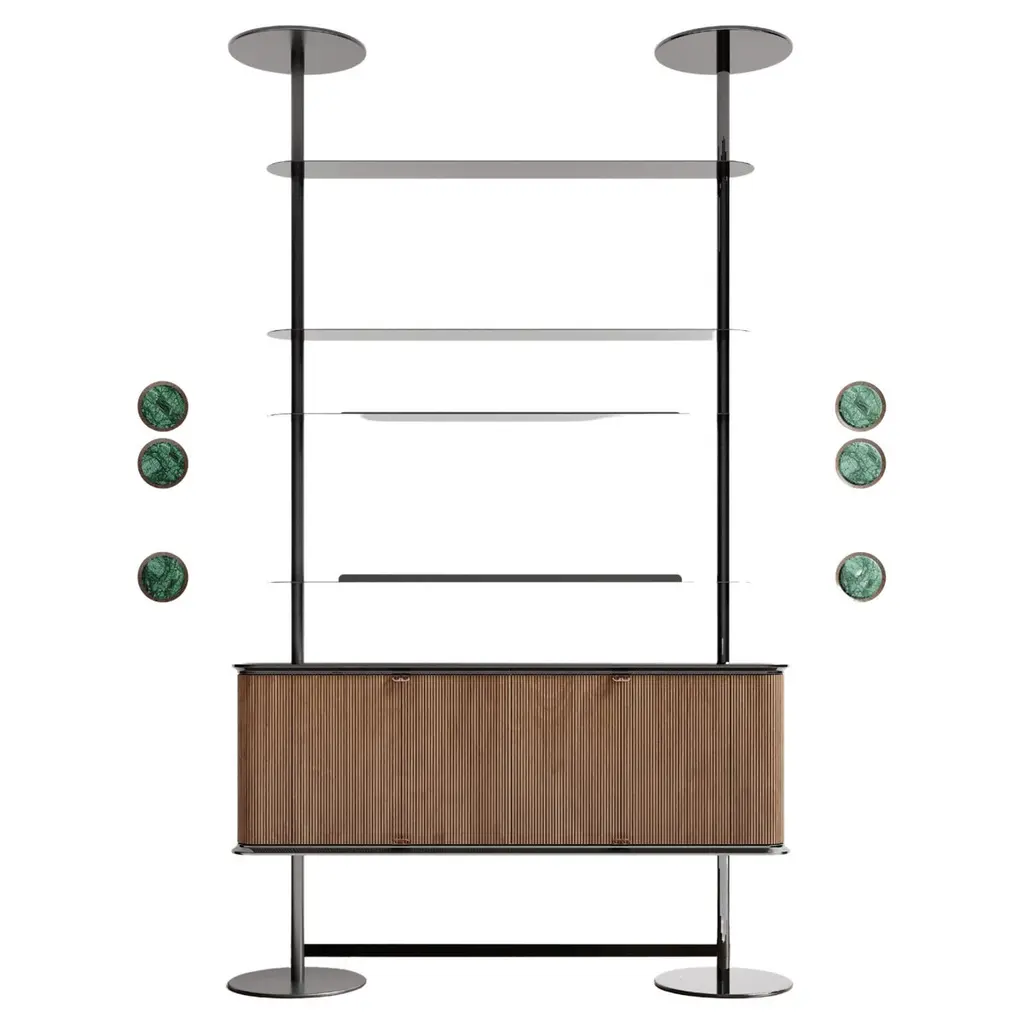 Nemesi #5 is a bookcase and self standing storage unit, designed by SAGARÍAClassic yet contemporary, essential yet extremely personal, Nemesi #5 wall unit is boldly defined by the two round painted-metal plates to serve as anchor to the wall. The verticals are rounded pipes customizable in height , while the four shelves and storage units can also be set at various heights upon request. The high can be adjusted during assembling. The Maximum high is 270cm.Edges: extra gloss canapa lacquerTop: honed Marquiña marbleFrame: powder coated metal canapa extra matteBody: extra gloss terracotta lacquer woodThe unit can be access from either side, make it suitable to be used as a room divider. Two doors on the front side and two, optional, doors on the rear side make the access easy. The rear doors are subject to quotation.Inside one wooden shelf has smoothes edges so to make a strong shelf look thin.The unit can be customized in finishes and materials, upon request.