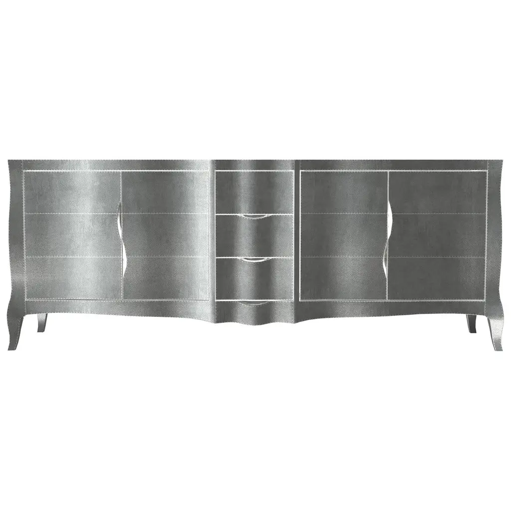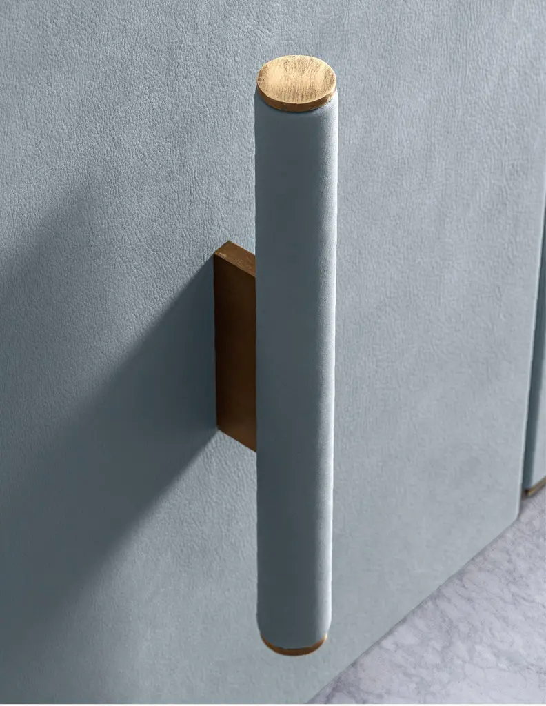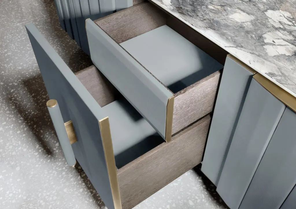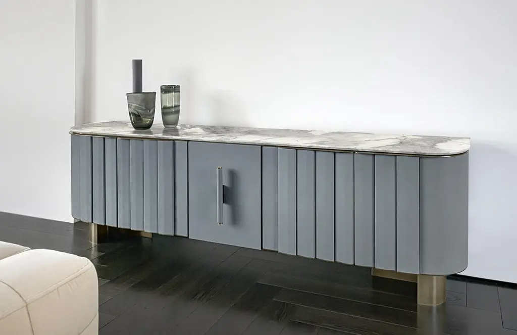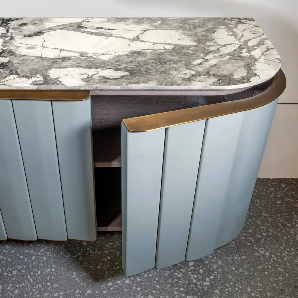 The four-doors version of Morgan storage unit represents an interesting proposal for the dining area. Its doors are shaped three-dimensionally with vertical decorative motif and upholstered in "Azure" color leather with “plissè” effect. The handle of the central door consists of a single cylindrical element placed in the center of the storage unit, while the side doors can be opened by pulling a metal plate that protrudes elegantly from the upper profile. Metal plays not only an aesthetic and functional role of door finishing, but is also present in the two elements that support the structure. Finally, "Invisible grey" marble top has lowered edge to ensure an almost suspended effect compared to the underlying metal.