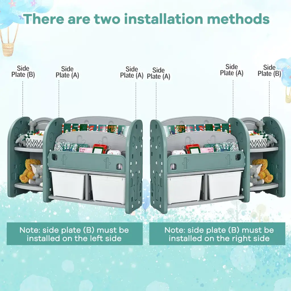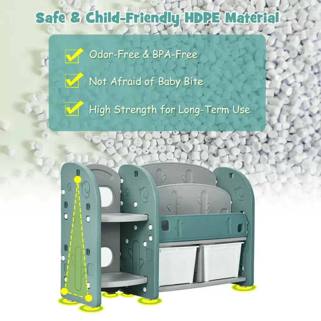 Developing good habits of organizing and reading with our toy storage organizer! It comes with 2-tier extra-large storage shelves, 2-tier wide bookshelves and 2 detachable storage bins which provides sufficient places for your little ones to put toys and books. Crafted with safe and environmental-friendly HDPE material and thickened shelves, the toy organizer can stay stable, durable and impact-resistant. The opening storage design not only makes it easy for kids to find and grab toys and books but also helps them develop habits of reading and organizing. Ideal as toddler's cabinet in the nursery, playroom, kindergarten; perfect as kid's bookcase in study, school, even works great as a storage cabinet in entry and living room.FeaturesColor: Green Material: HDPE Overall Dimensions: 46.5'' x 14'' x 30'' (L x W x H) Storage Bin Size: 13.5'' x 11'' x 9'' (L x W x H) Net Weight: 22.5 lbs Weight Capacity: 55 lbs per of storage shelf, 44 lbs per of bookshelf Suitable Age: Over 3 Years Old Package Included: 1 x Kids Toy Storage Organizer 2 x Plastic Bins 1 x Instruction