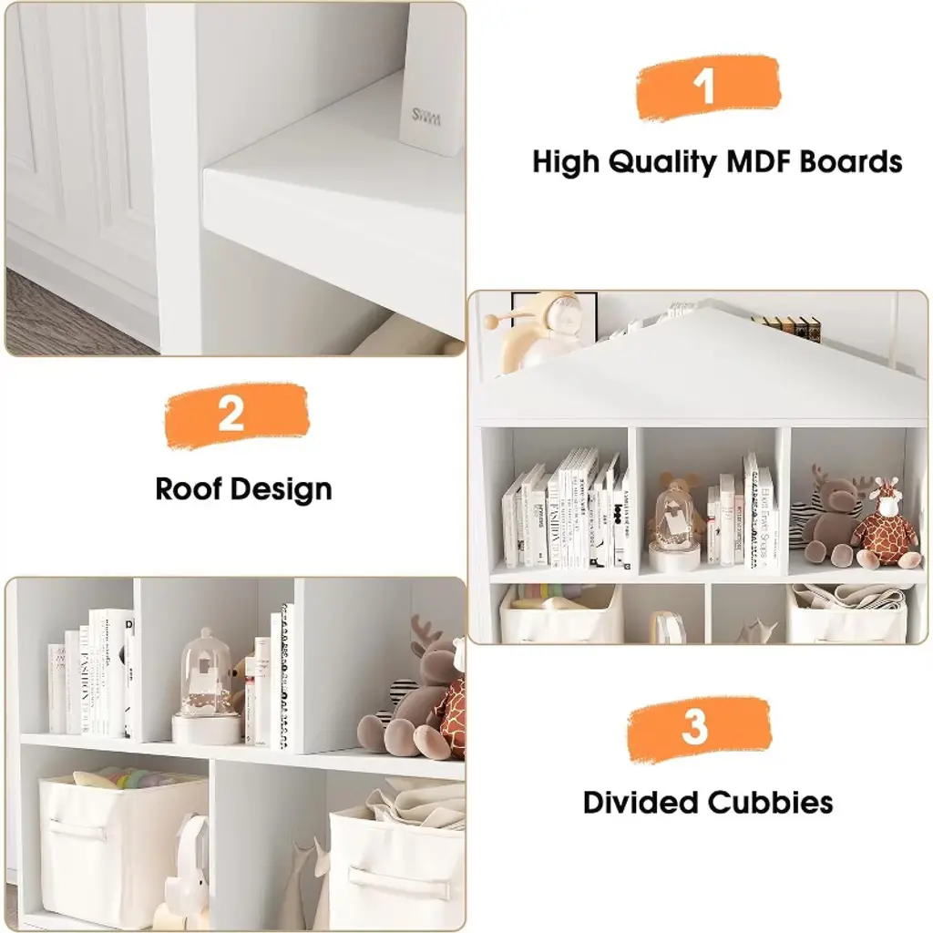 Cozony 35" Kids Bookshelf, 2-tier White Wooden Toy Storage Organizer With 5-cubby Bookcase & Modern Roof Design, Playroom, Nursery, Kids Room